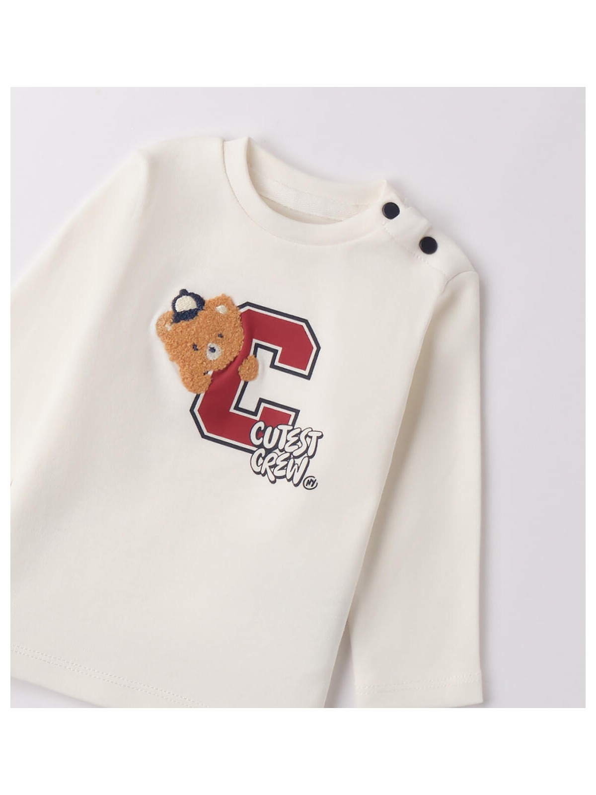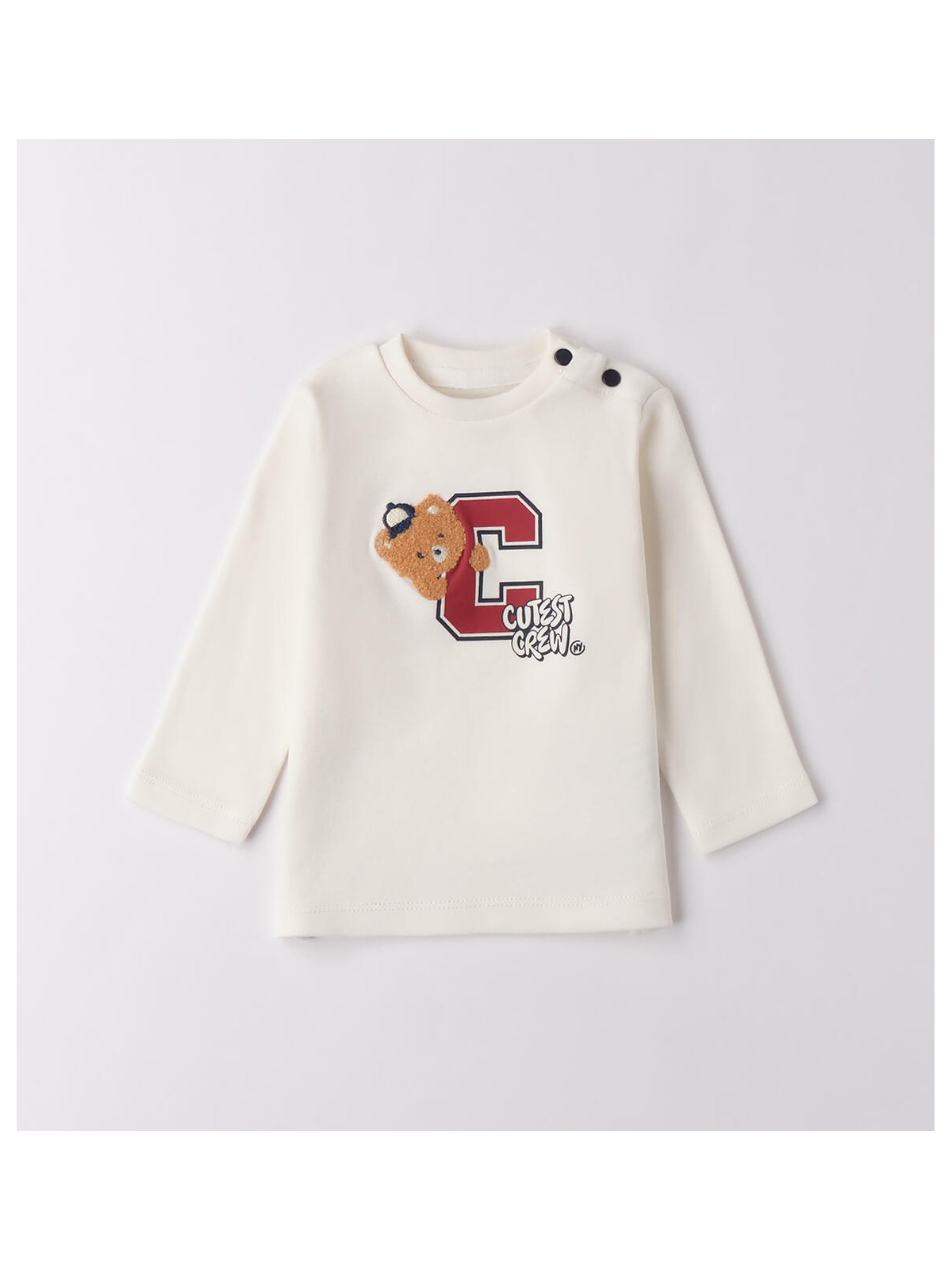 Maglietta bimbo neonato in caldo cotone. Il modello presenta apertura sulla spalla con bottoni a pressione per agevolare il cambio e la vestizione, fantasia tinta unita con stampa frontale.