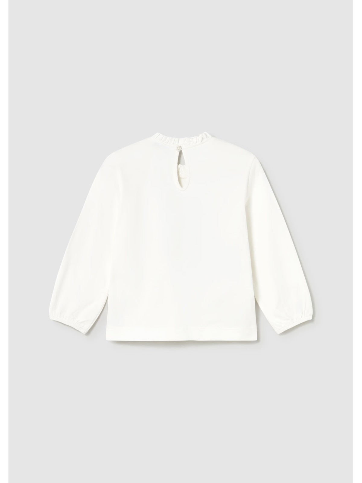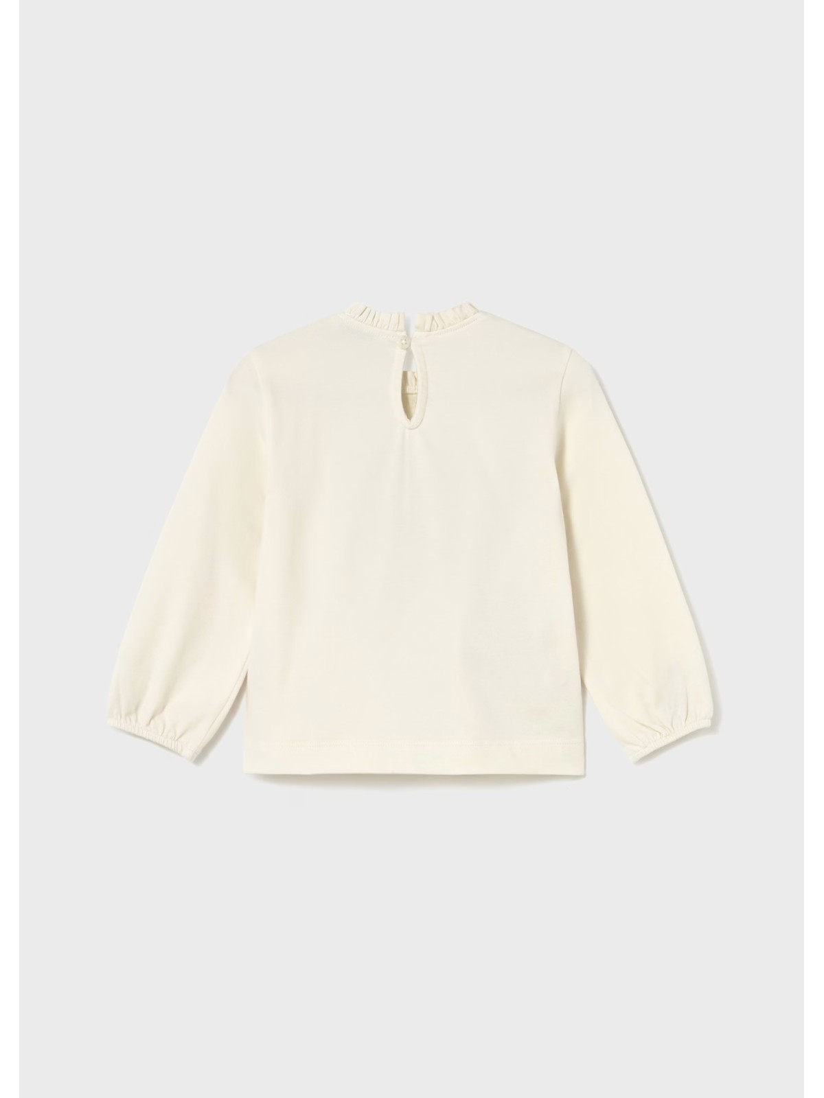Maglietta manica lunga per neonato. Girocollo con volant. Chiusura con un unico bottone. Elementi decorativi: fiocco,