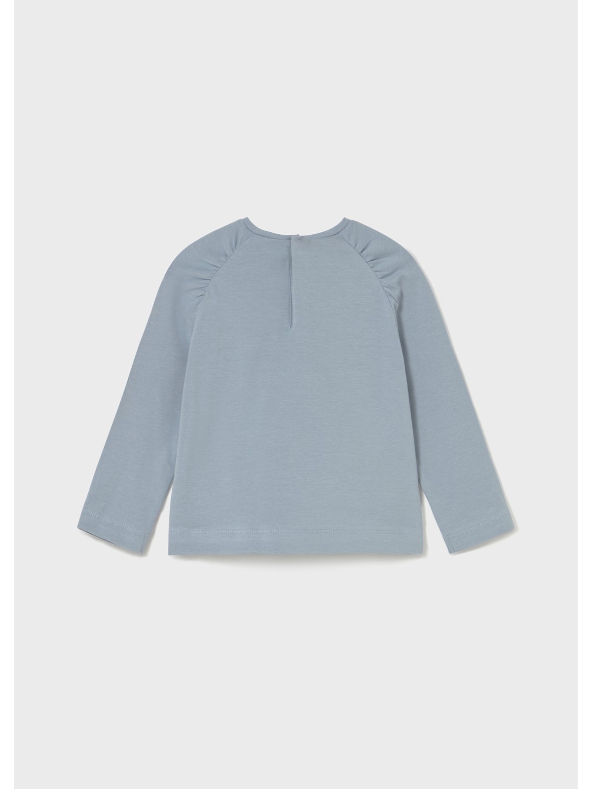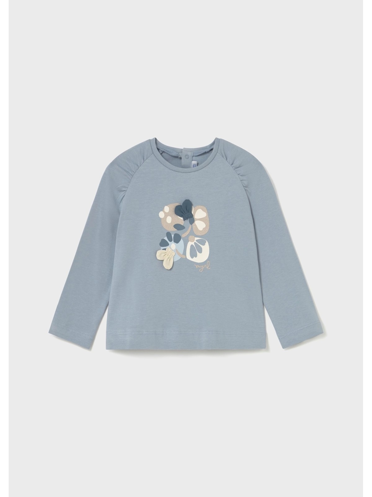 Maglietta manica lunga per neonata. Girocollo. Chiusura con bottoni a pressione nella parte posteriore. Modello con riccio. Elementi decorativi: applicazione decorativa, glitter, Serigrafia (print).