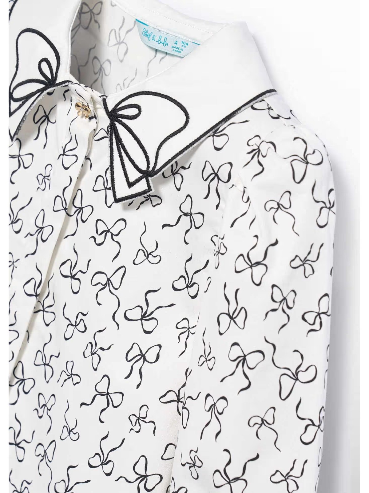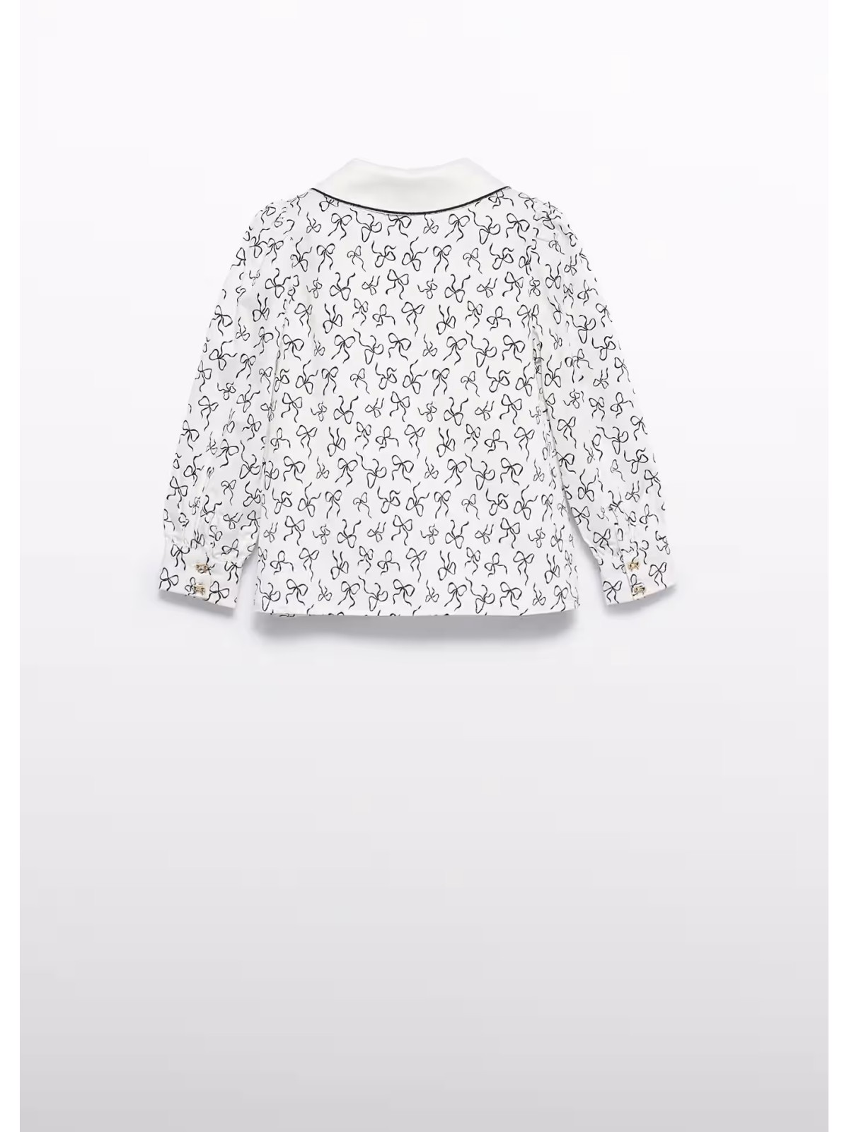 Blusa per bambina con colletto effetto fiocco. Apertura frontale con bottoni. Fantasia fiocchi.