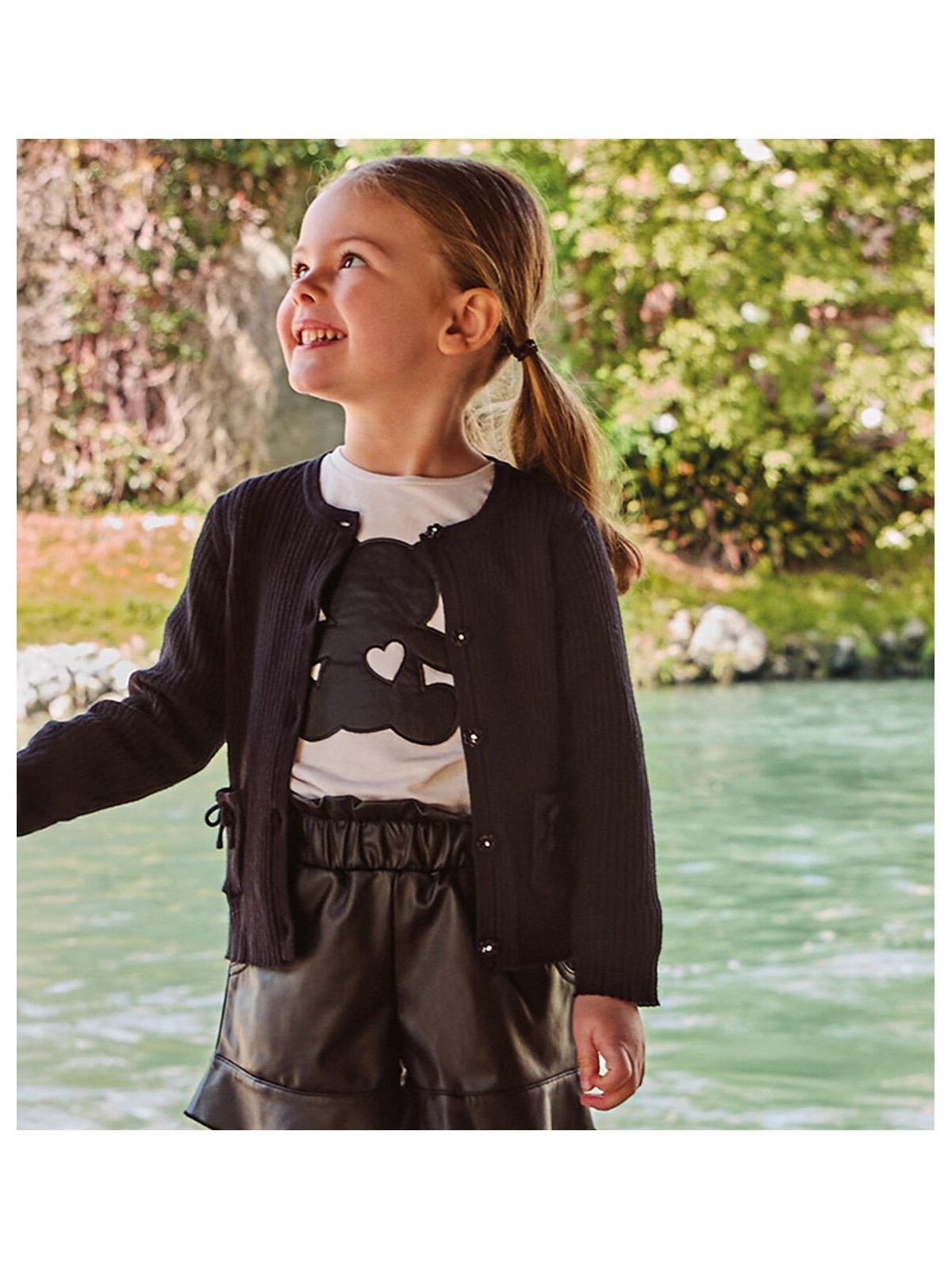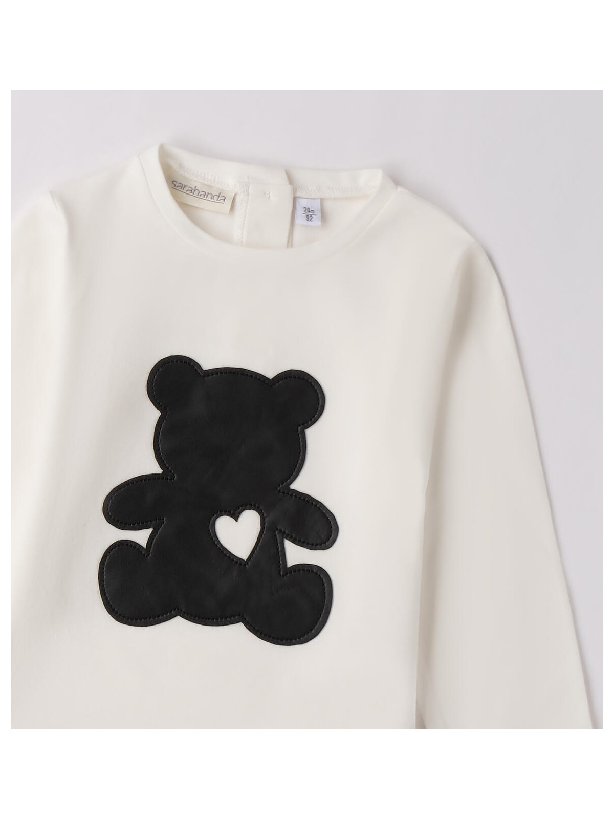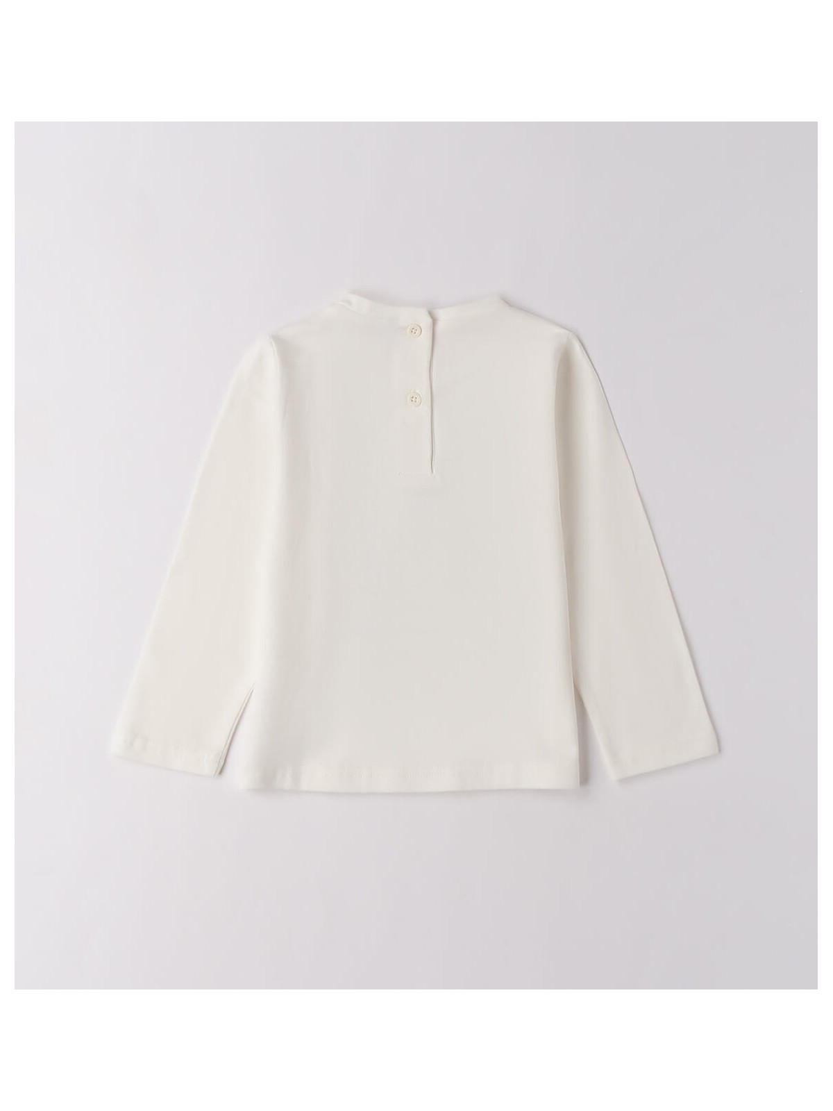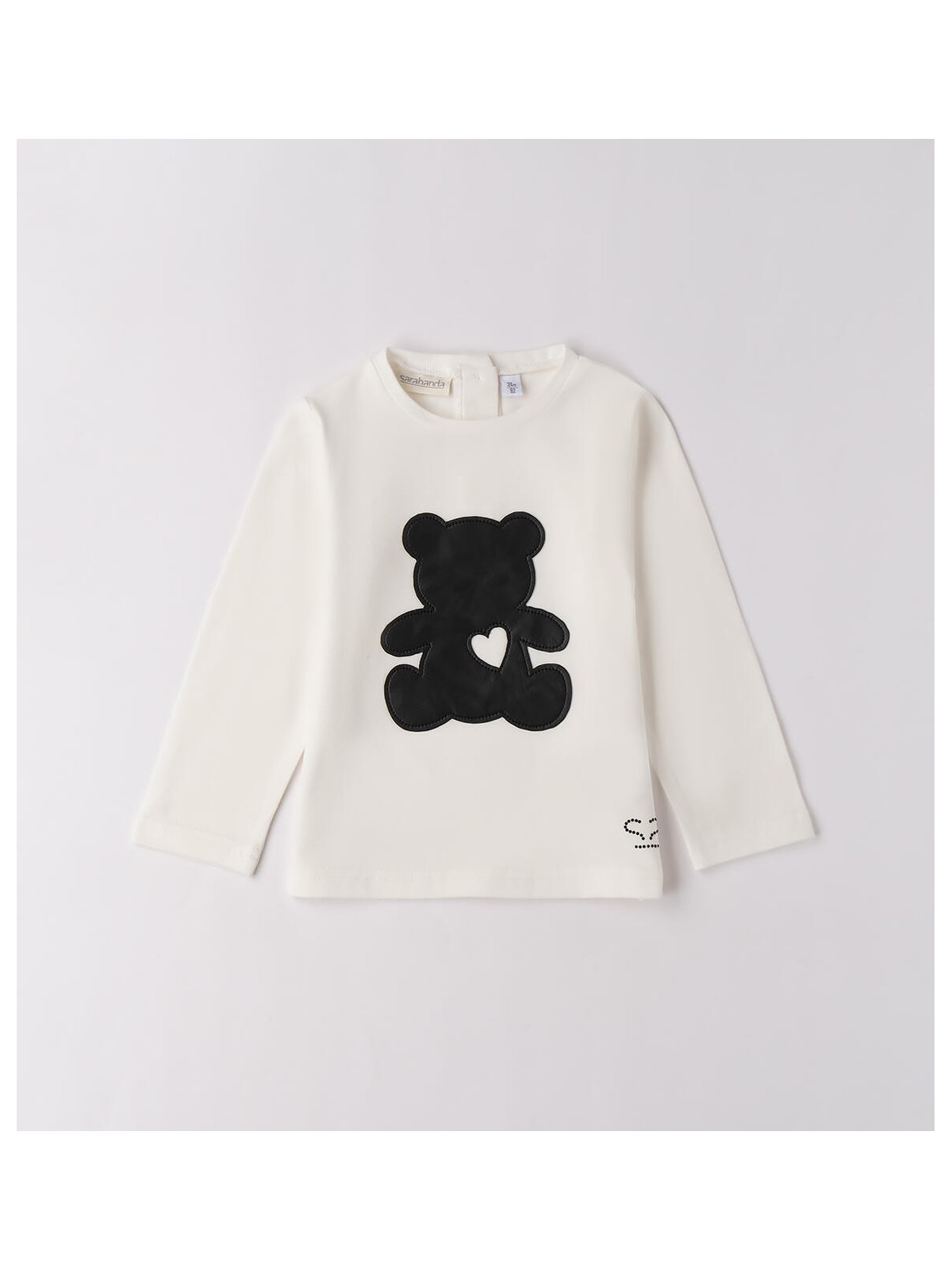 Maglietta bambina realizzata in jersey stretch di cotone, manopesca. Il modello è arricchito con applicazione in tessuto lucido. Il prodotto non contiene materiali di derivazione animale.