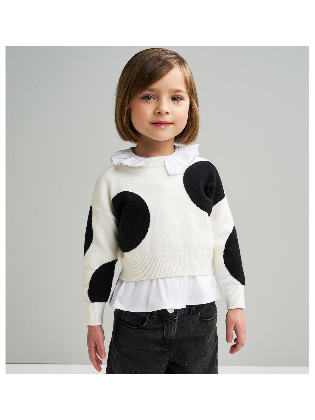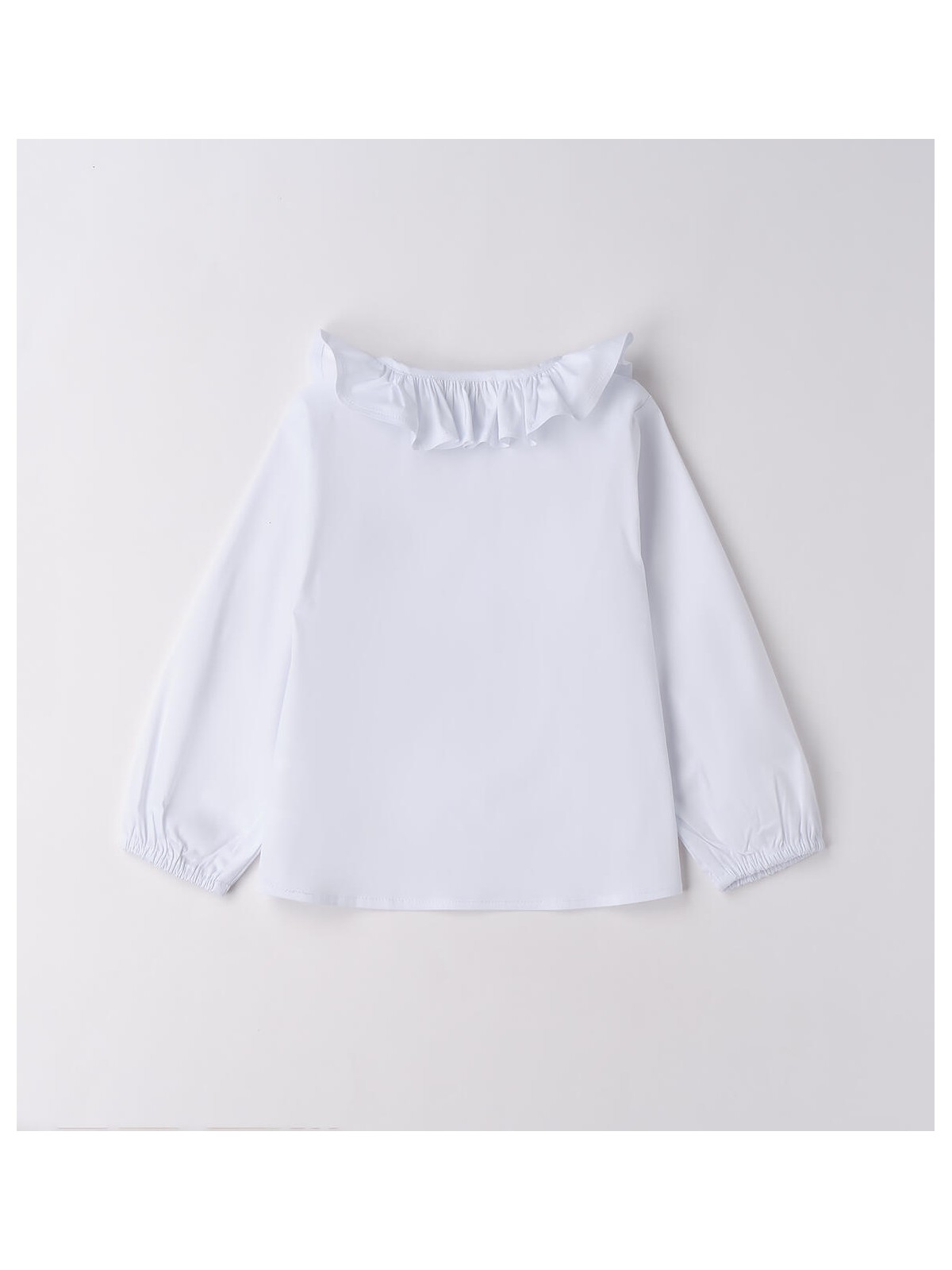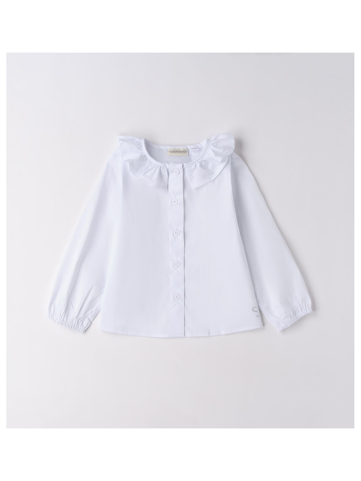 Camicia per bambina in popeline. Il modello presenta apertura frontale con bottoni, colletto a corolla. Elastico sul fondo manica