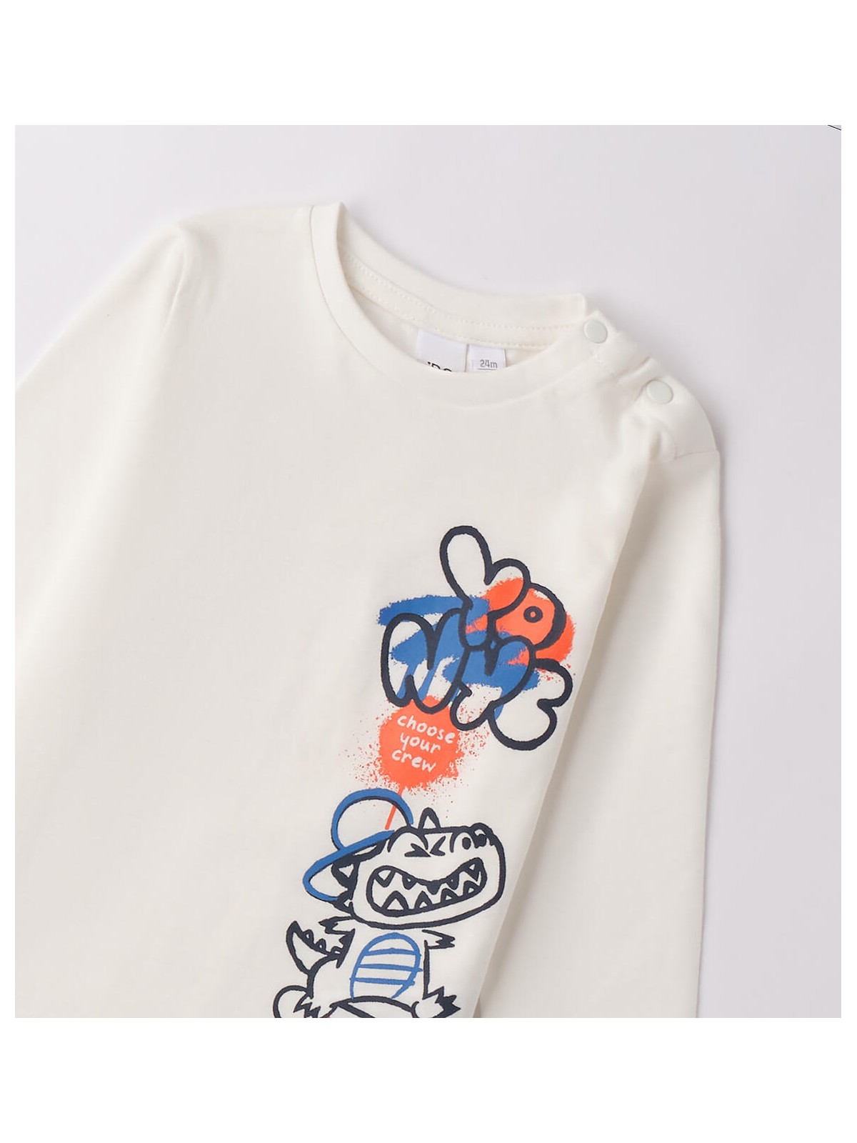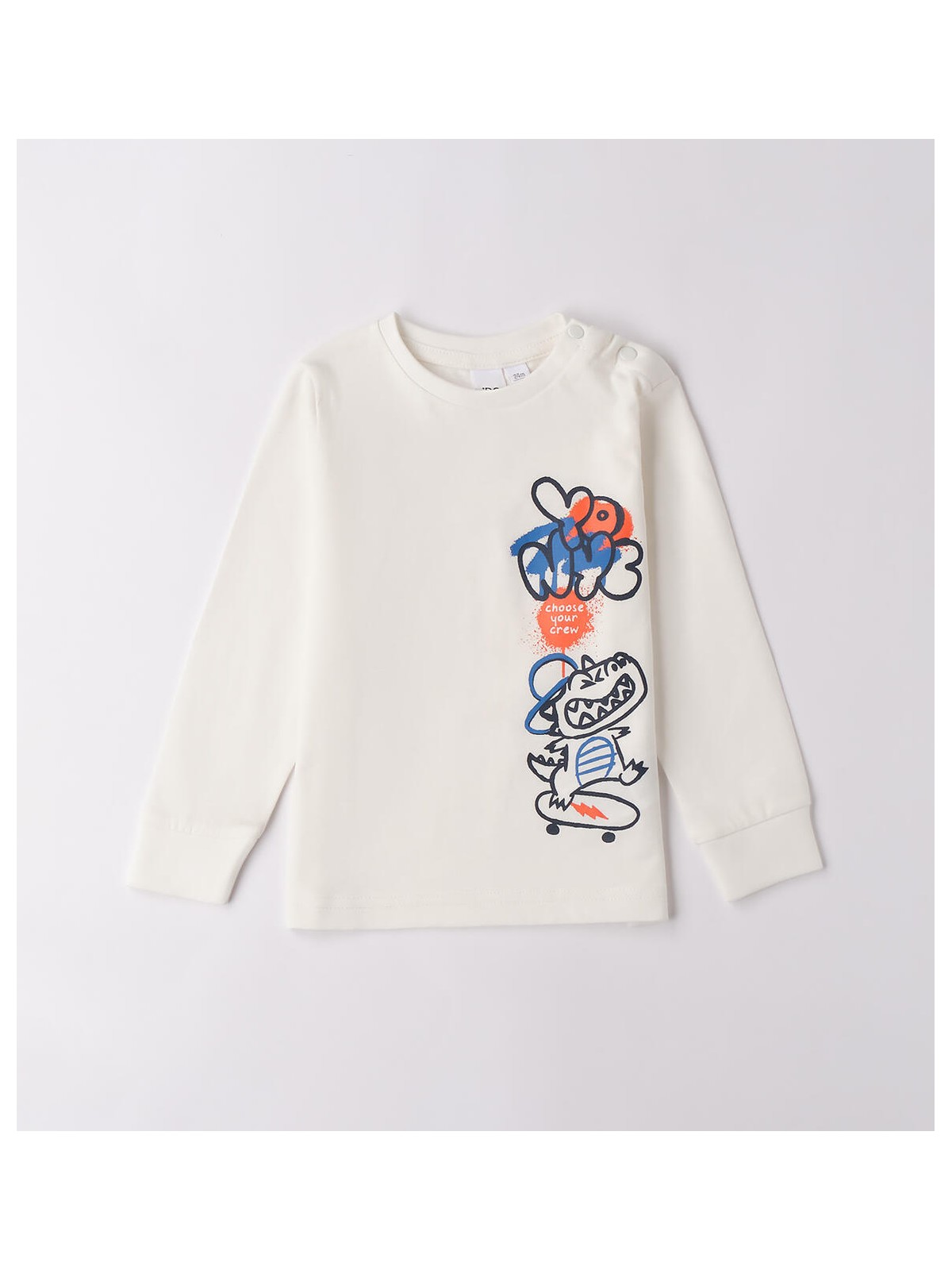 Girocollo manica lunga per bambino iDO. Il modello presenta apertura sulla spalla con bottoni, fino alla taglia 3 anni, per agevolare il cambio e la vestizione. Maglietta realizzata in 100% cotone manopesca.