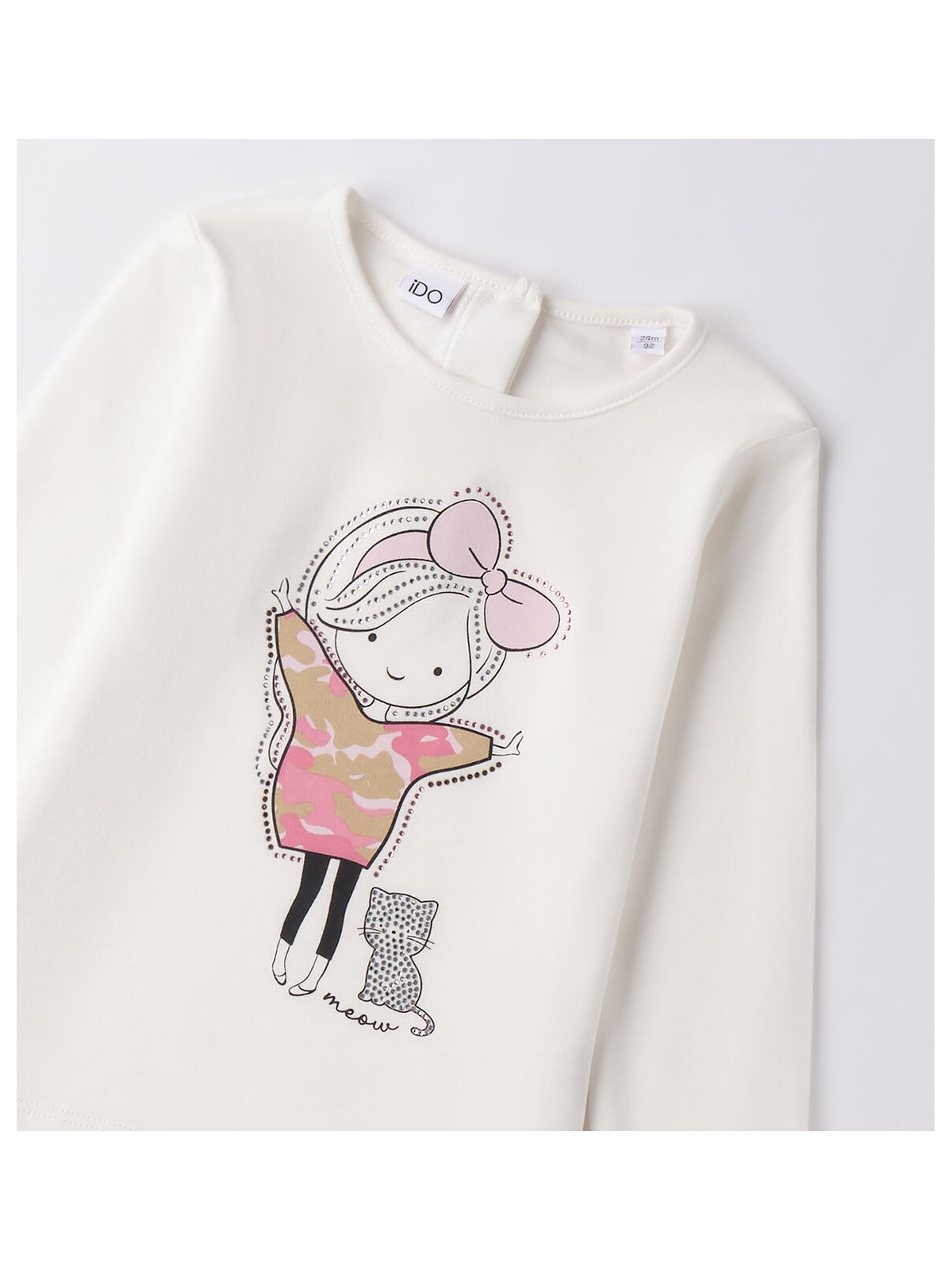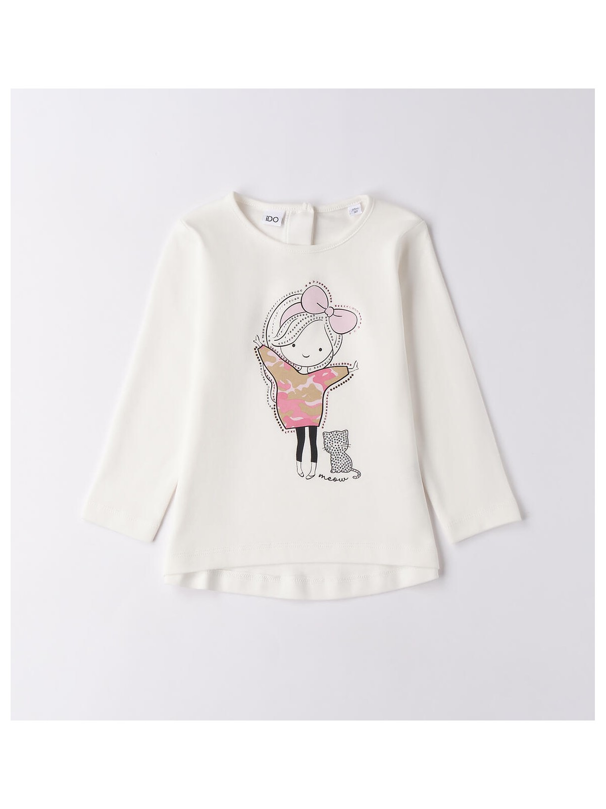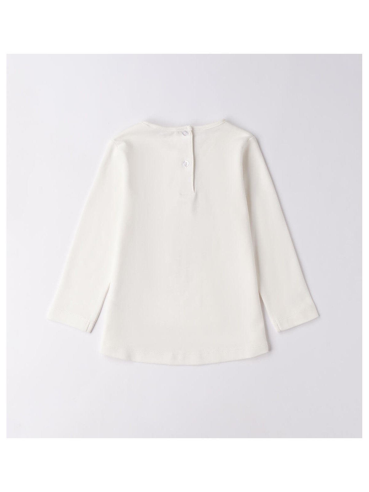 Maxi maglietta per bambina realizzata in interlock 100% cotone. La maglietta è in tinta unita con stampa e strass. Parte dietro leggermente più lunga e stondata.