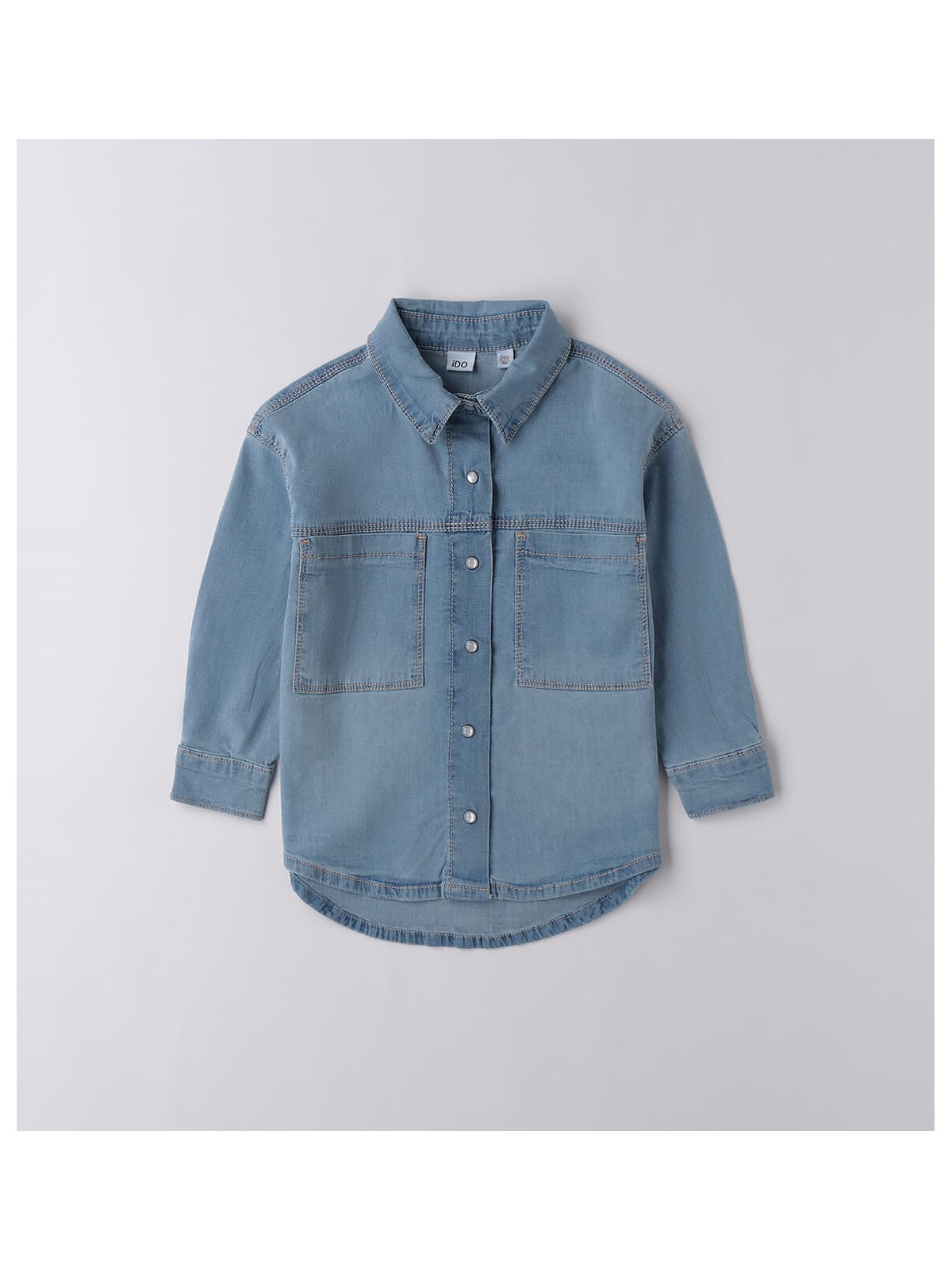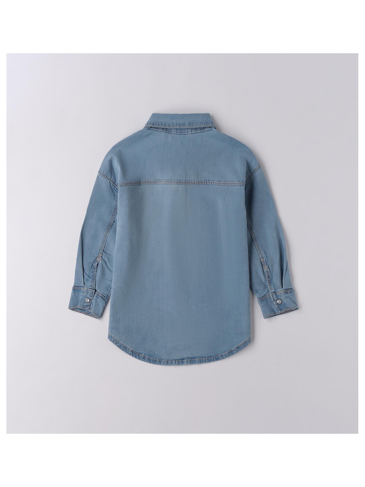 Camicia di jeans per bambinai realizzata in denim stretch di cotone. Il modello presenta apertura frontale con bottoni a pressione e tasche. La camicia ha la parte dietro leggermente più lunga.