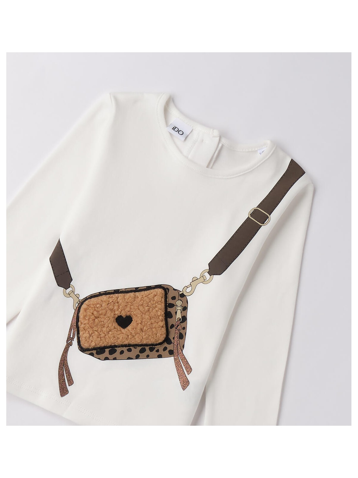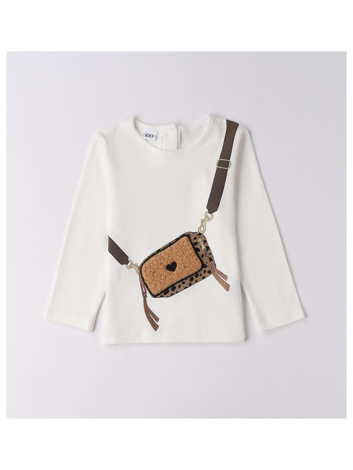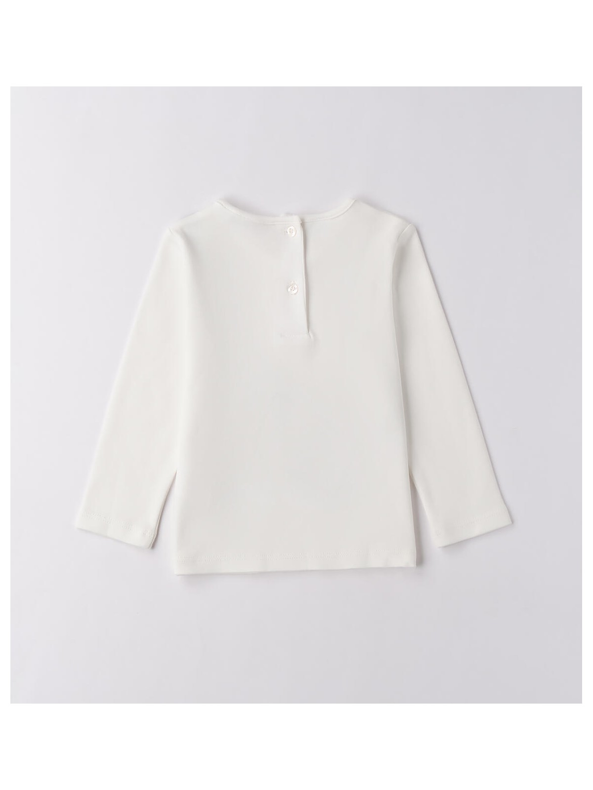 Maglietta per bambina realizzata in interlock 100% cotone con stampa e ricamo spugna. Apertura dietro con bottoni.