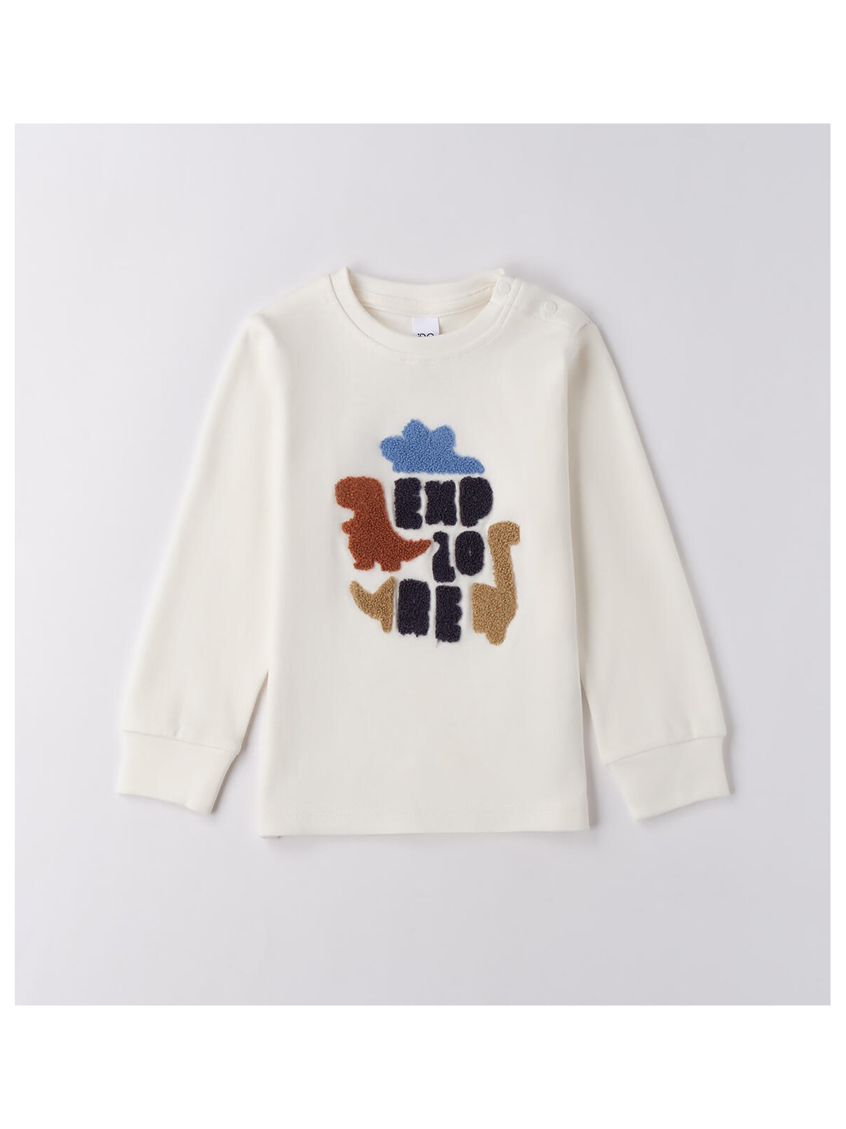 Maglietta per bambino realizzata in jersey 100% cotone, manopesca. Il modello presenta, fino alla taglia 3 anni, apertura sulla spalla con bottoni a pressione per agevolare il cambio e la vestizione
