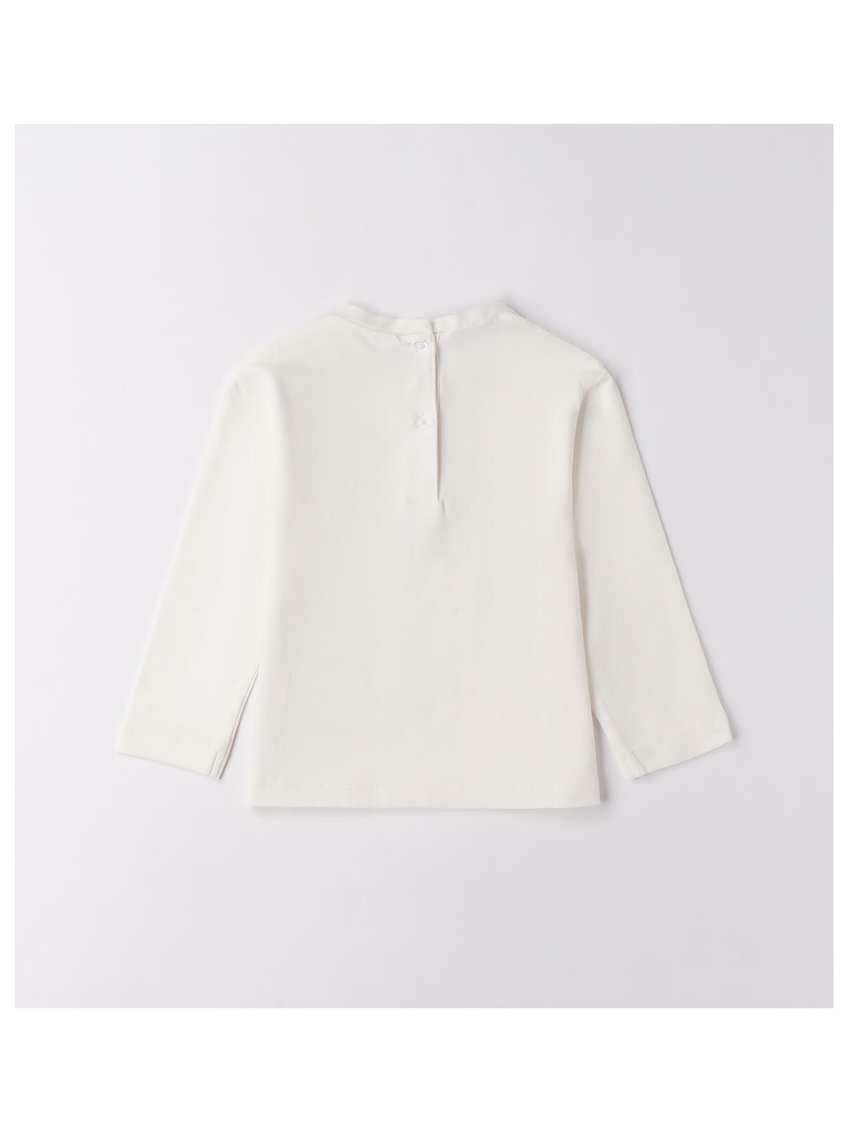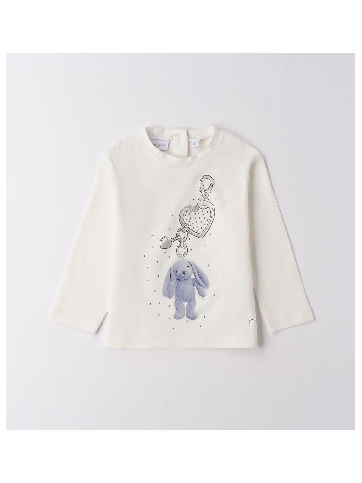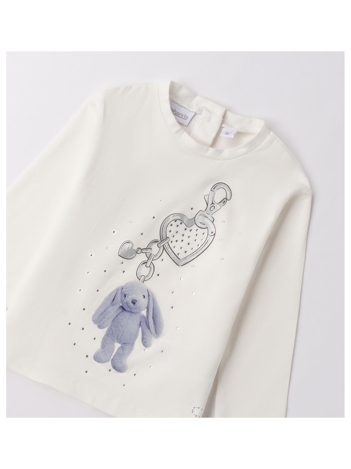 Maglietta bambina Sarabanda realizzata in jersey stretch di cotone, manopesca. Il modello è in tinta unita con stampa dai dettagli laminati e strass