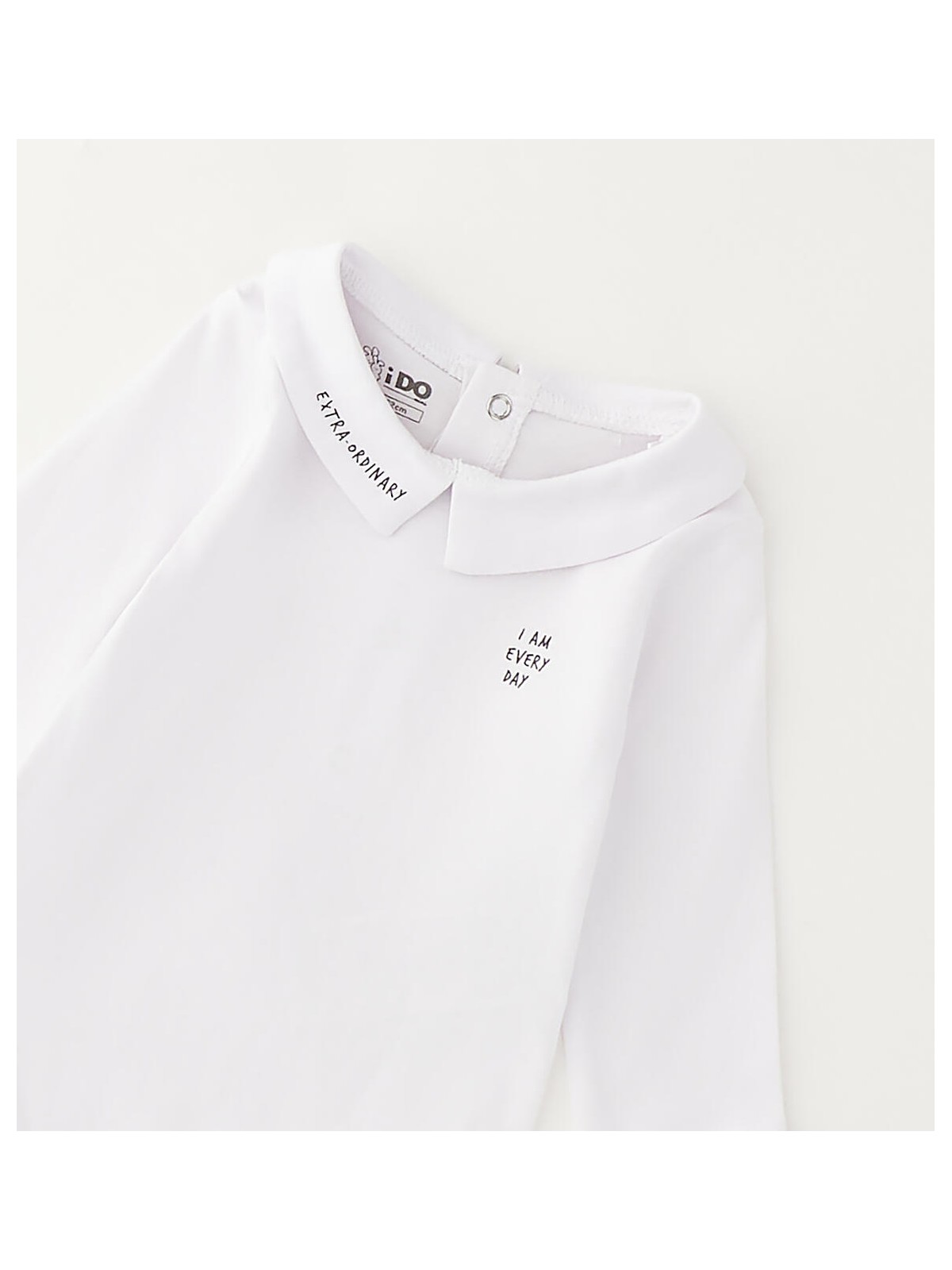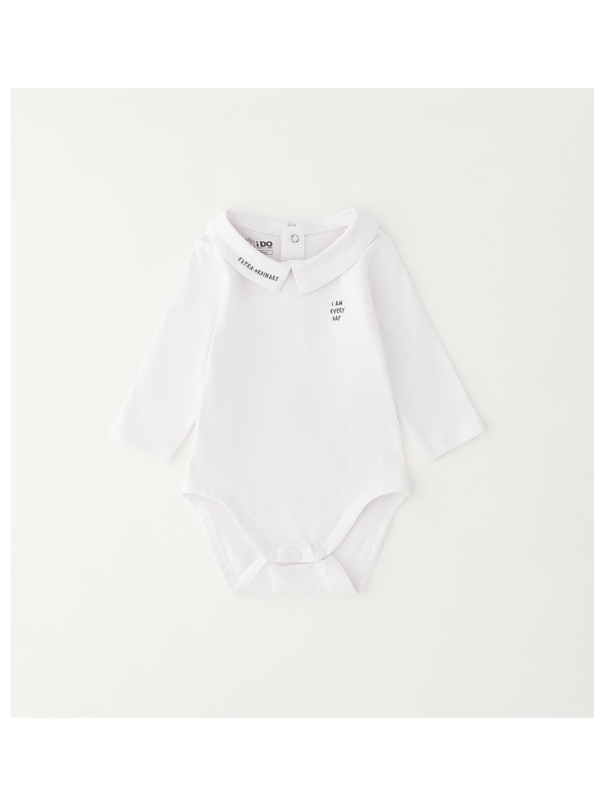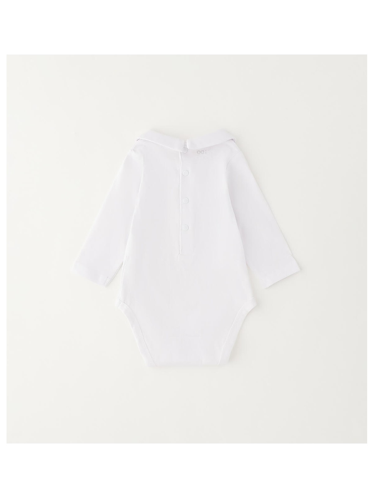 Body per bimbo realizzato in jersey 100% cotone. Modello a manica lunga con colletto e piccola stampa. Aapertura sul retro e nel sottogamba con bottoni per agevolare il cambio e la vestizione.