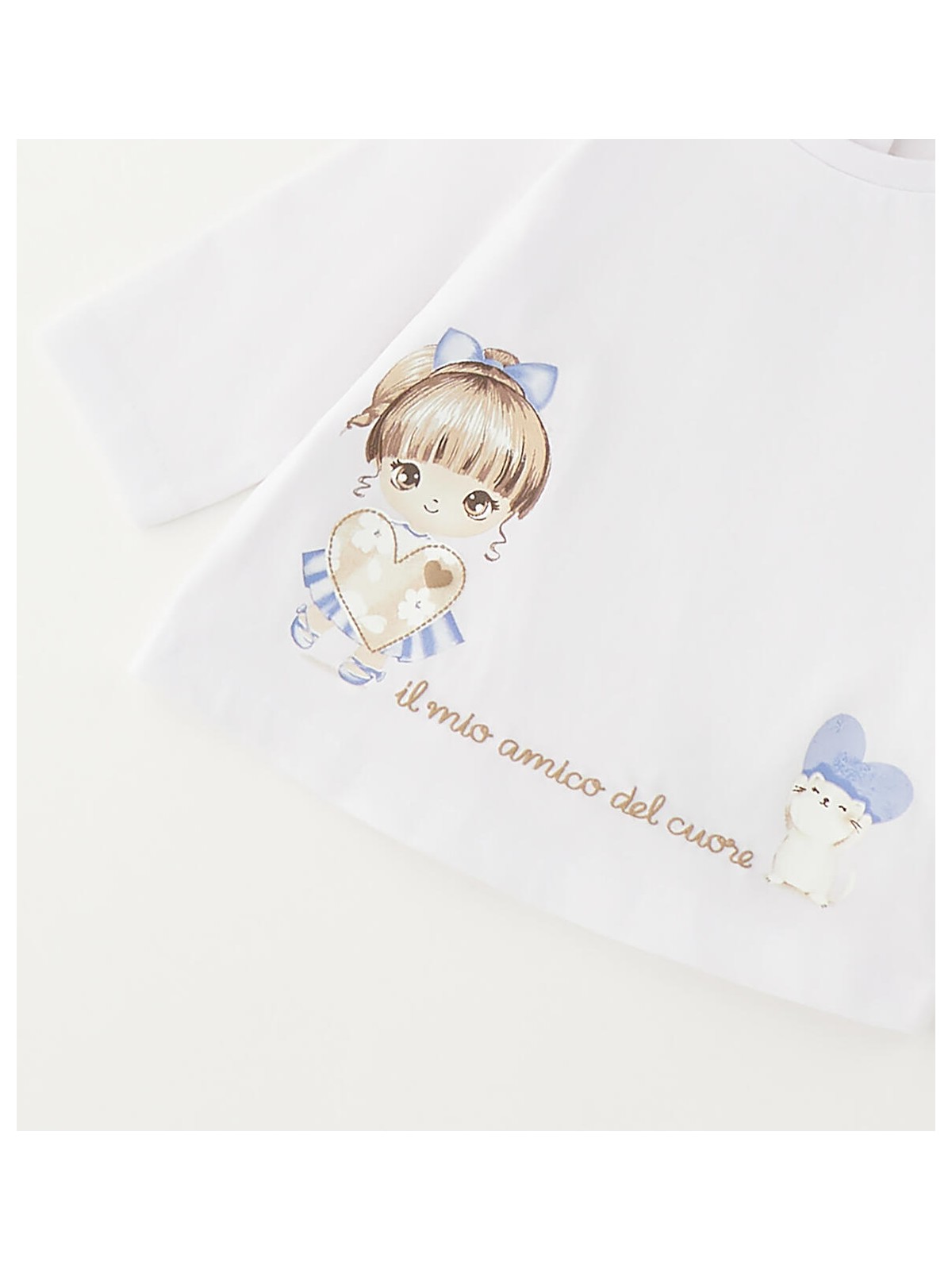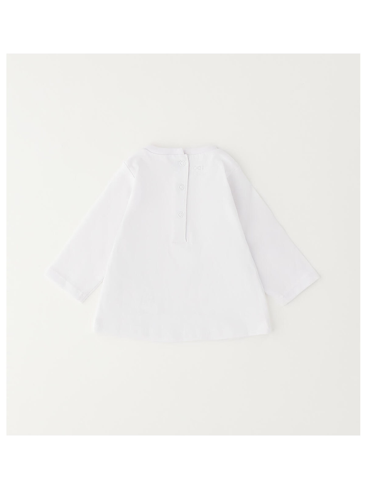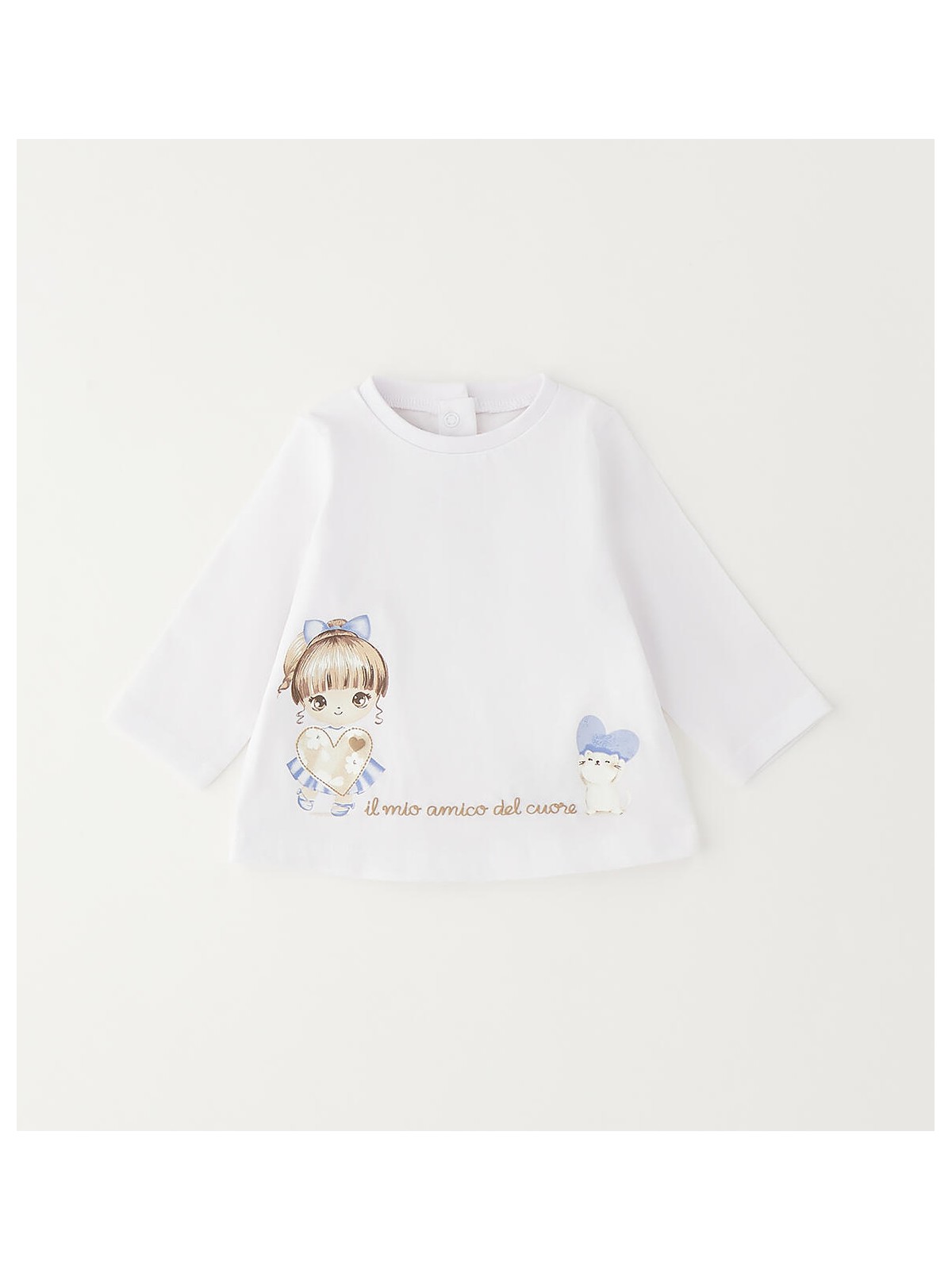 Maglietta bimba realizzata in jersey 100% cotone con apertura sul retro tramite bottoni a pressione. Stampa davanti con dettagli a rilievo.