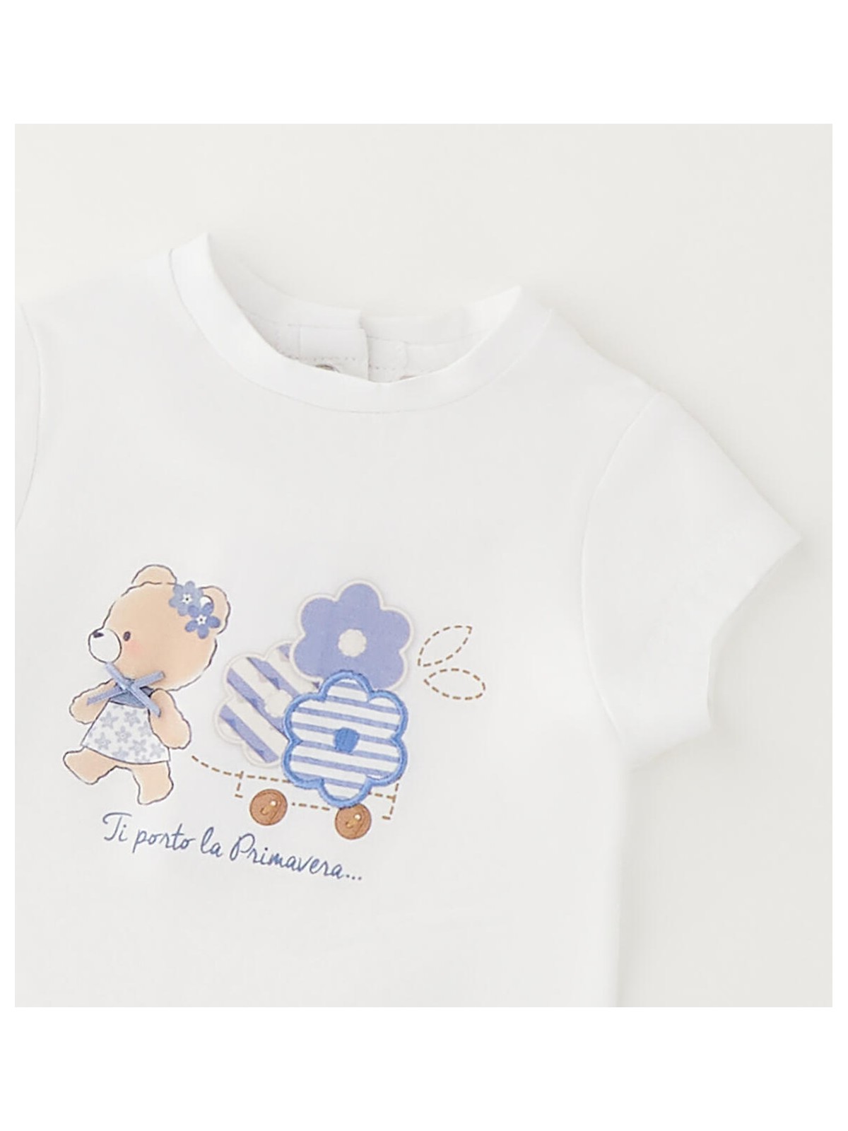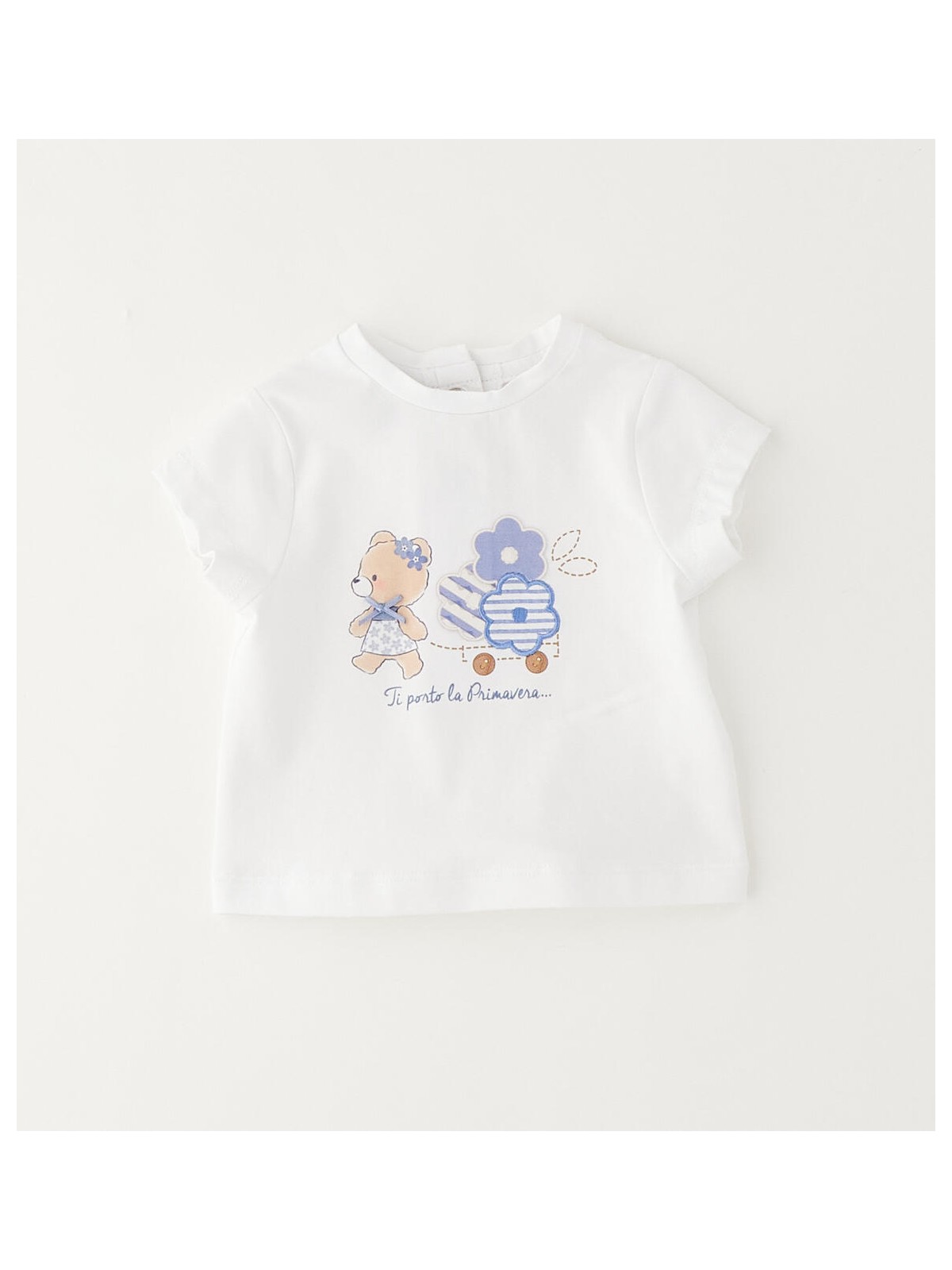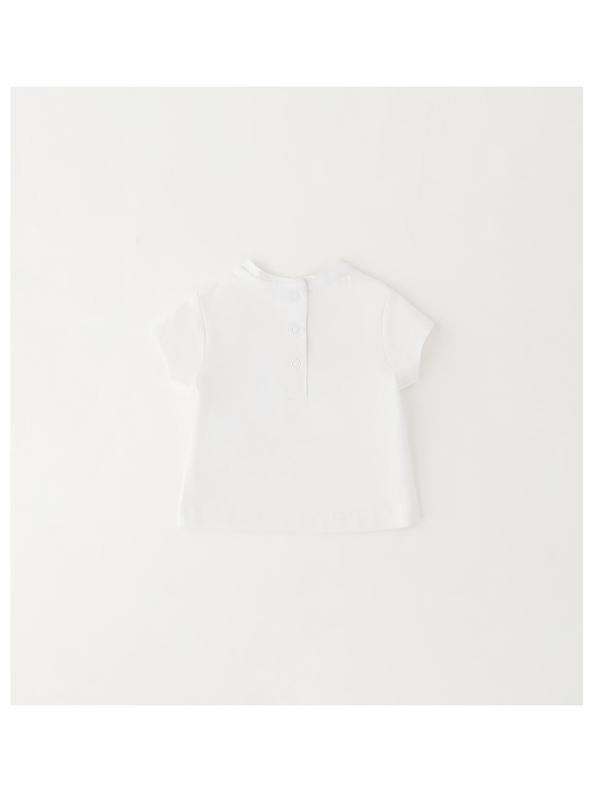 T-shirt per neonata realizzato in jersey stretch di cotone con stampa e applicazione ricamo. Apertura dietro con bottoni a pressione.