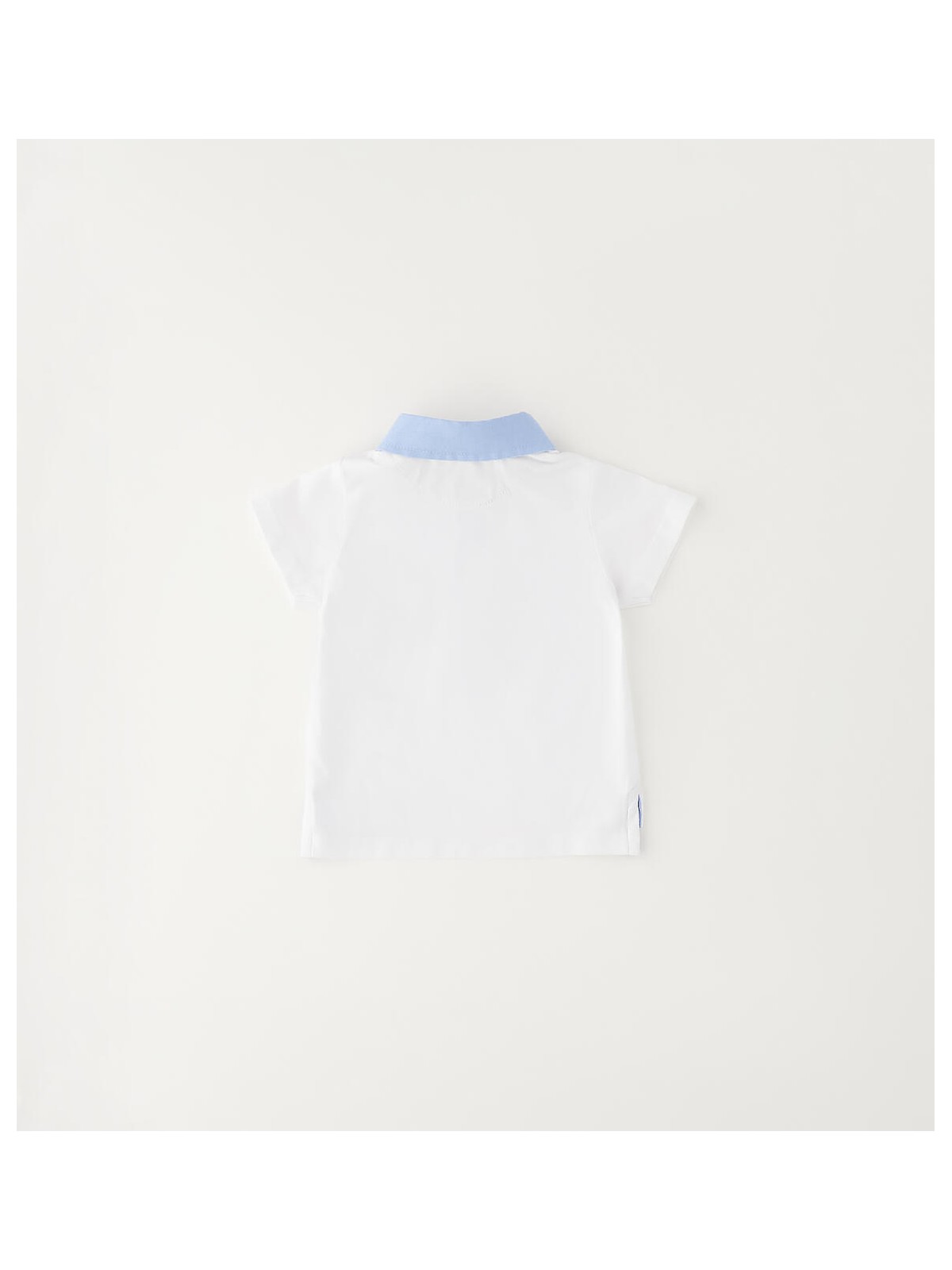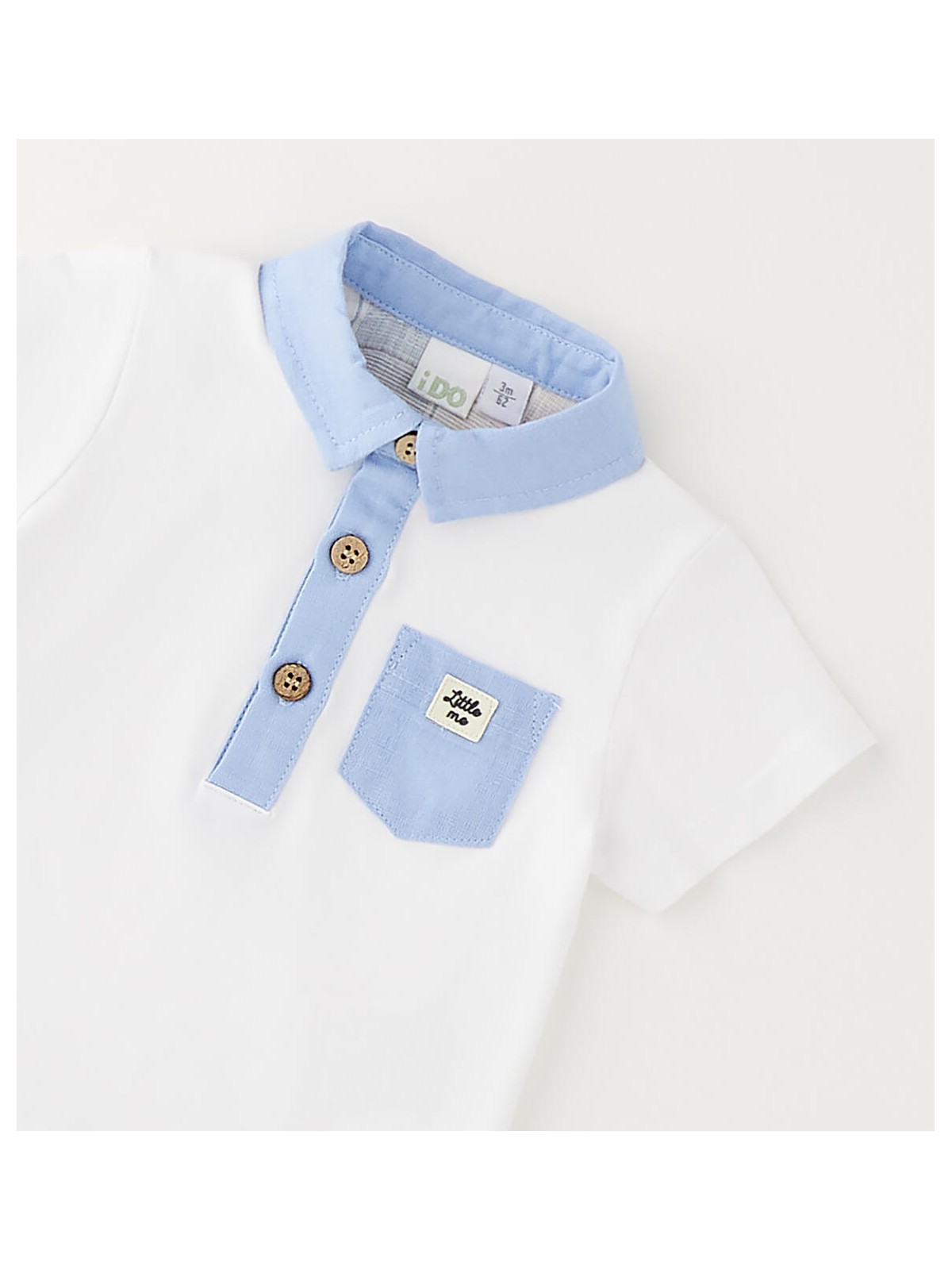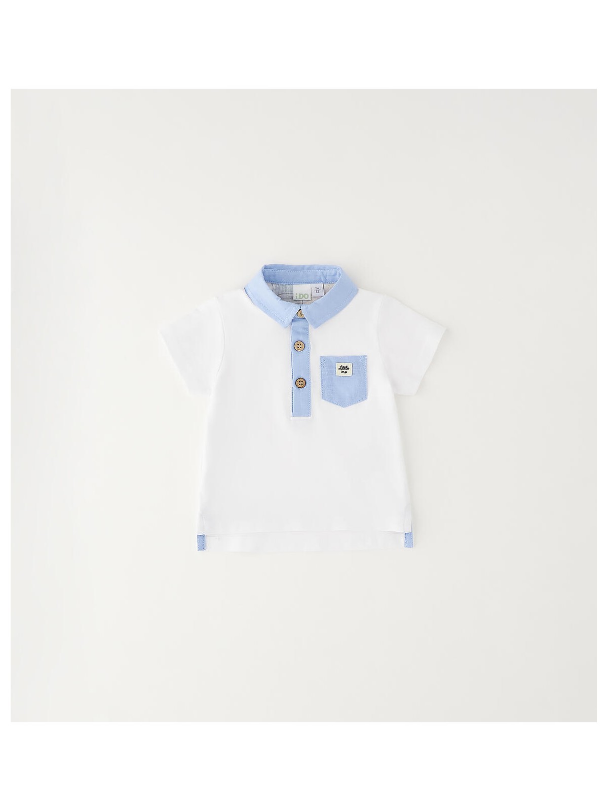 Polo iDO per bimbo realizzata in jersey stretch di cotone con dettagli e taschino in lino e cotone. Modello a manica corta e apertura davanti con bottoni.