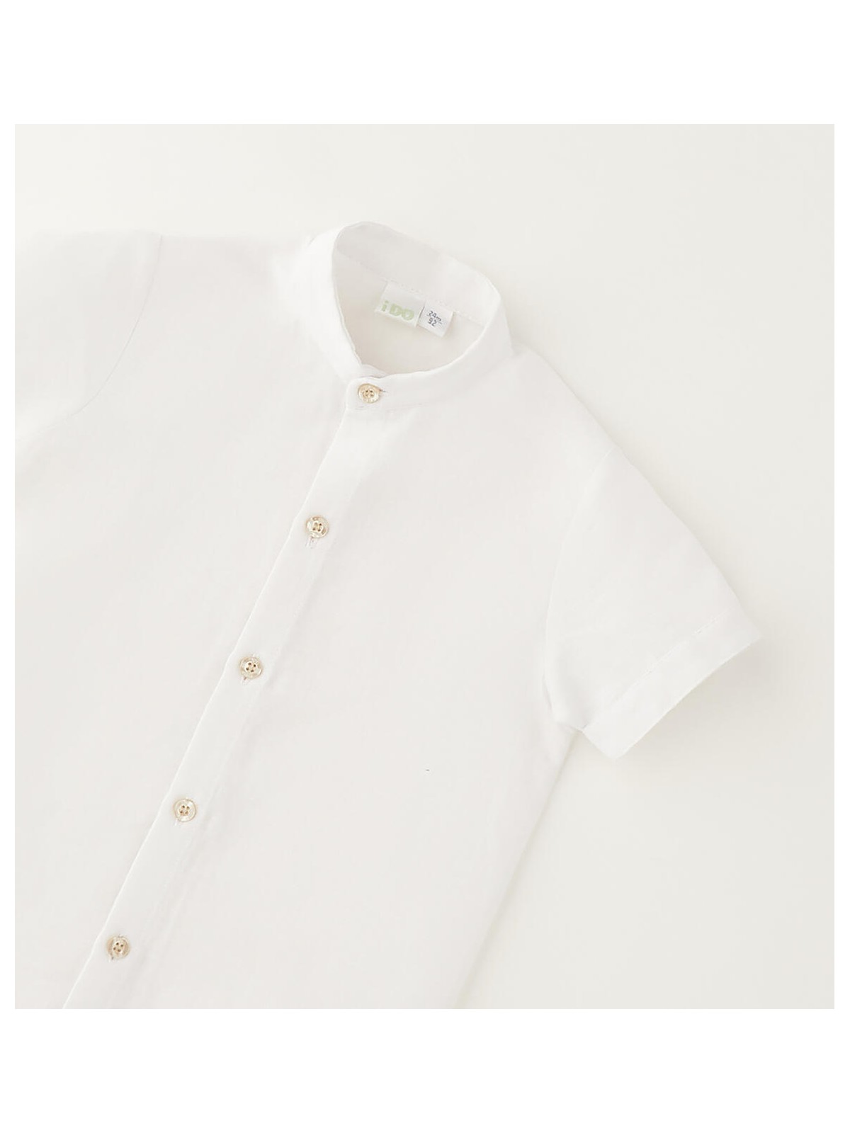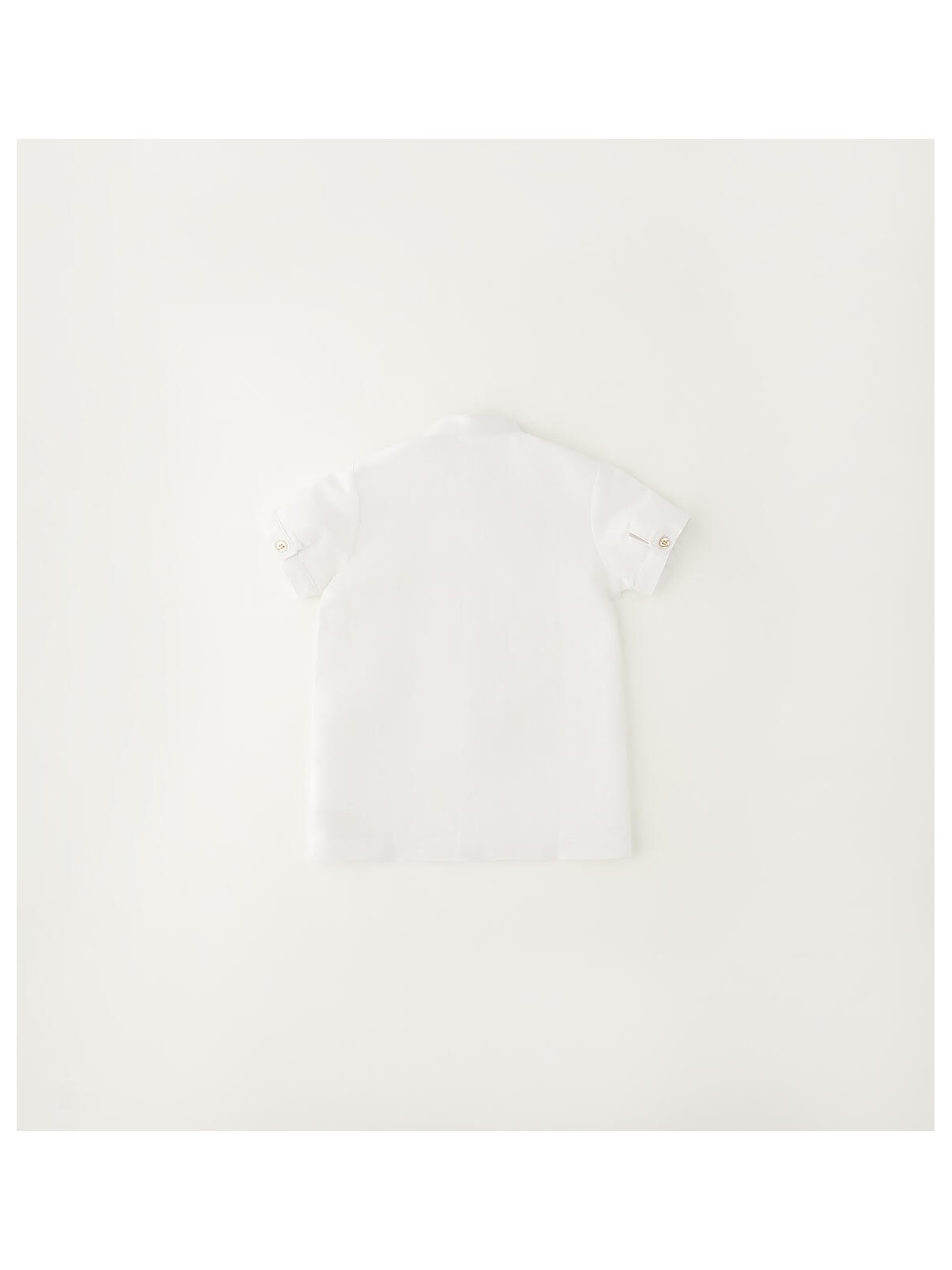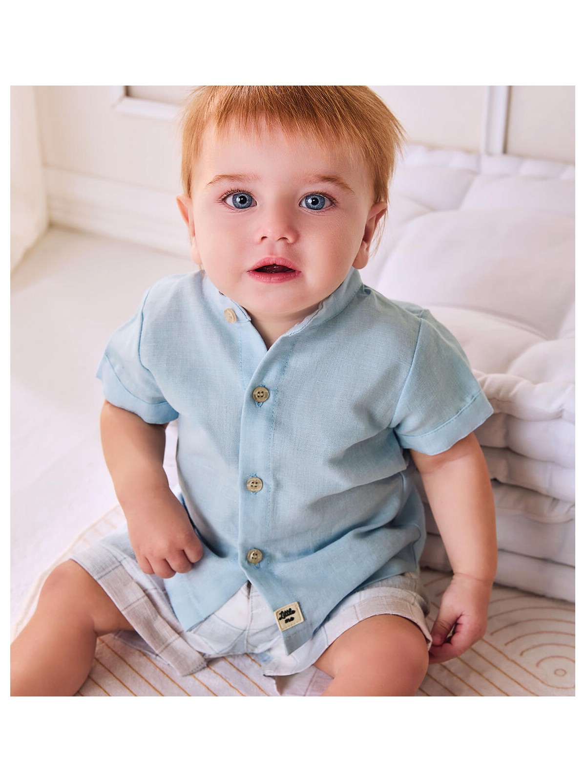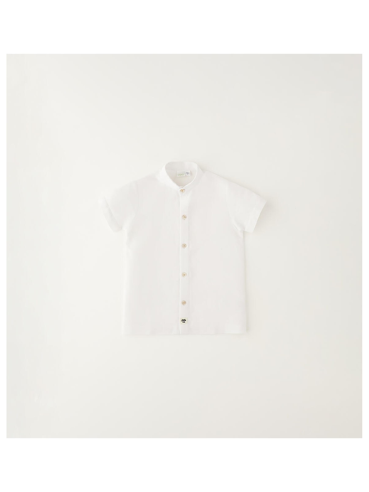 Camicia per bimbo realizzata in lino e cotone. Modello con collo alla coreana e apertura davanti con bottoni
