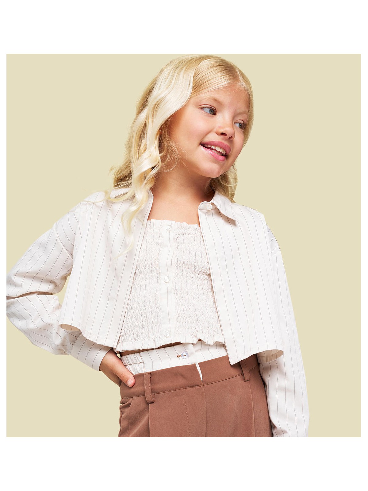 Camicia a manica lunga per ragazza Sarabanda realizzata in tessuto ricamato a righe con filo lurex. Apertura con bottone. Modello corto con top elastico in abbinamento