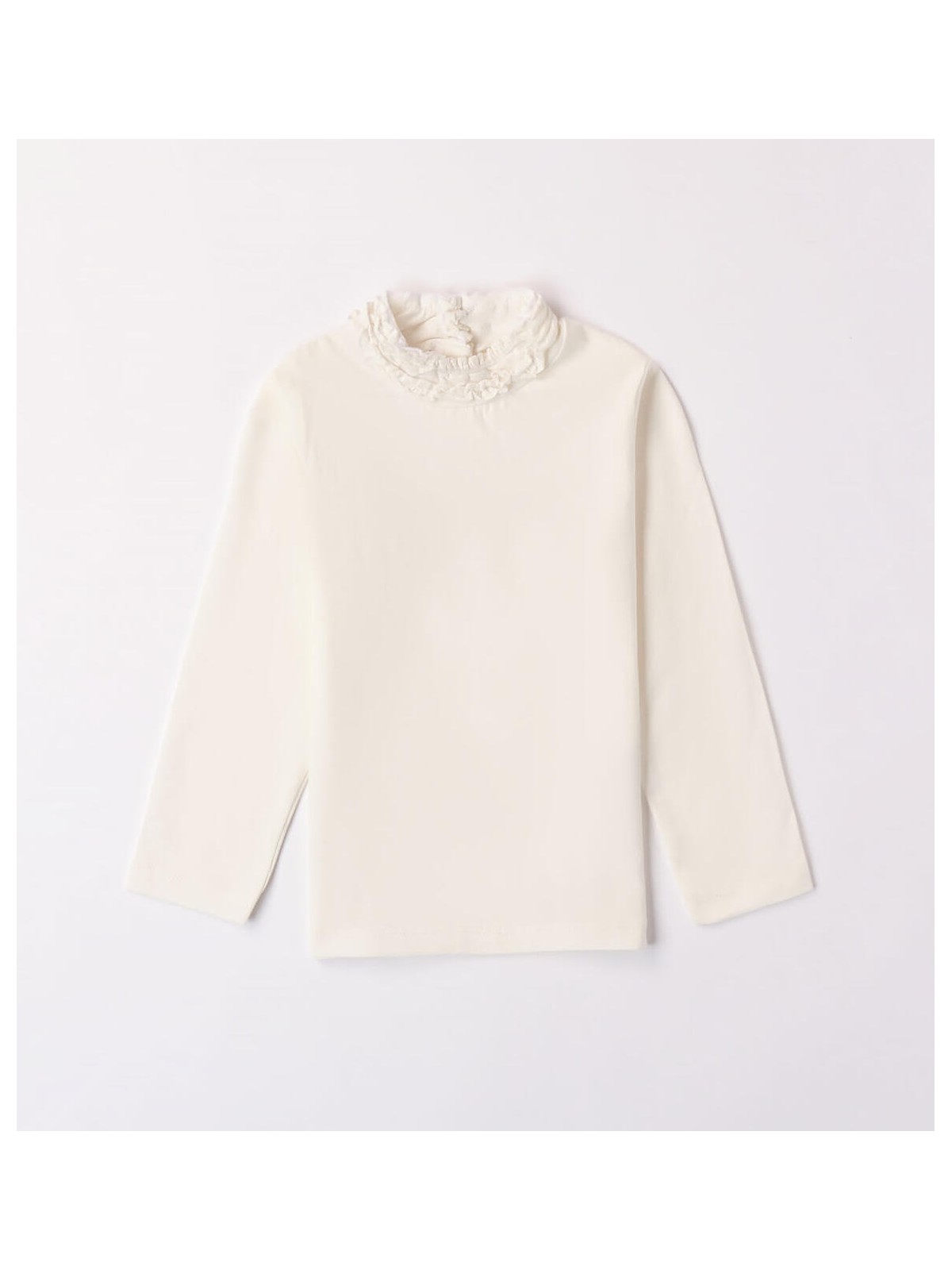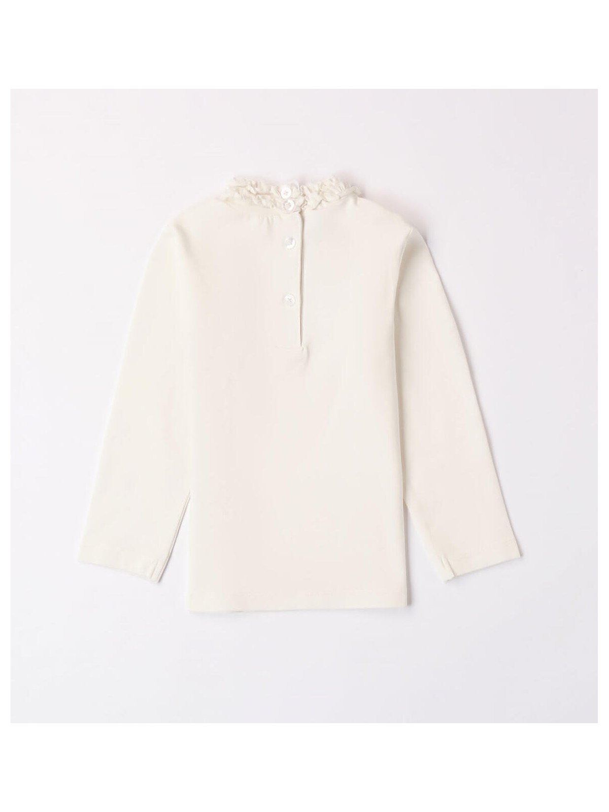 Lupetto avvitato per bambina iDO realizzato in jersey stretch di cotone mano pesca. Colletto con ruches sul girocollo e apertura dietro con bottoni