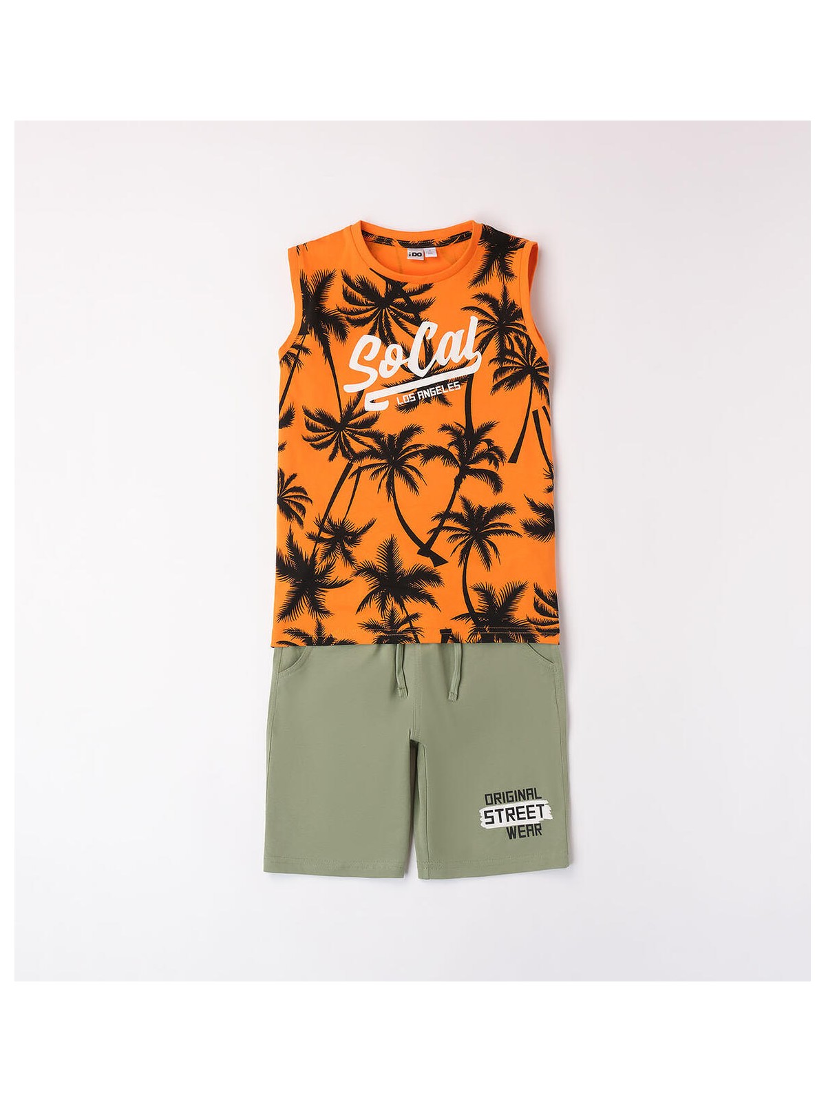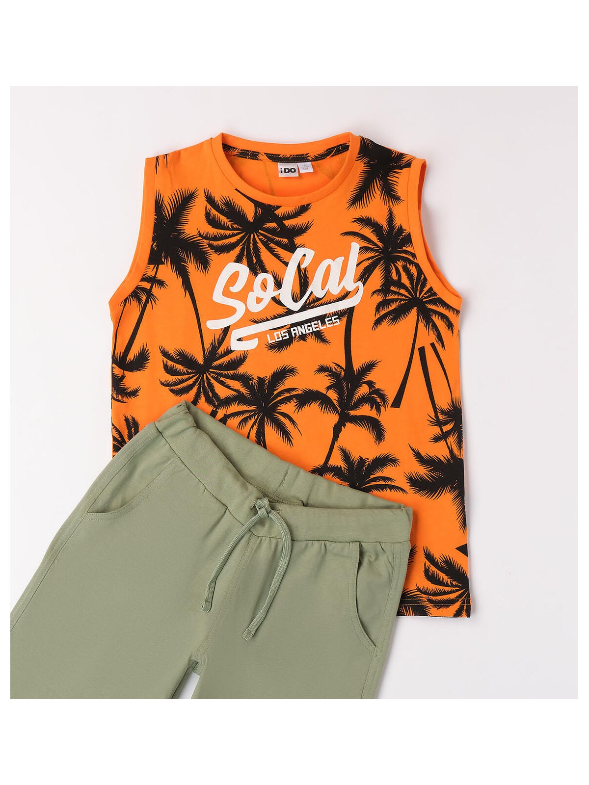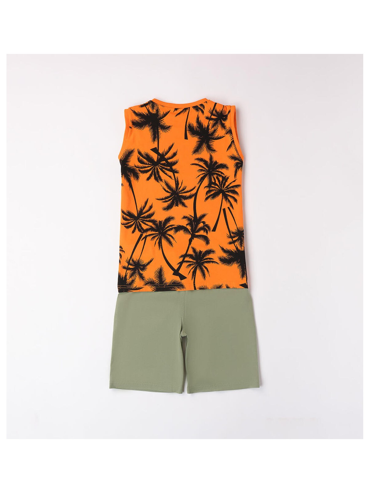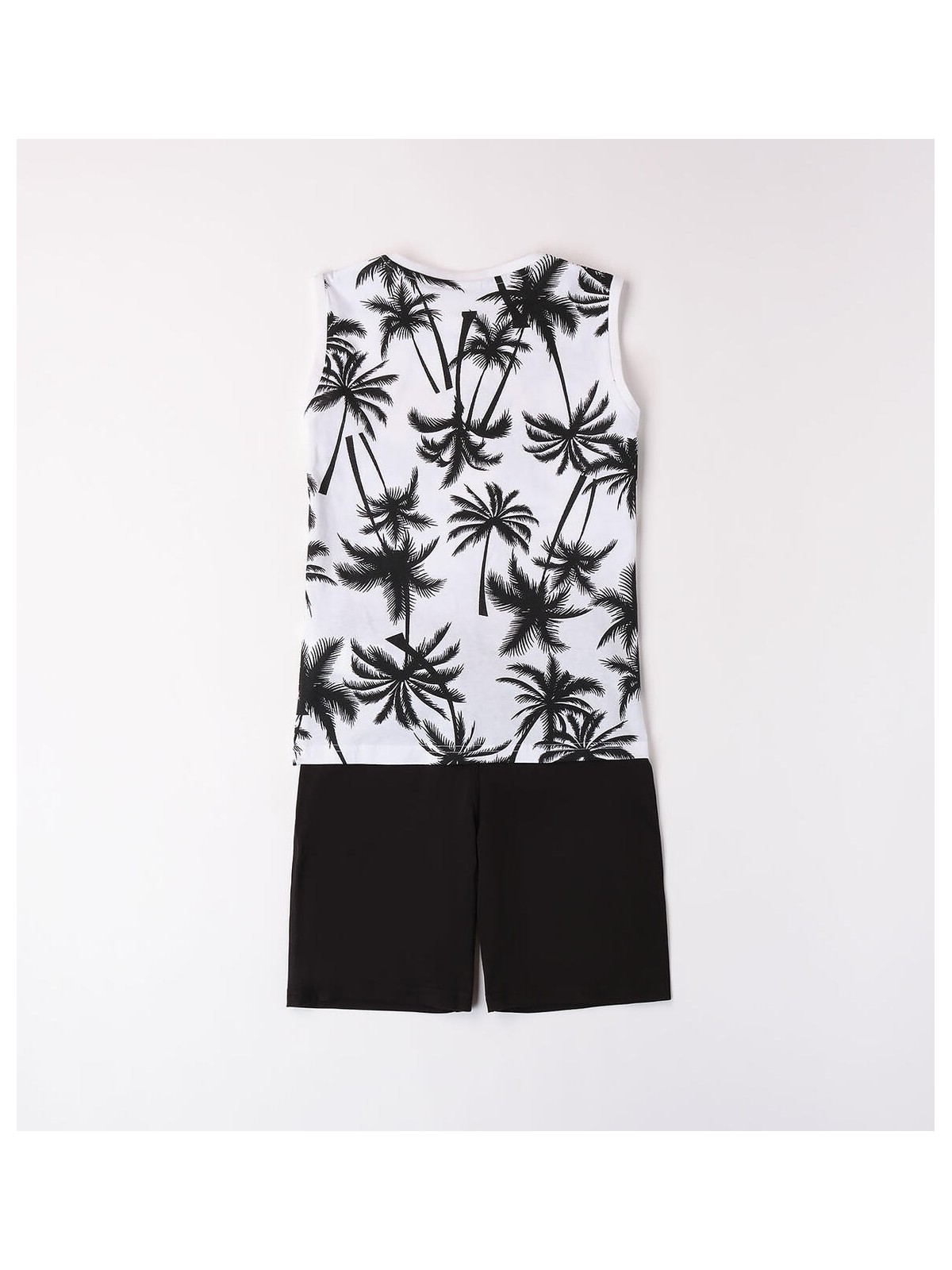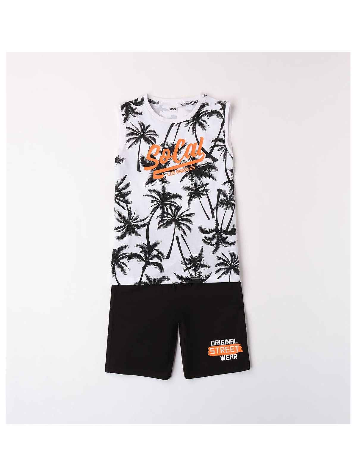 Completo iDO per ragazzo realizzato in jersey 100% cotone. La canotta ha maxi stampa frontale con palme e pantalone corto al ginocchio