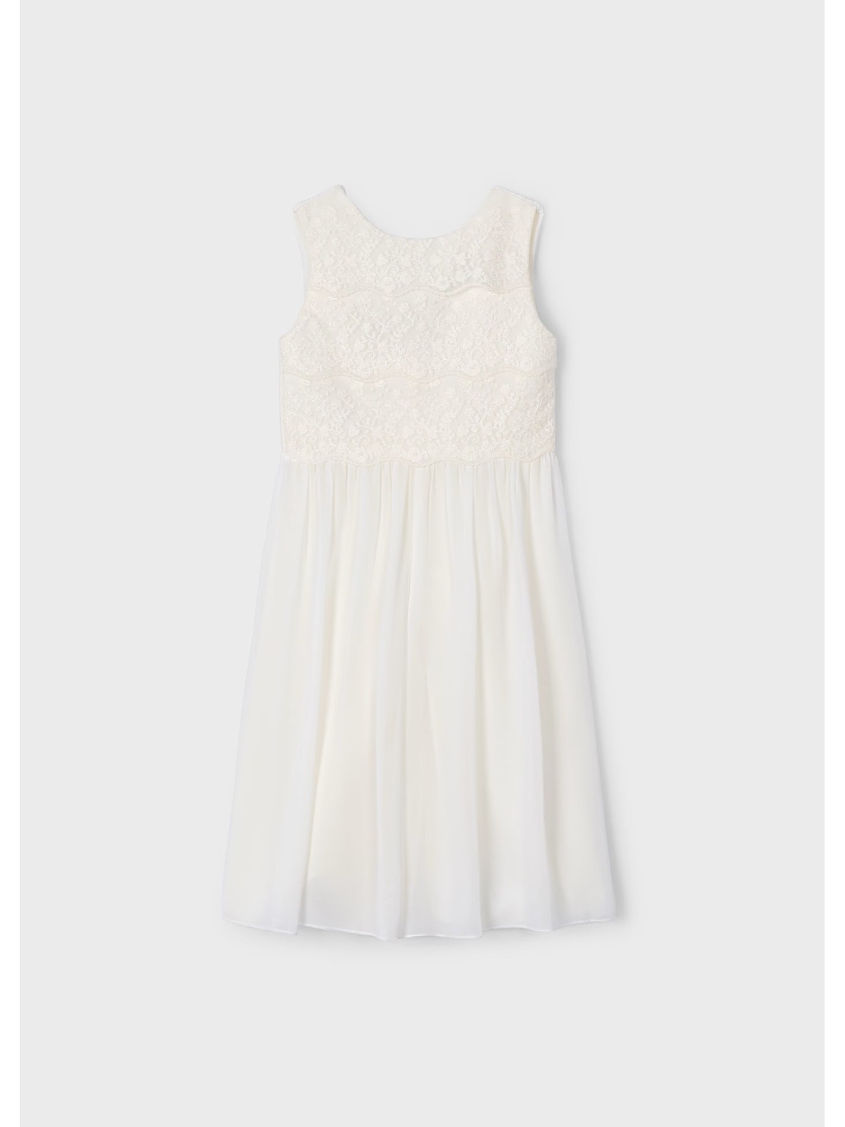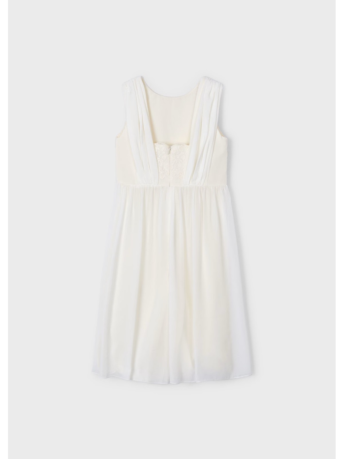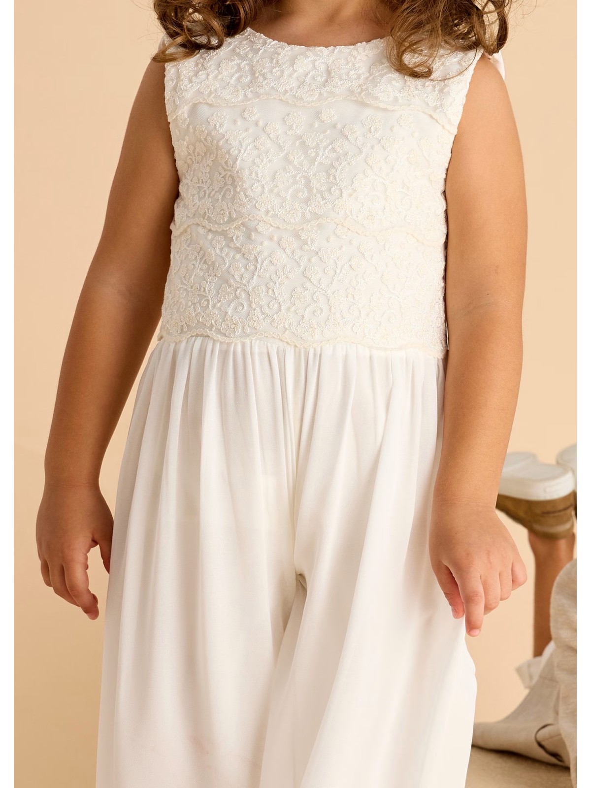 Tuta cerimonia bambina giromanica con applicazione merletto frontale, scollo e apertura con zip sul retro.