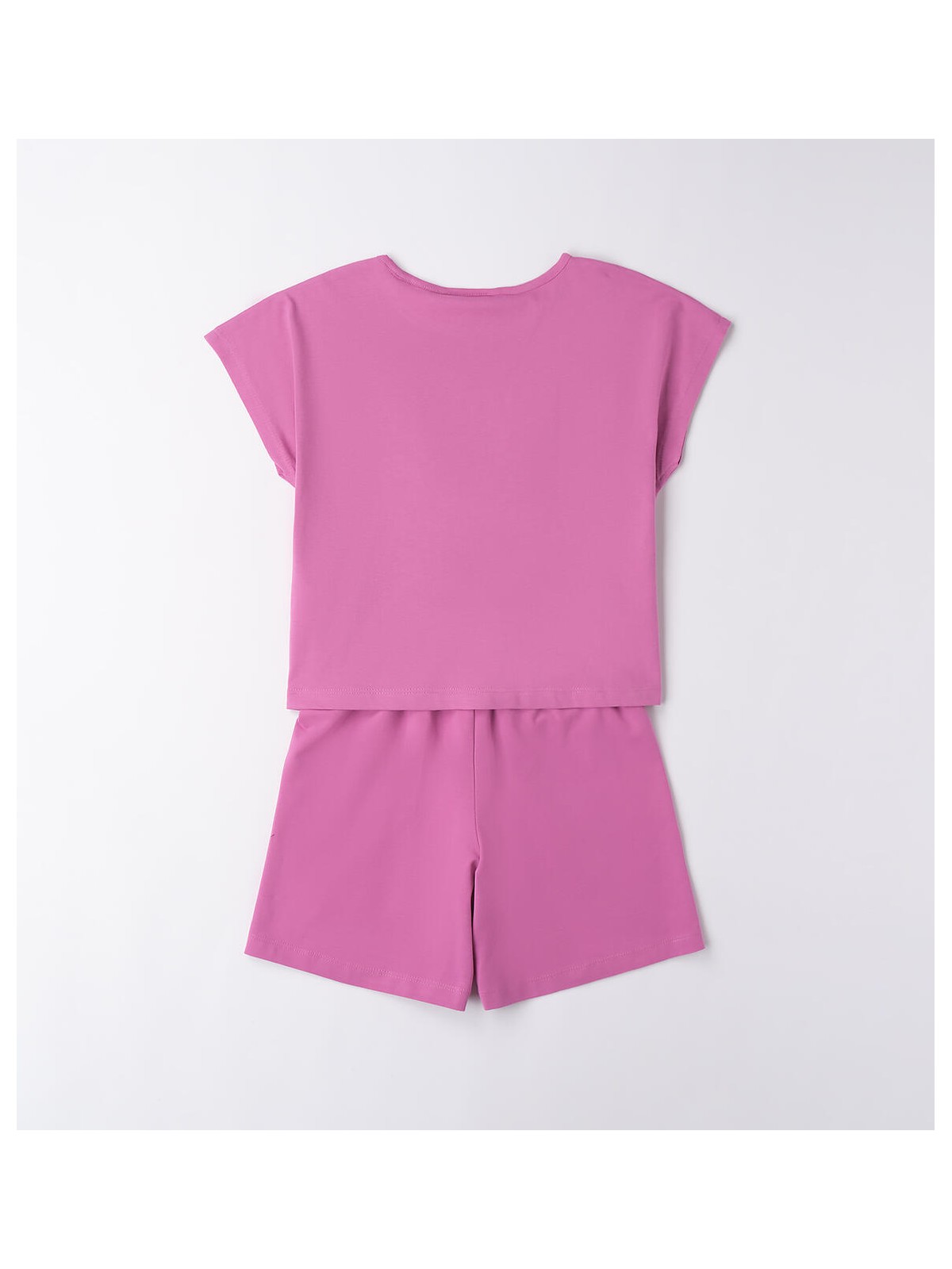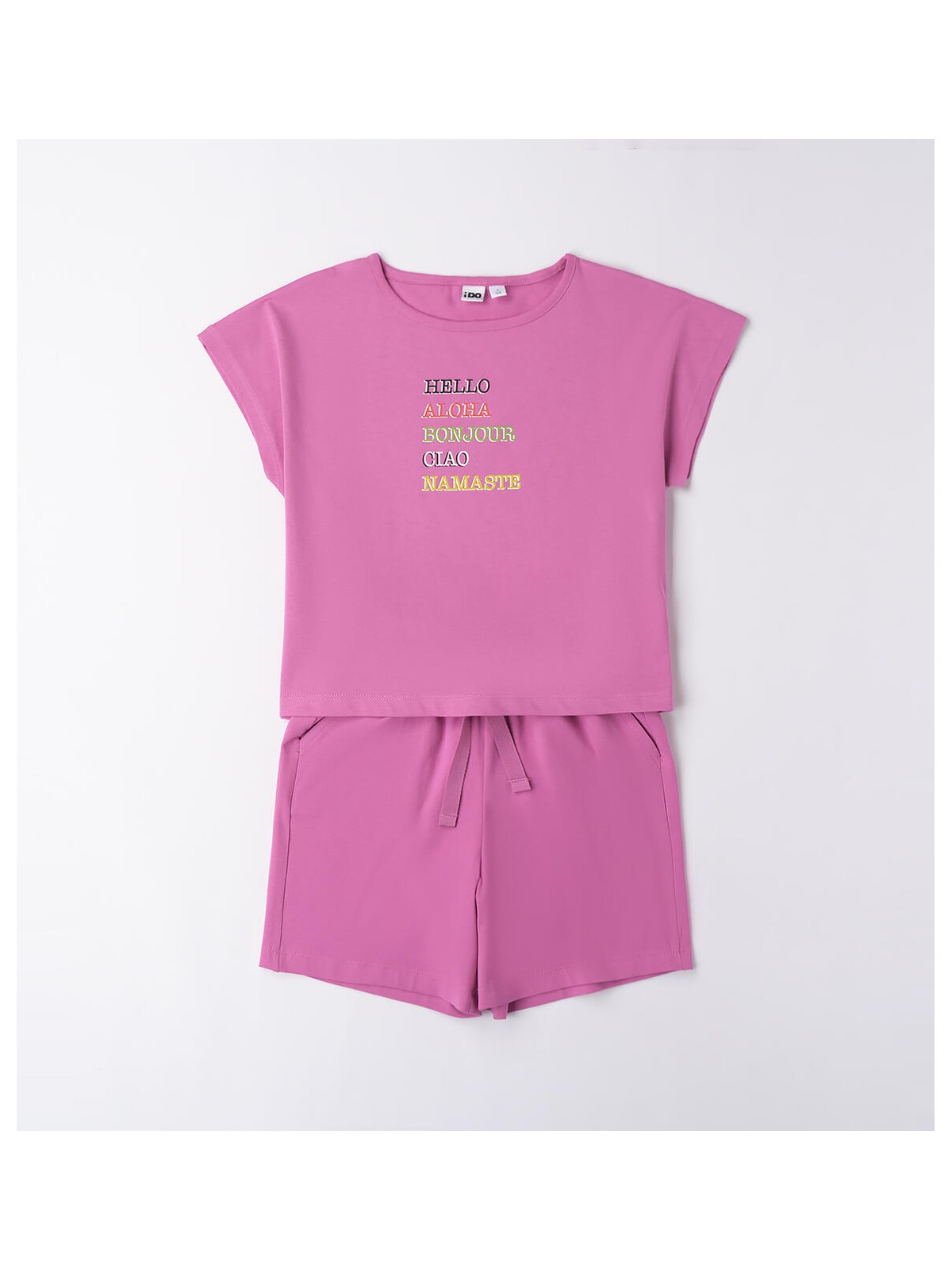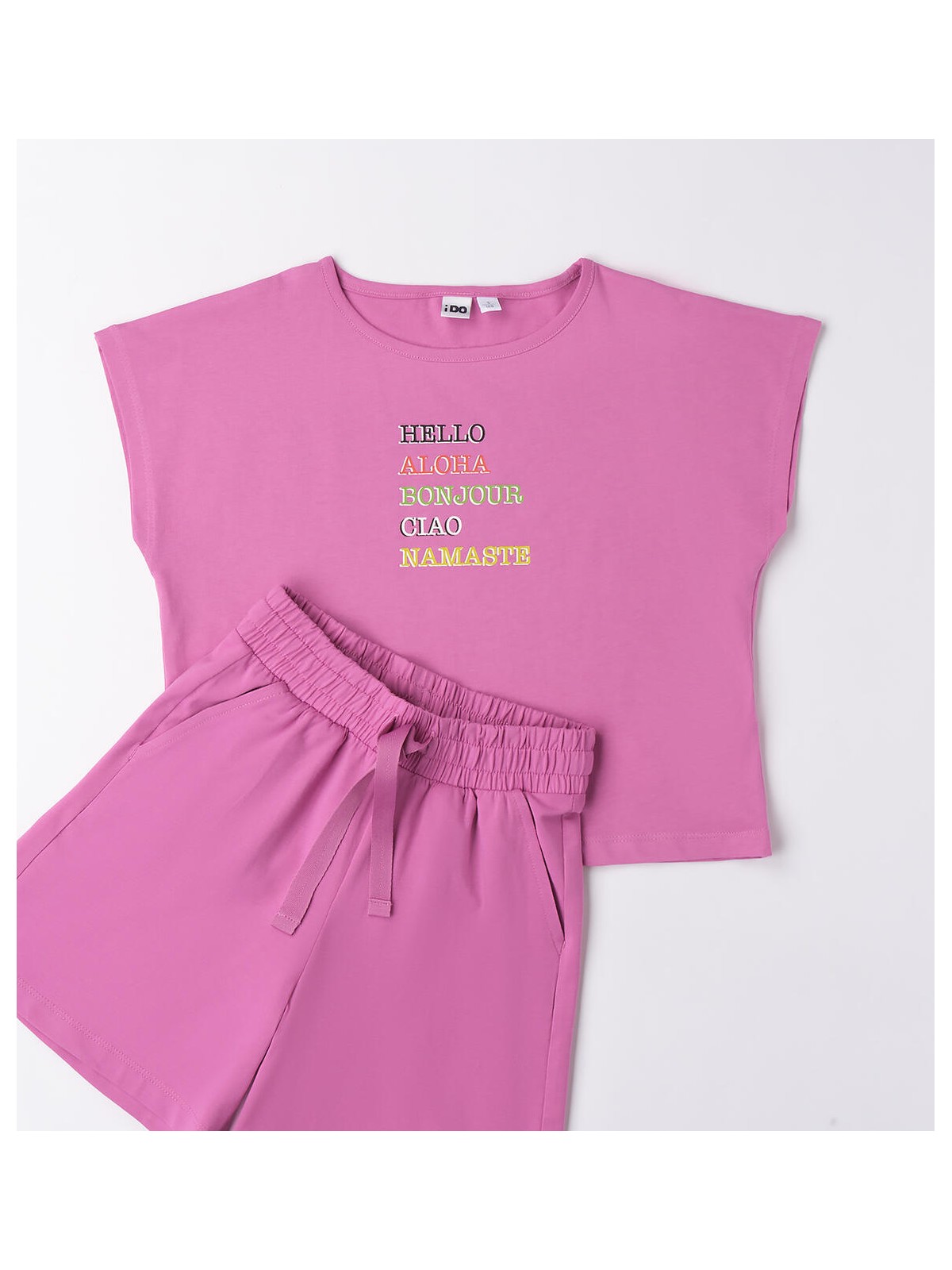 Completo estivo ragazza iDO 8-16 anni in jersey. La t-shirt crop è realizzata in jersey 100% cotone con scritte. I pantaloni corti hanno vita elasticizzata con coulisse e sono in fantasia tinta unita, realizzati in jersey stretch di cotone