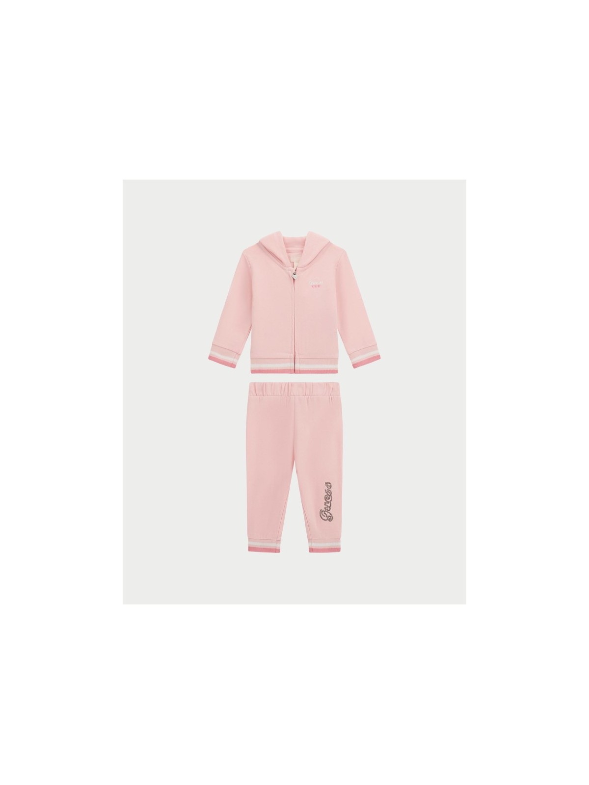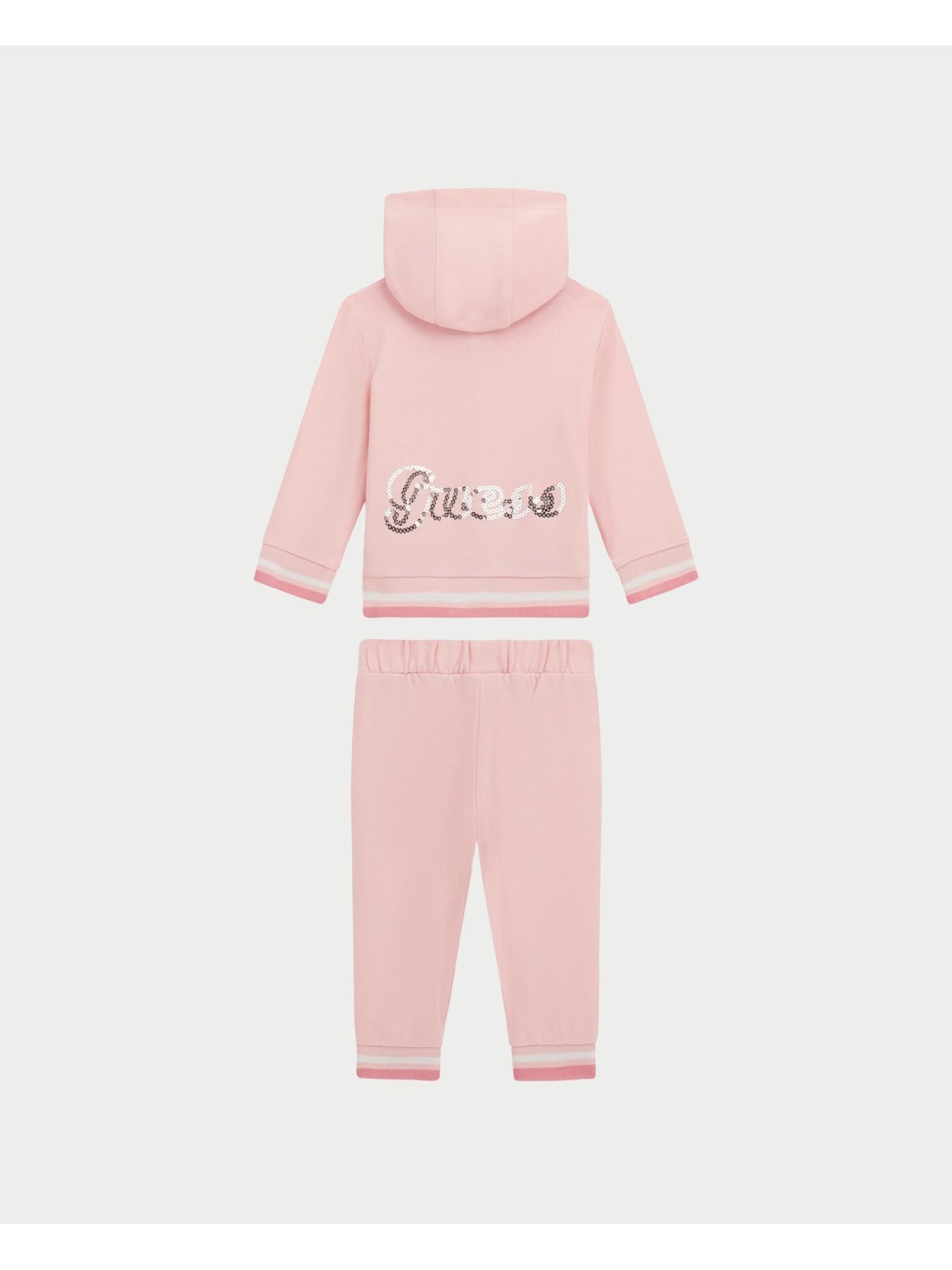 Tuta due pezzi bambina realizzata in felpa di cotone stretch. La felpa presenta apertura frontale con zip, cappuccio, polsini elastici sul fondo e sulle maniche, e logo in paillettes sul retro . I pantaloni hanno vita elasticizzata con coulisse, polsini sul fondo e sono in fantasia tinta unita con logo in paillettes.