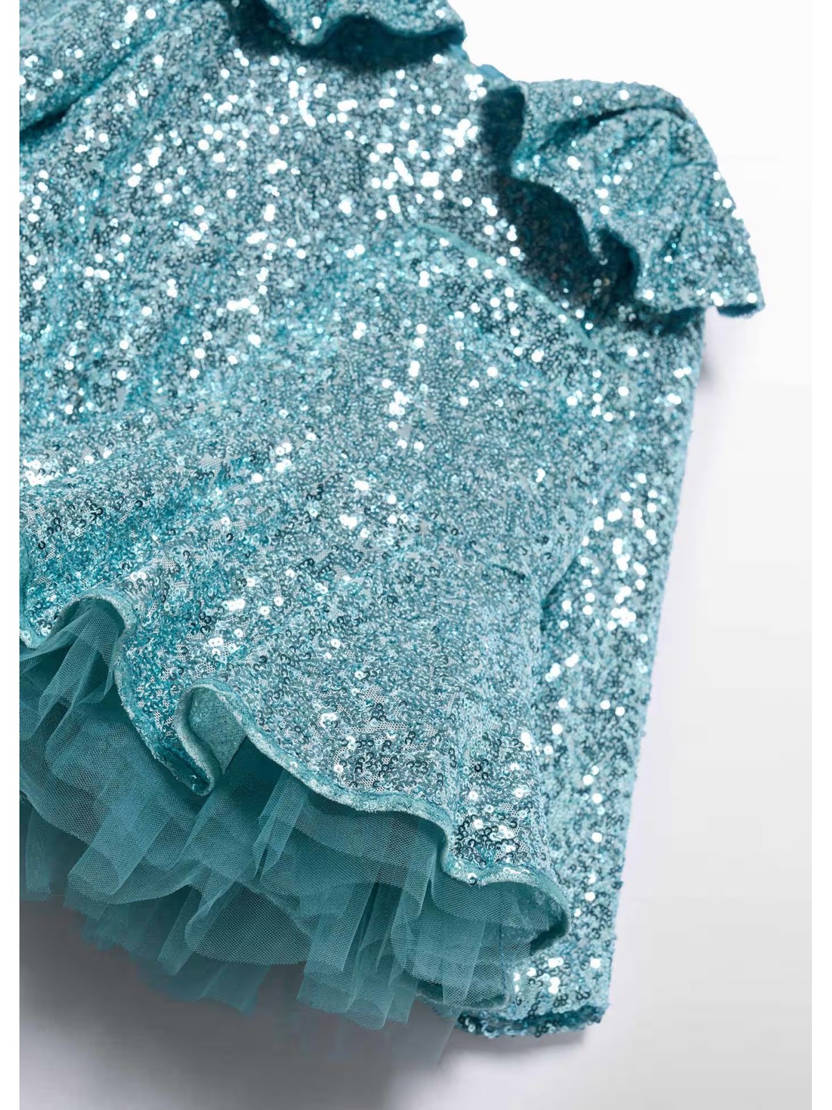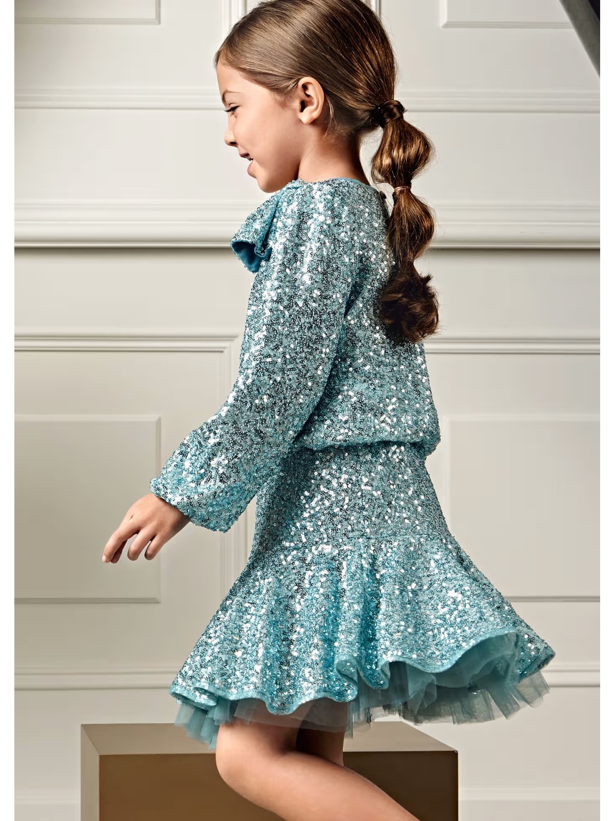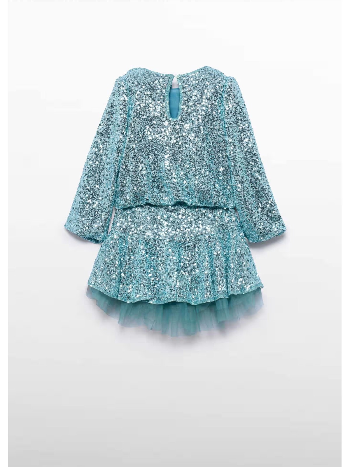 Completo due pezzi con lustrini composto da: blusa girocollo manica lunga ,apertura con bottone sul retro, applicazione fiocchi frontale ,ed elastico sul fondo. Gonna con elastico in vita.