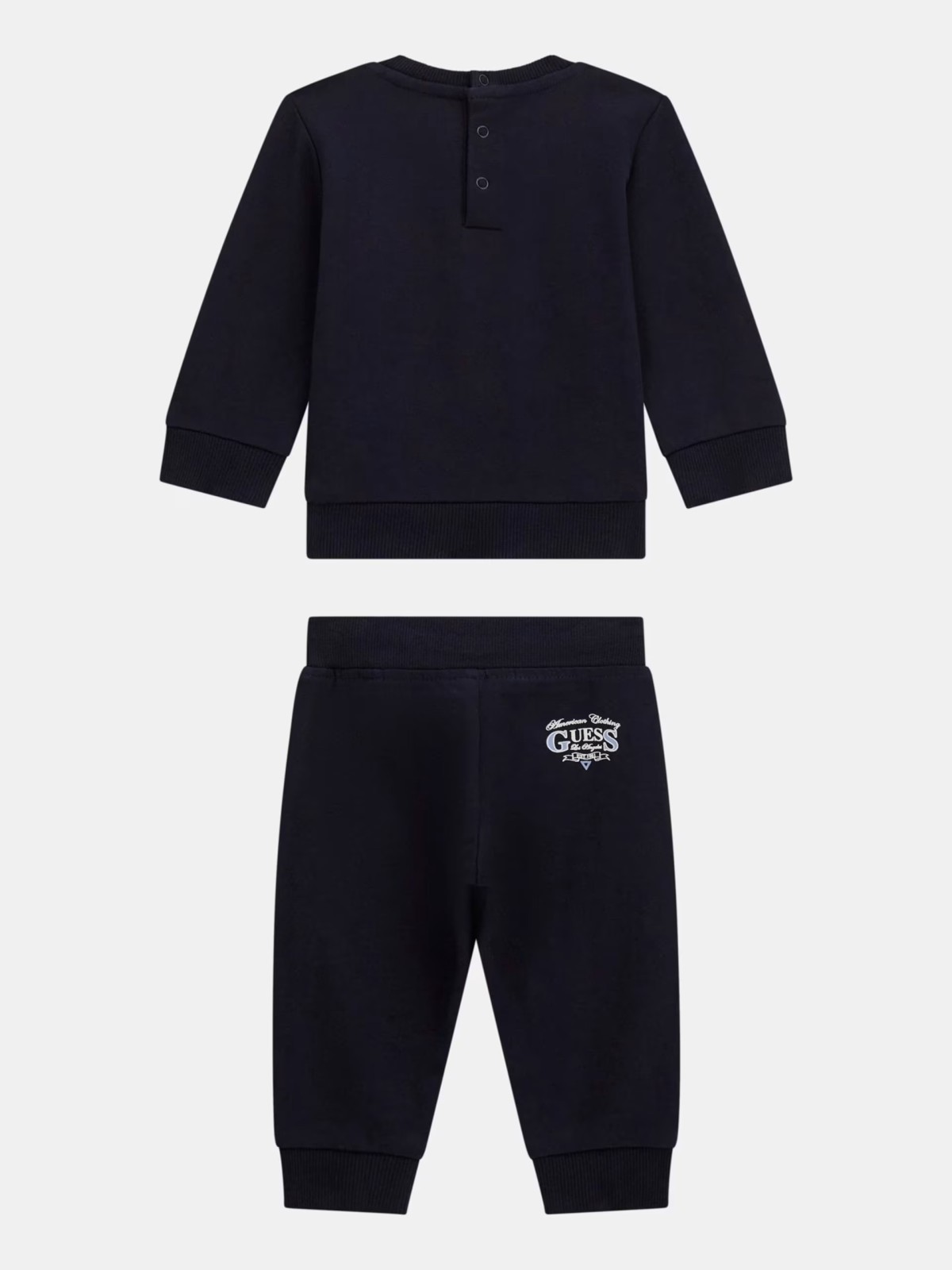 Tuta per bambino in felpa 100% cotone La felpa è girocollo con stampa frontale. Il pantalone ha vita elasticizzata con coulisse, stampa sul retro, e polsini sul fondo.