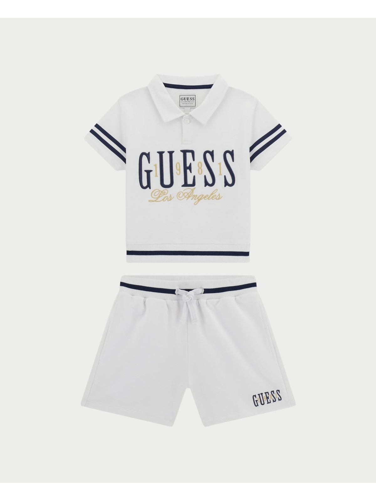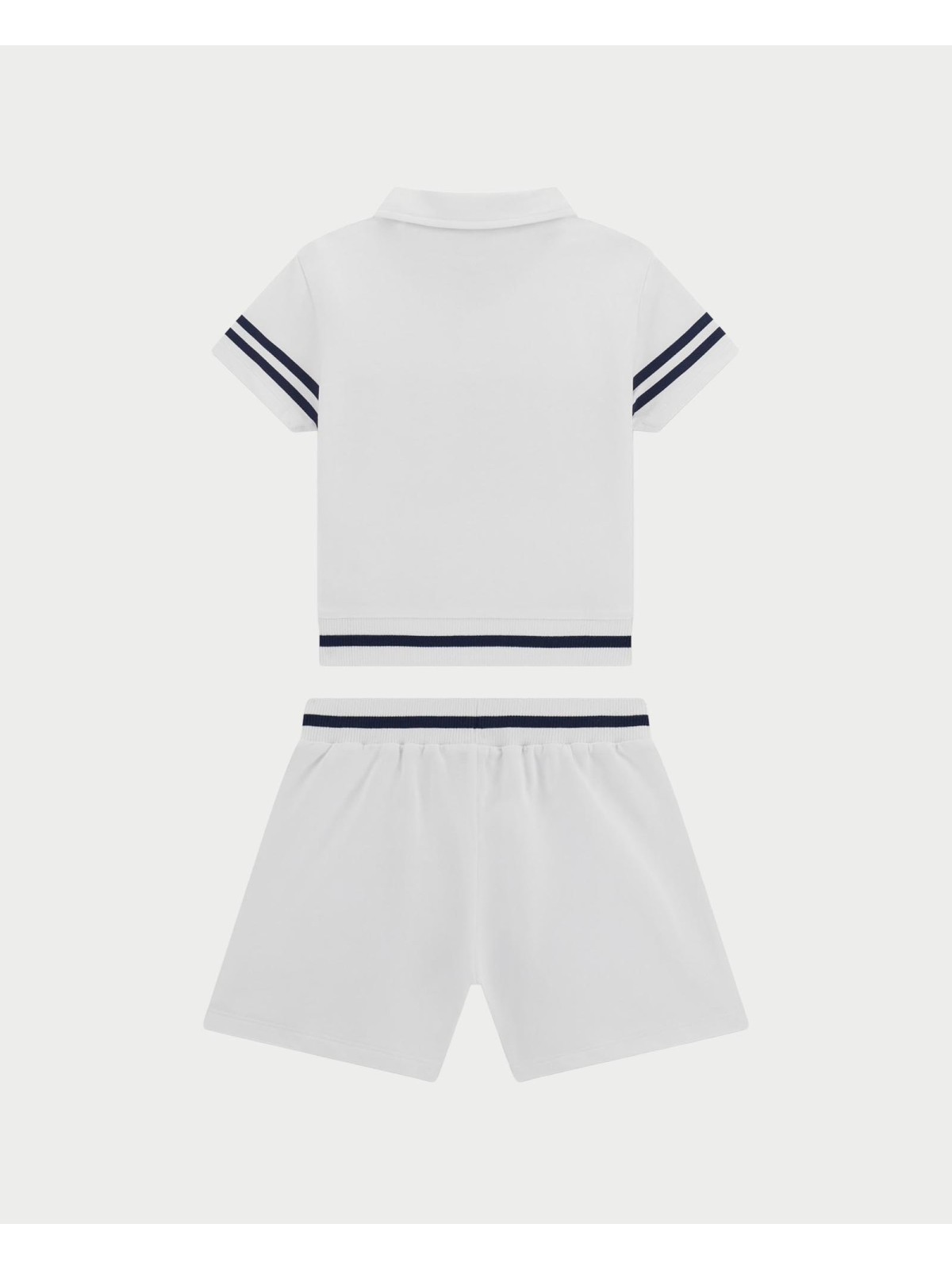 Compelto due pezzi composto da polo e pantaloncino. Polo mezza manica , apertura con bottoni,ricami e stampe frontali. Pantaloncino , con elastico in vita ,e ricamo logo .