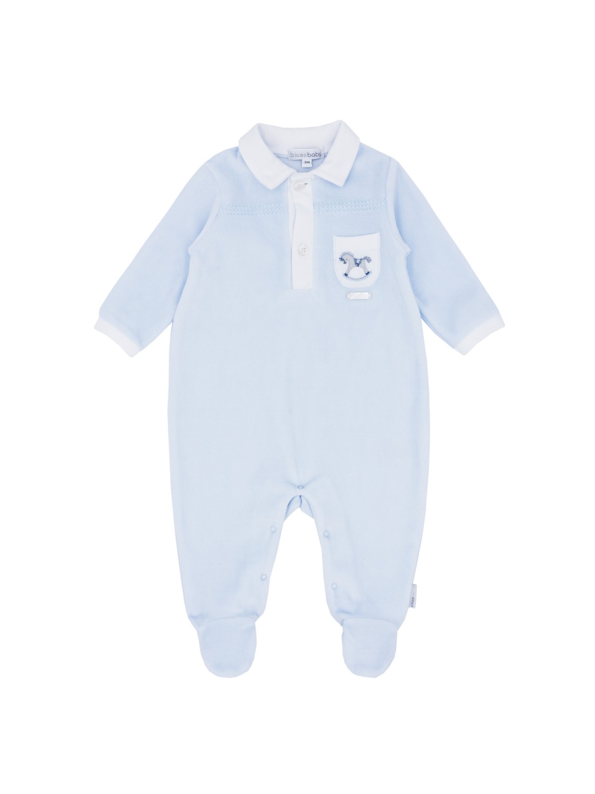 Tutina per neonato realizzata in ciniglia. Il modello presenta apertura sul retro e nel sottogamba con bottoni a pressione per agevolare il cambio e la vestizione. Modello polo , con applicazione frontale.
