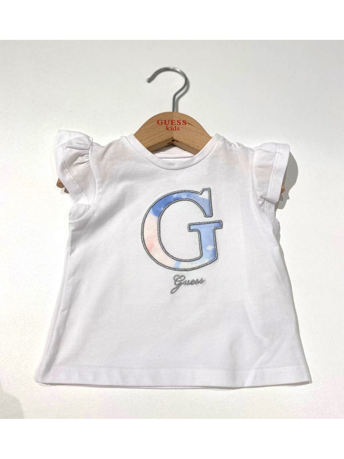 Completo 2 pezzi Guess .T-shirt in cotone mezza manica con logo e ricamo frontale. Gonna in organza con elastico in vita fantasia.
