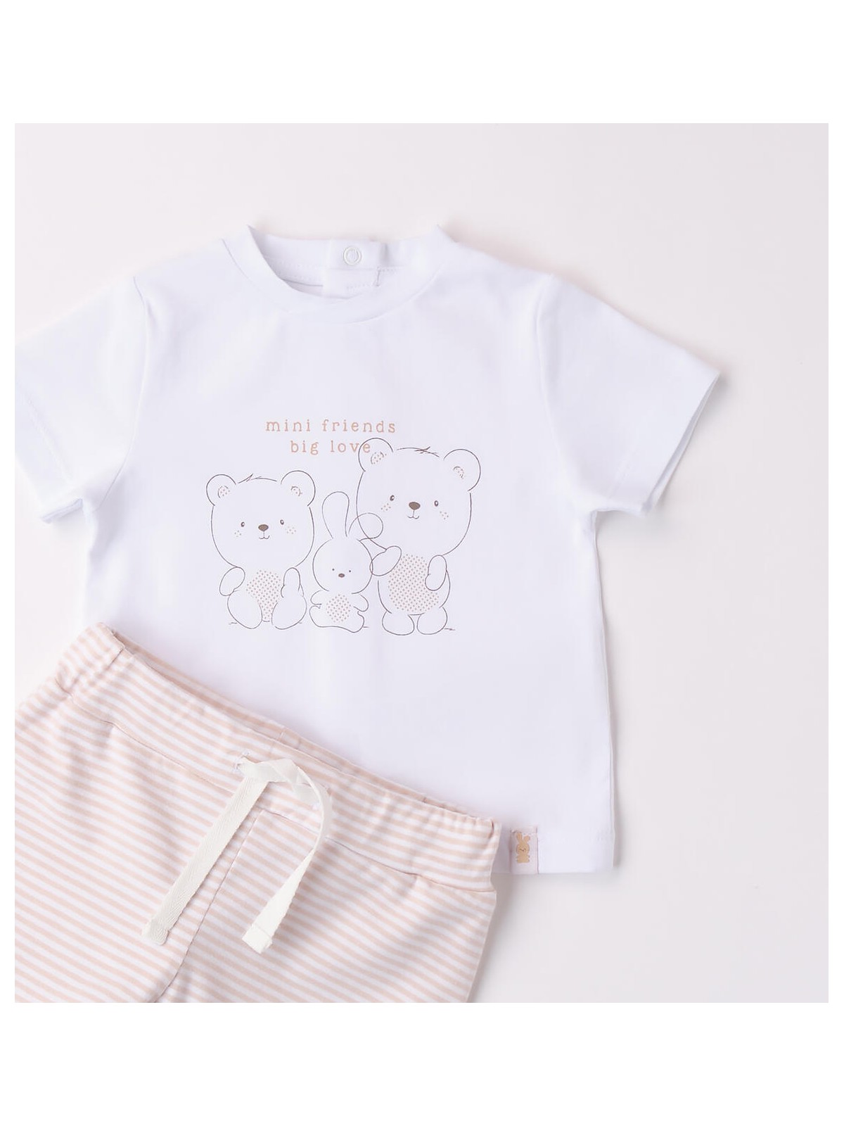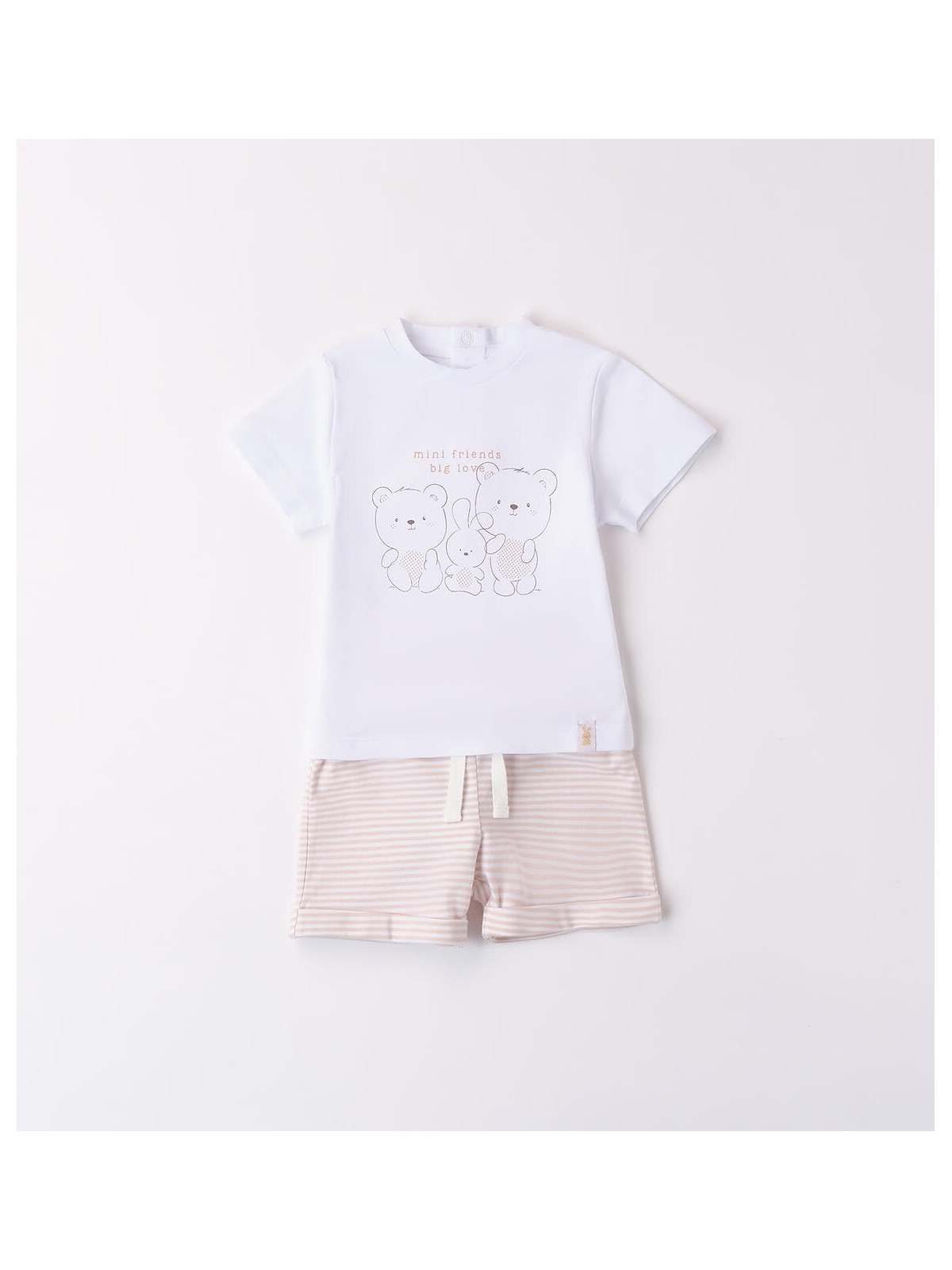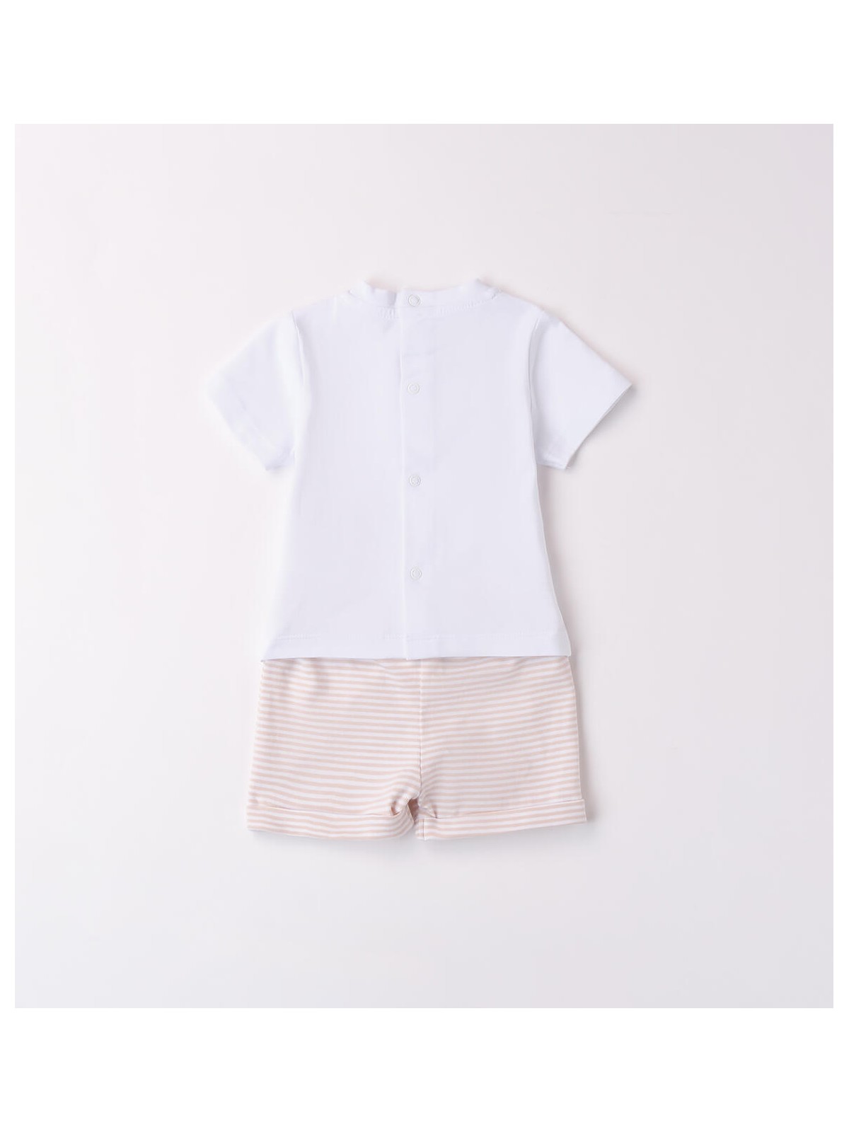 Completo per neonato unisex in jersey stretch di cotone. La t-shirt presenta apertura sul retro con bottoni a pressione, fantasia tinta unita e stampa frontale. I pantaloni hanno vita elasticizzata con coulisse e fantasia a righe