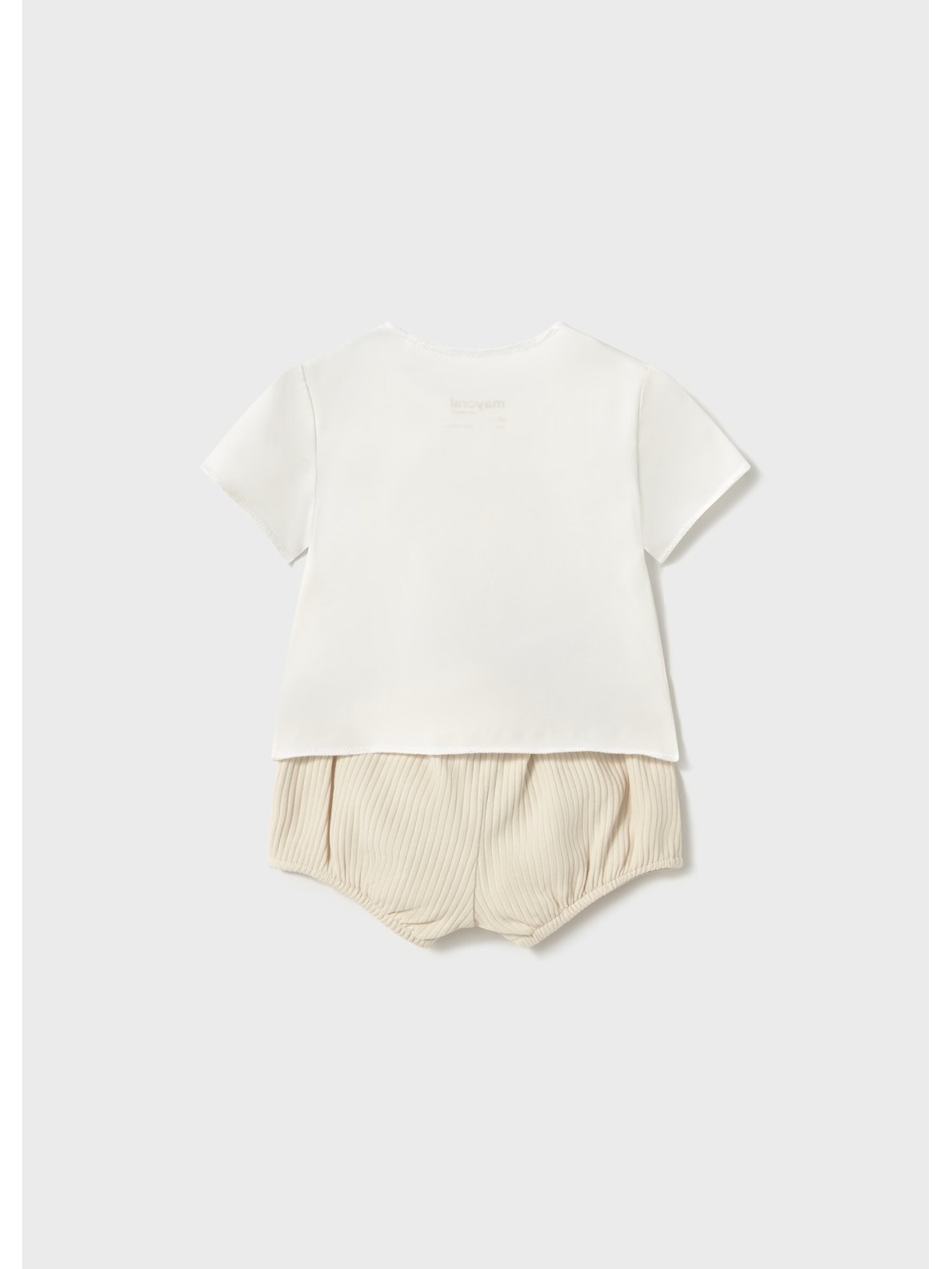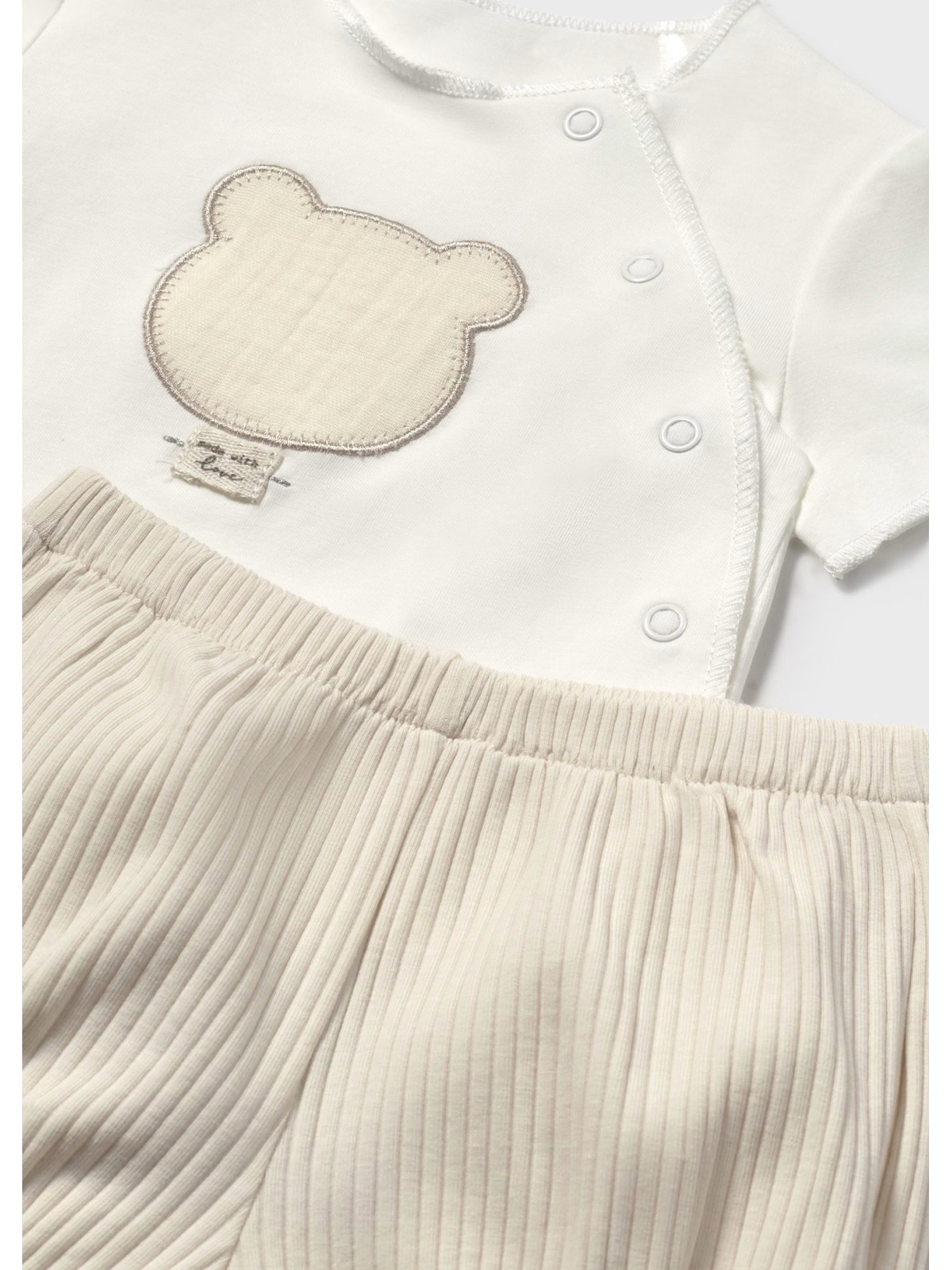 Completo neonato realizzato in cotone stretch. La maglietta è realizzata in jersey stretch di cotone e ha l'apertura frontale con bottoni a pressione, e applicazione. I pantaloni hanno vita elasticizzata.