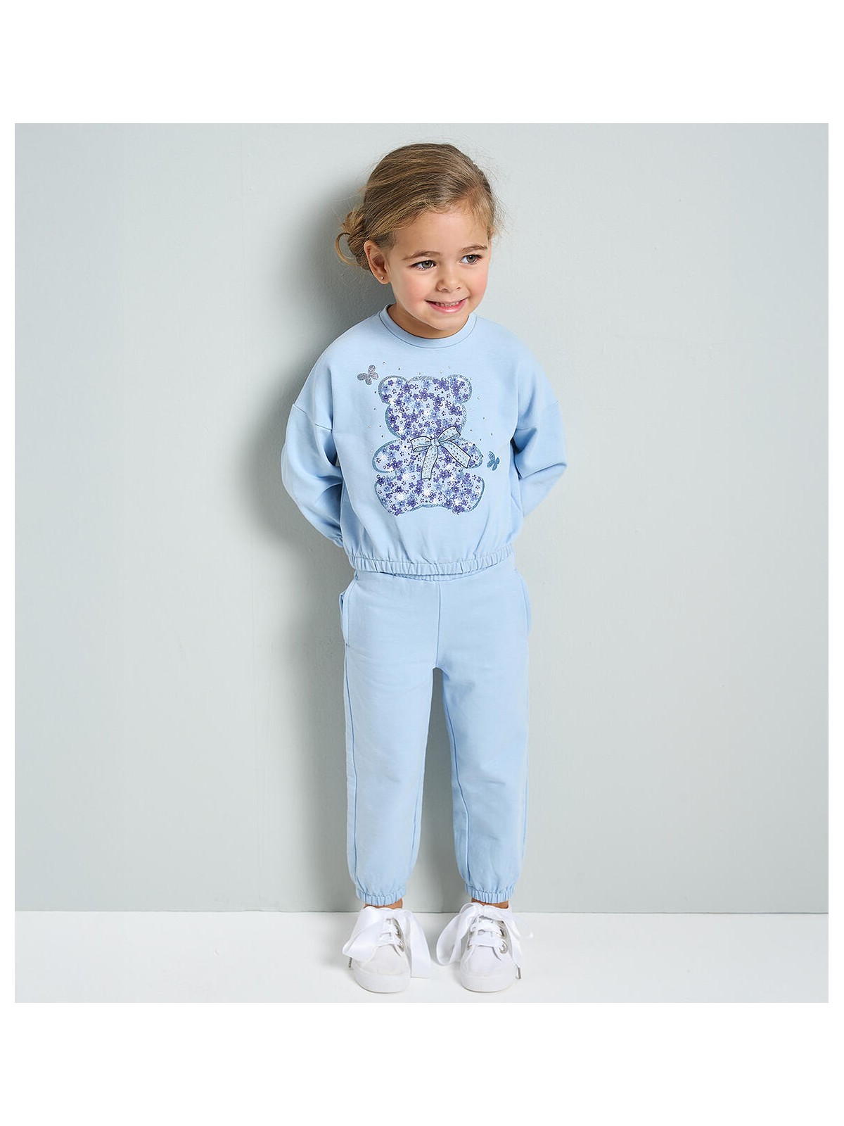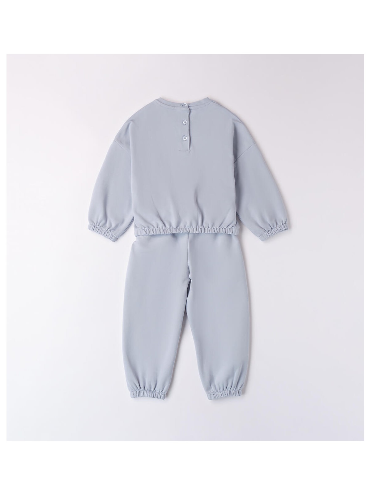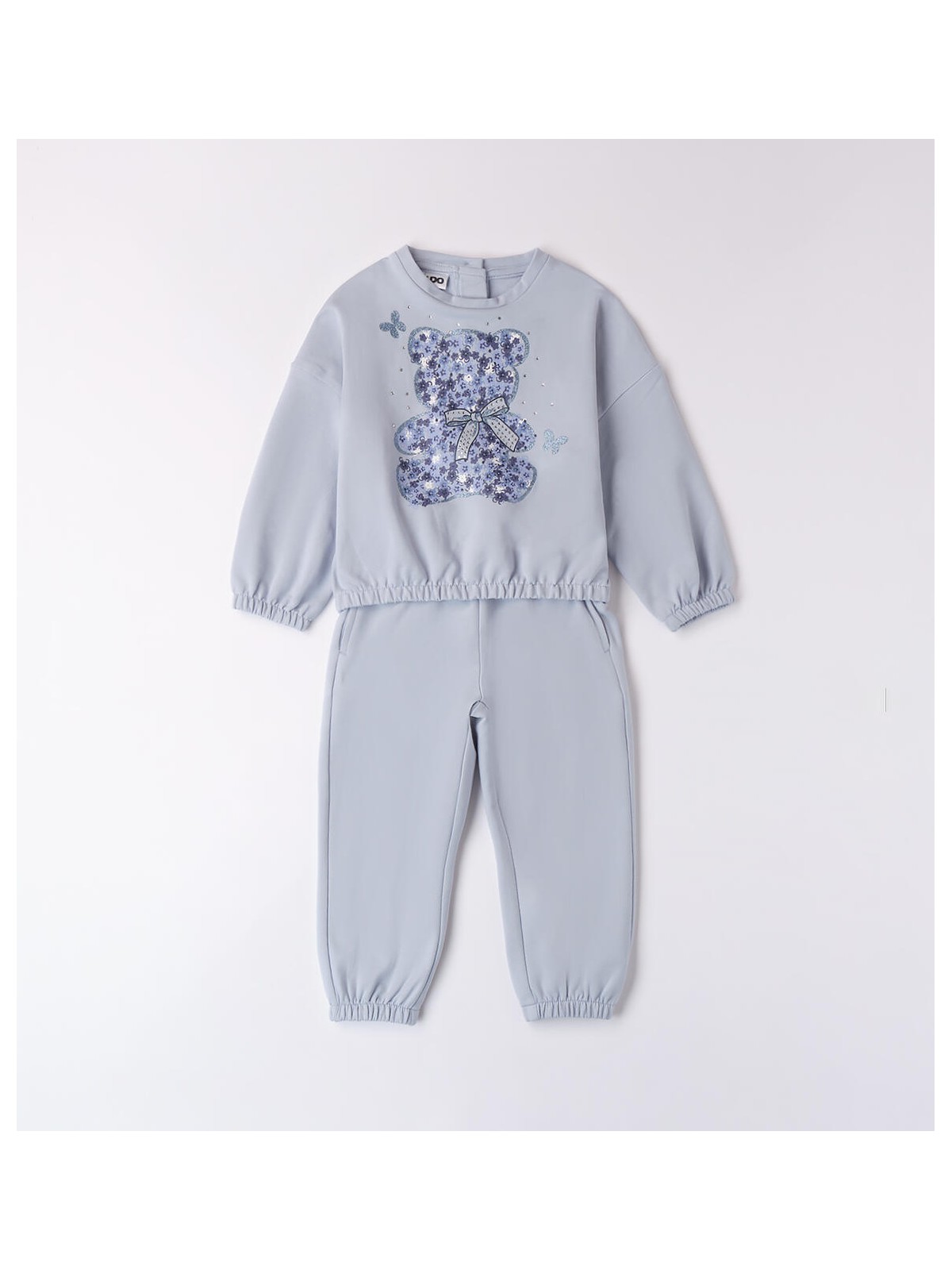 Tuta primavera due pezzi bambina da 9 mesi a 8 anni iDO realizzata in felpa di cotone stretch. La felpa presenta apertura sul retro con bottoni, polsini elastici sul fondo e sulle maniche, fantasia tinta unita e orsetto illuminato da strass e glitter. I pantaloni hanno vita elasticizzata, polsini sul fondo e sono in fantasia tinta unita