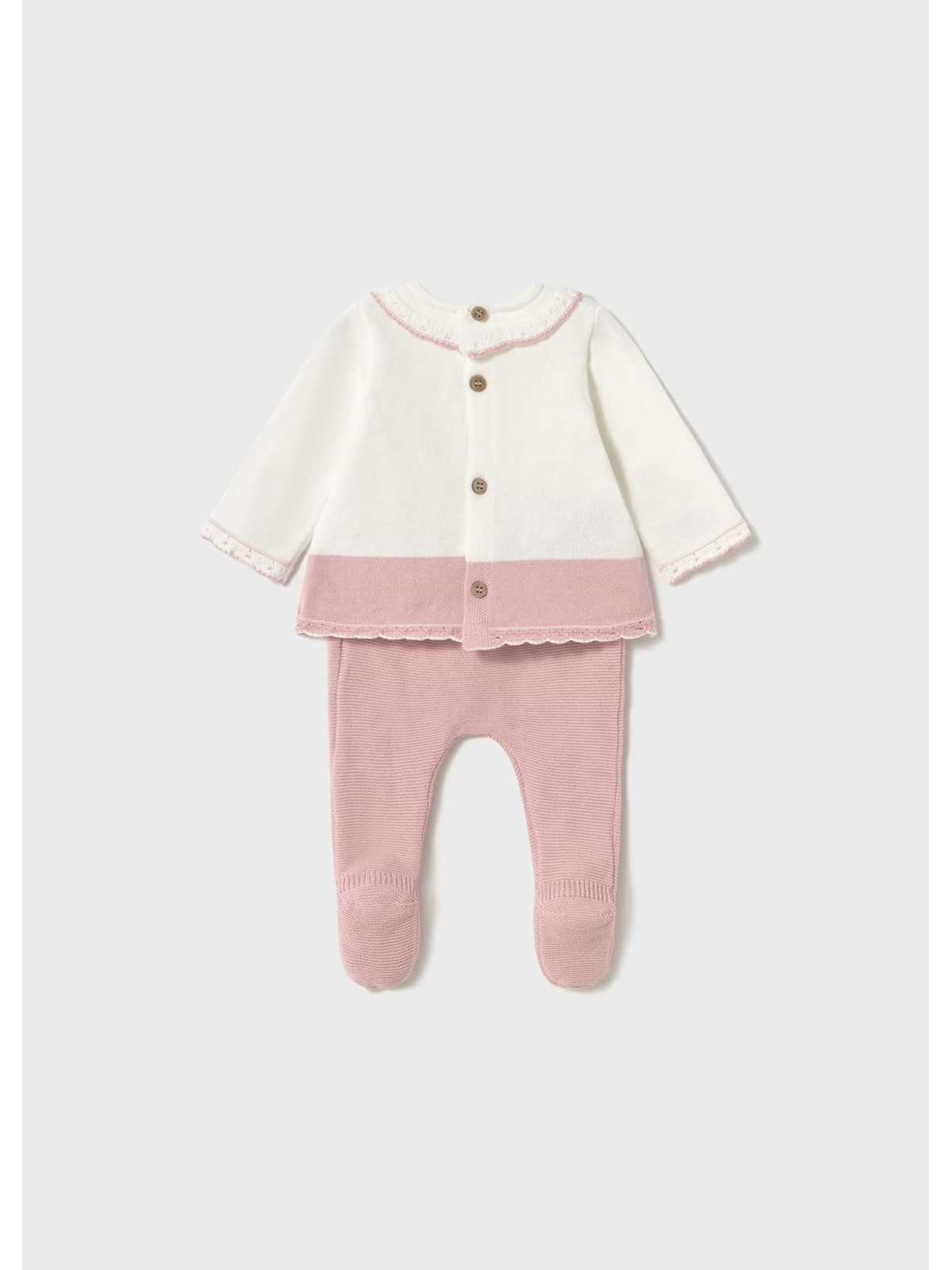 Completo nascita 2 pezzi in tricot .Sopra con apertura sul retro con bottoni, sotto ghettina con piedini ed elastico in vita