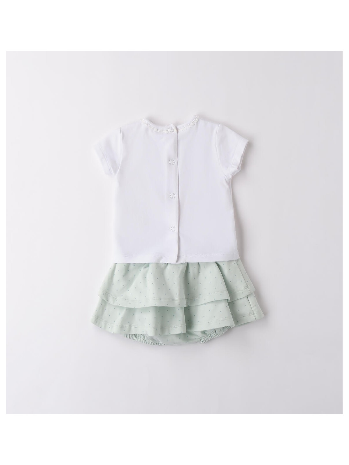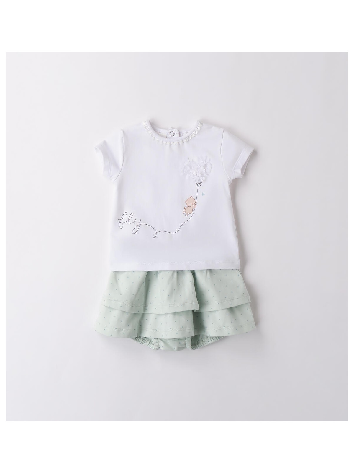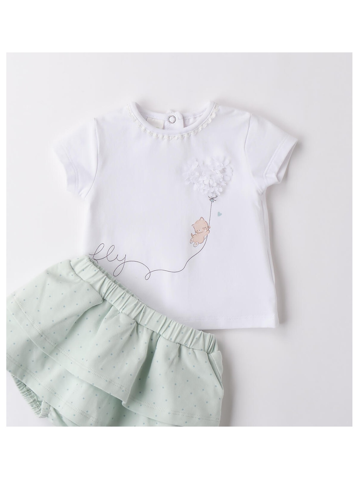 Completo neonata realizzato in jersey stretch di cotone. La maglietta ha l'apertura dietro con bottoni a pressione, stampa frontale e applicazioni. Shorts effetto gonna.