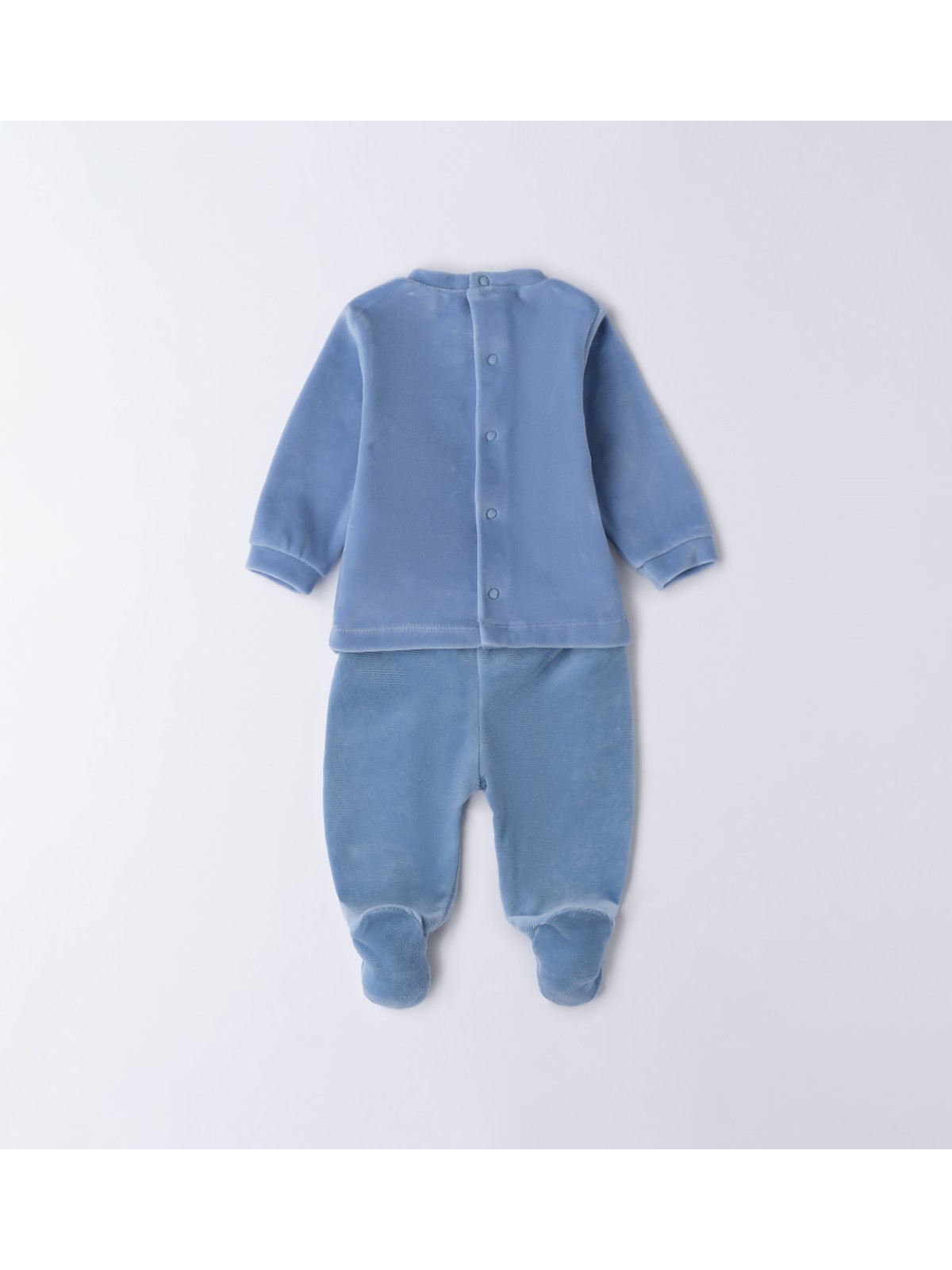 Completino in ciniglia neonato. Maglietta girocollo ricamo centrale , apertura sul retro con bottoni a pressione per agevolare il cambio e la vestizione. La ghettina presenta elastico in vita.