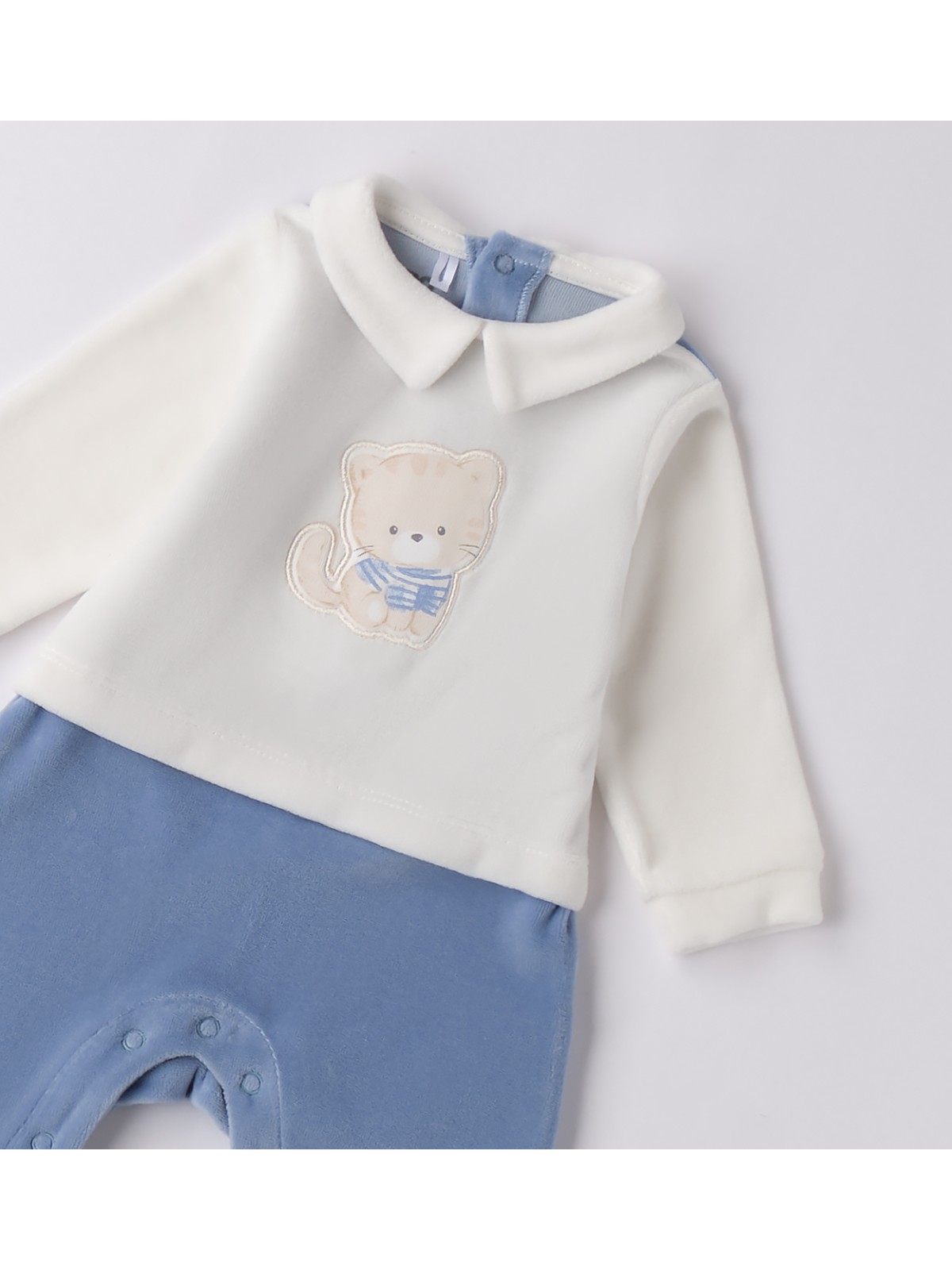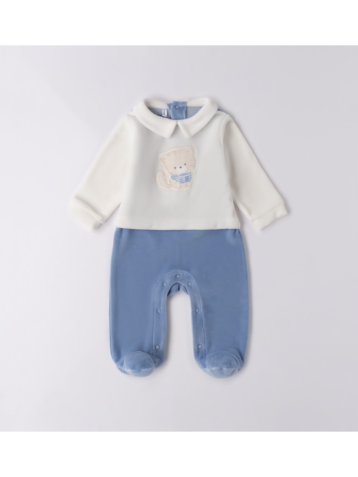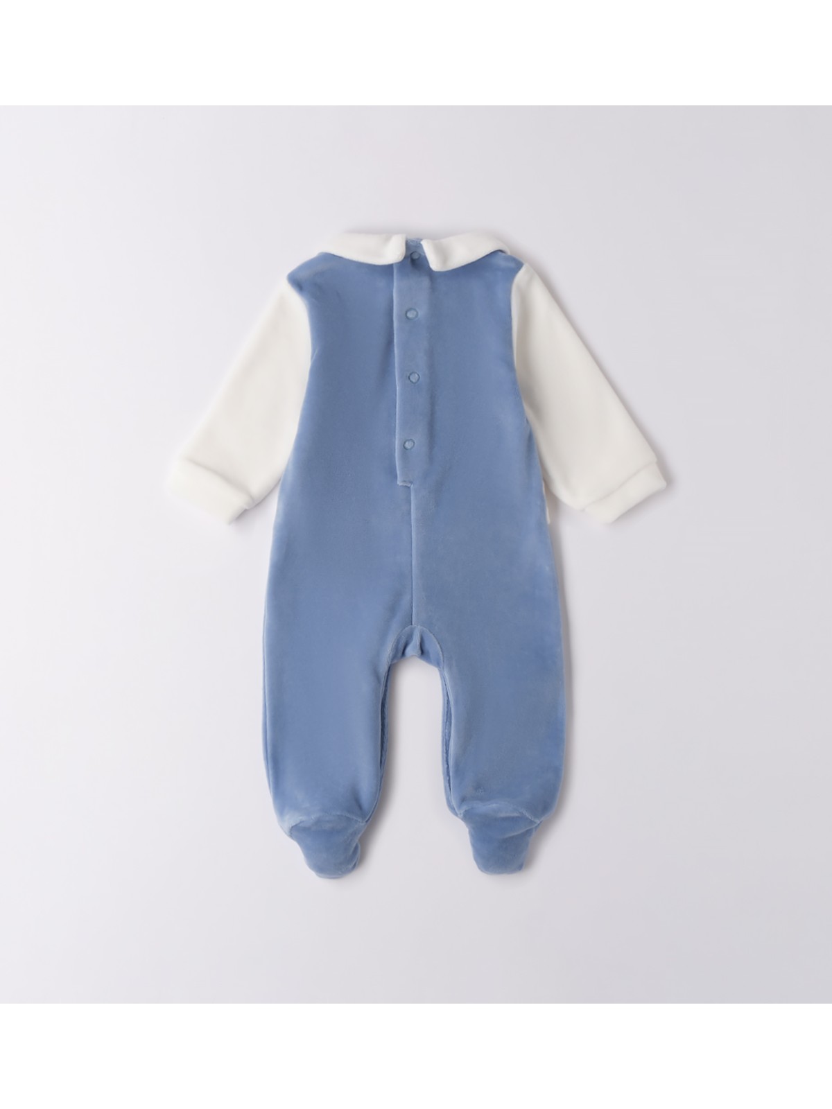 Tutina per neonato In ciniglia. Il modello presenta apertura sul retro e nel sottogamba con bottoni a pressione per agevolare il cambio e la vestizione. La tutina, è realizzata in fantasia bicolor di tinta unita e ricamo frontale.