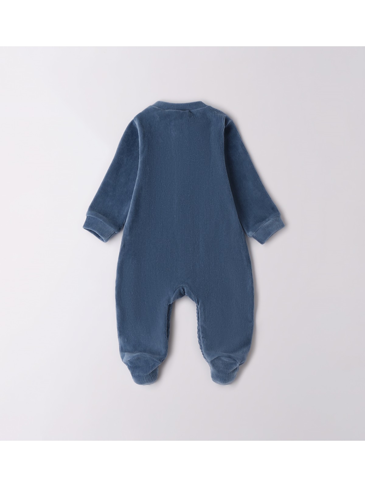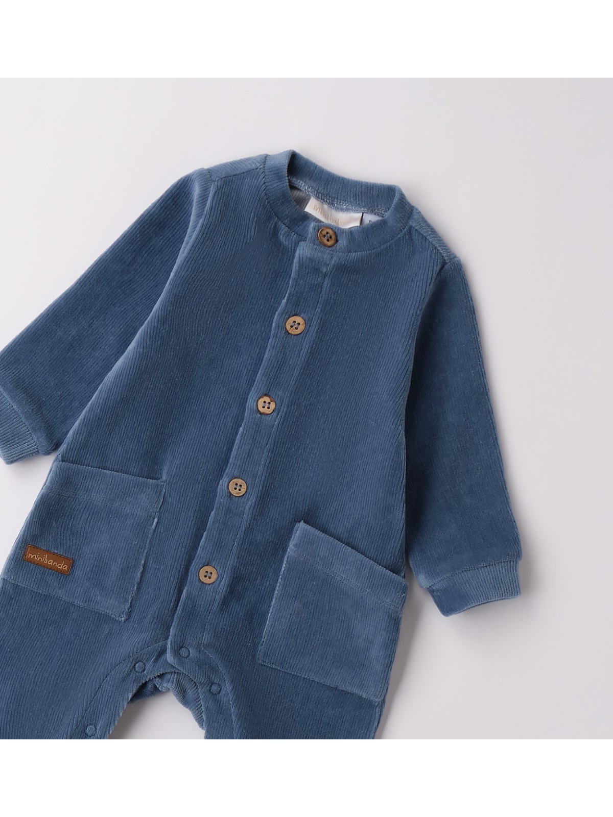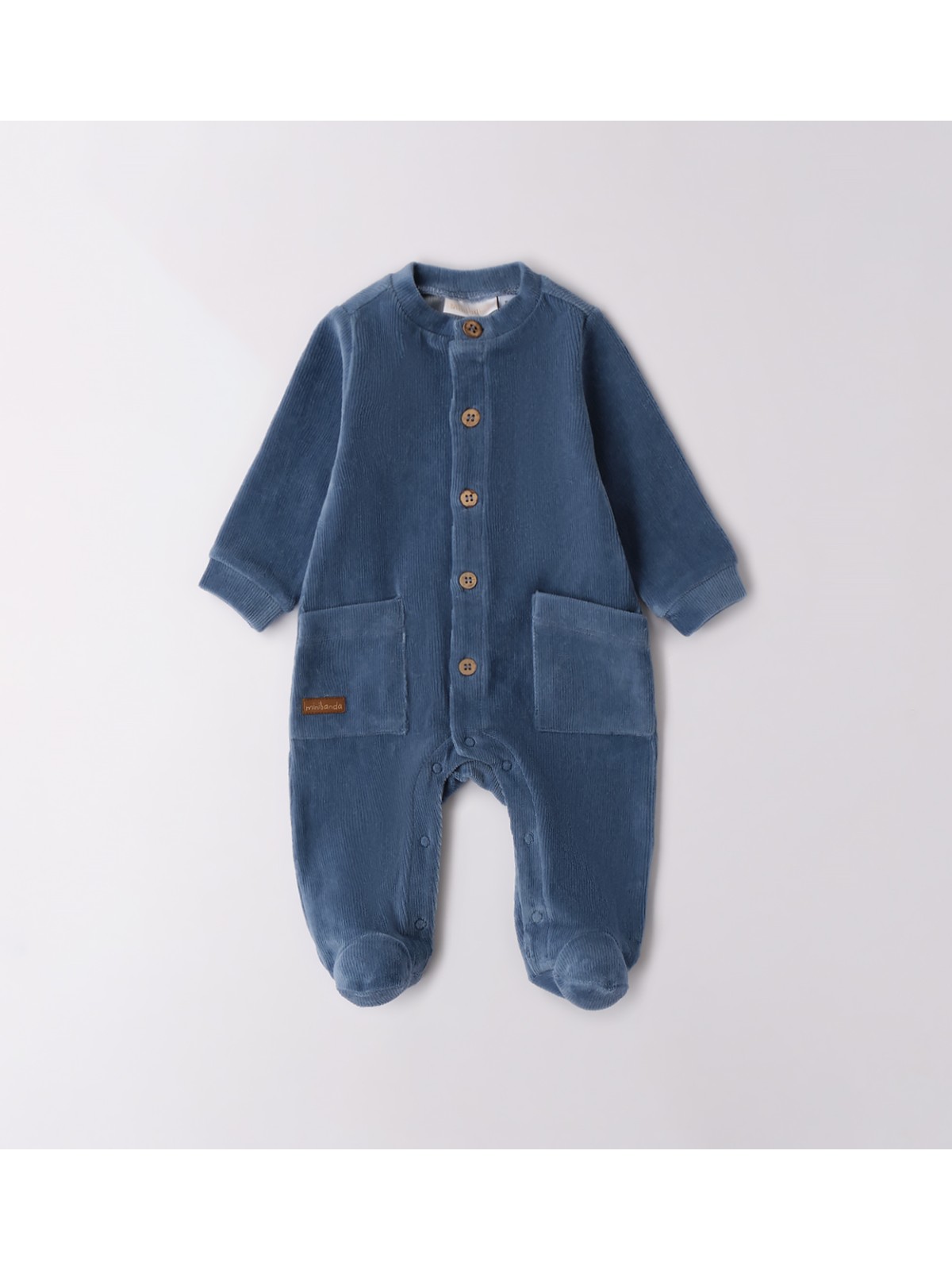 Tutina per neonato in ciniglia effetto velluto. Il modello presenta apertura davanti con bottoni a contrasto e nel sottogamba con bottoni a pressione per agevolare il cambio e la vestizione. La tutina è realizzata in fantasia tinta unita con tasche davanti