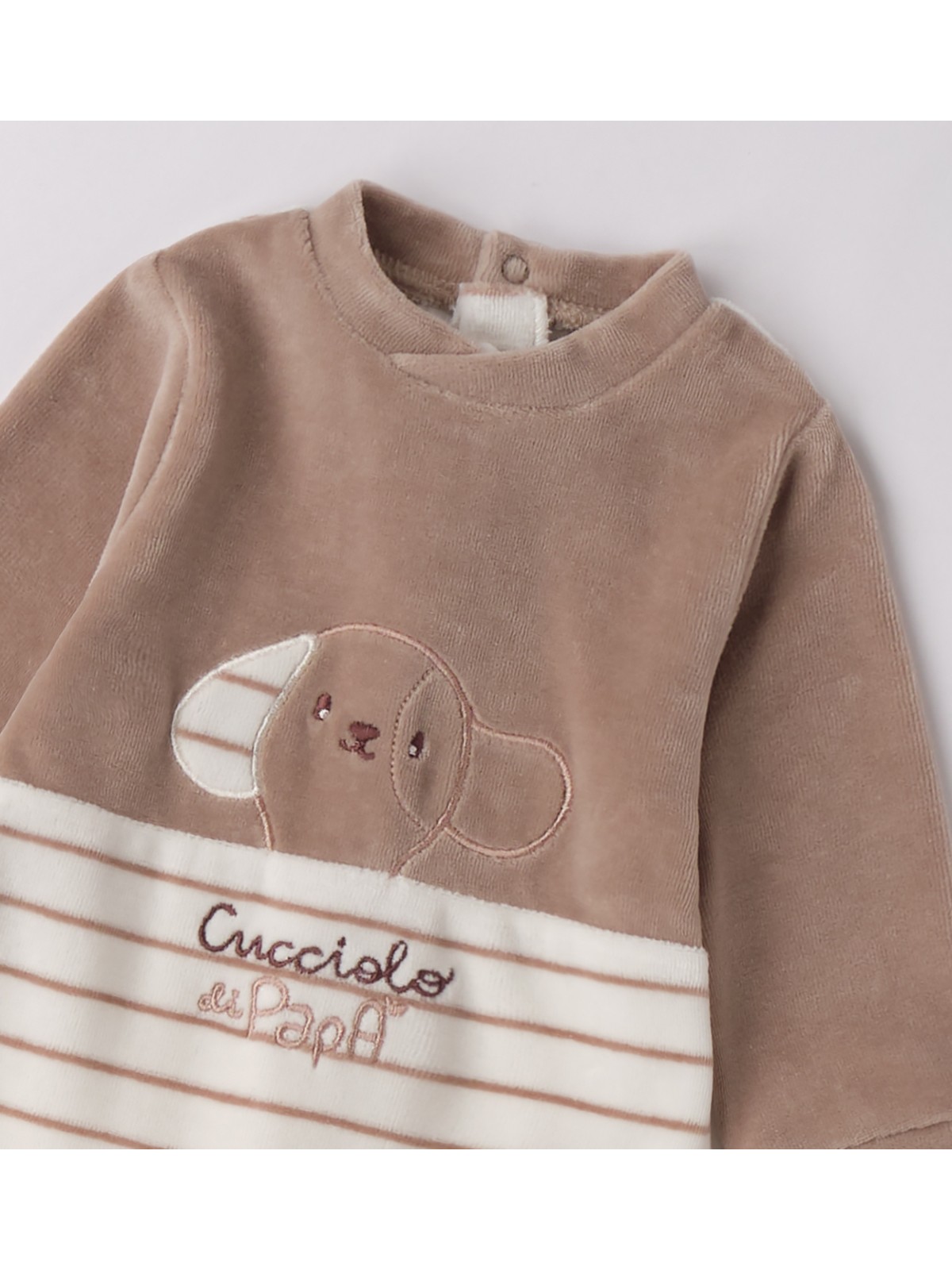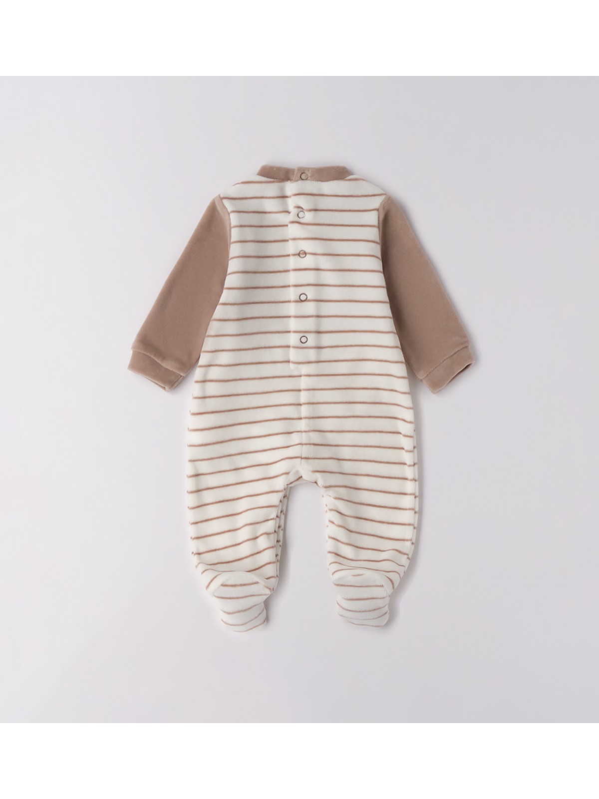 Tutina intera con piede per neonato in ciniglia. Il modello presenta apertura sul retro e nel sottogamba con bottoni a pressione per agevolare il cambio e la vestizione.