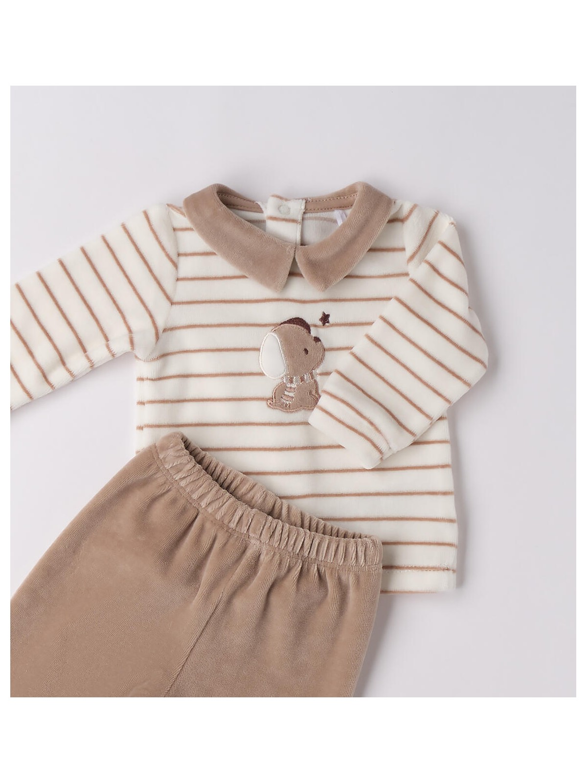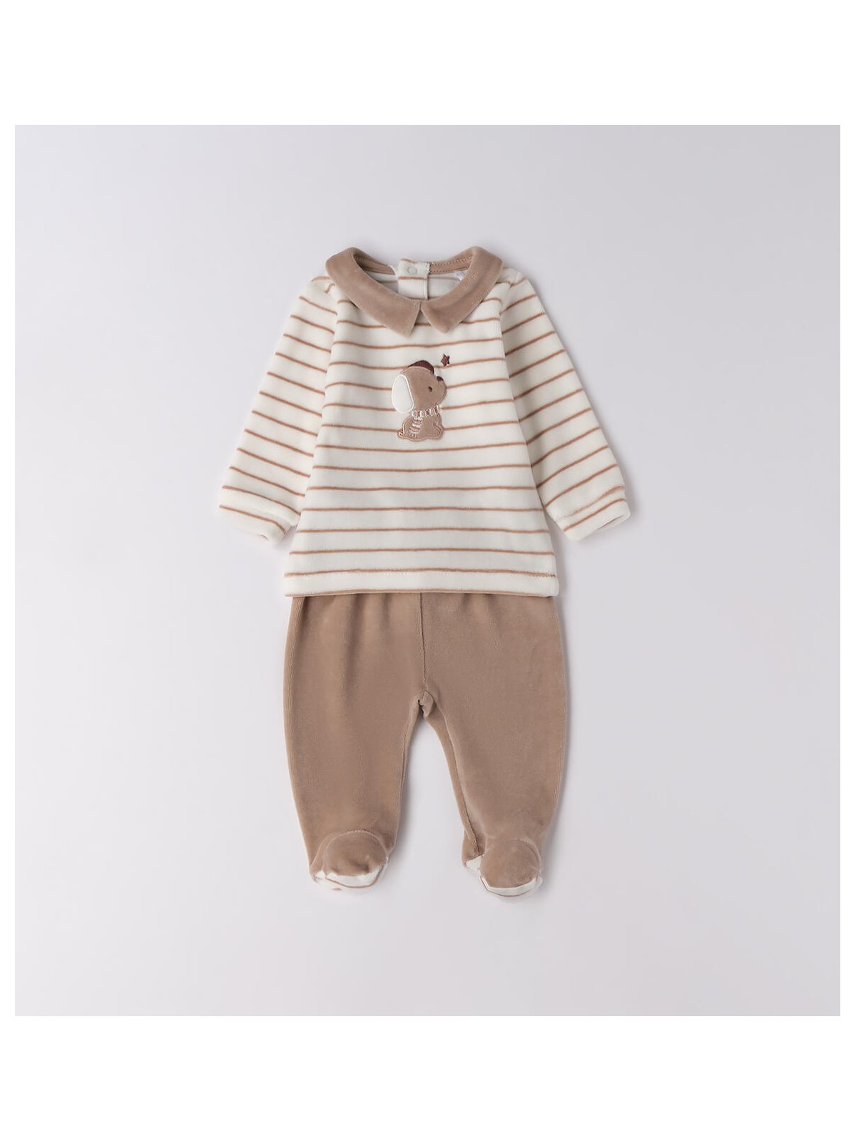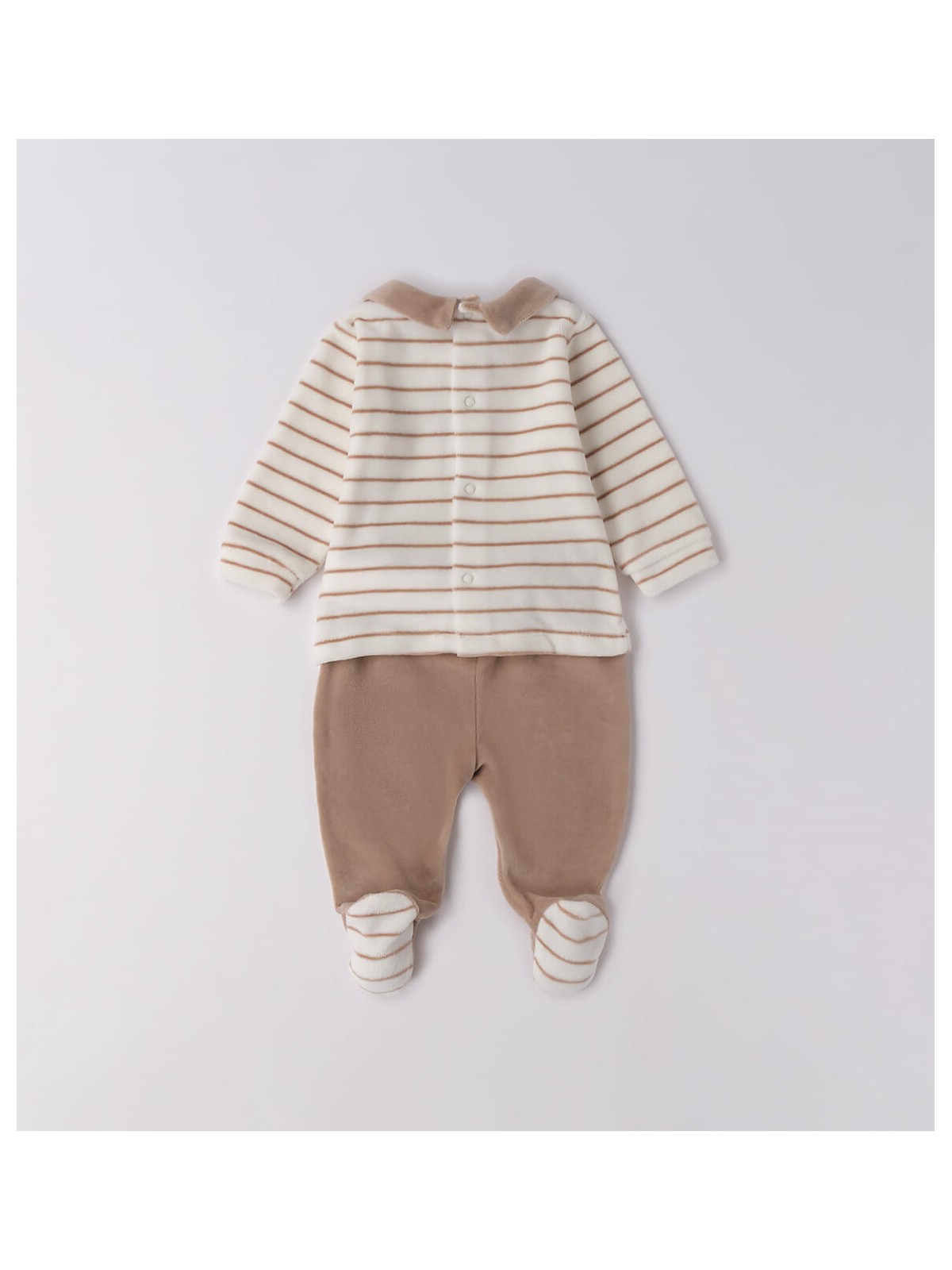 Tutina due pezzi con piede per neonato in ciniglia. L'articolo presenta l'apertura sul retro con bottoni a pressione per agevolare il cambio e la vestizione, fantasia a righe. I pantaloni hanno l'elastico in vita, fantasia tinta unita.