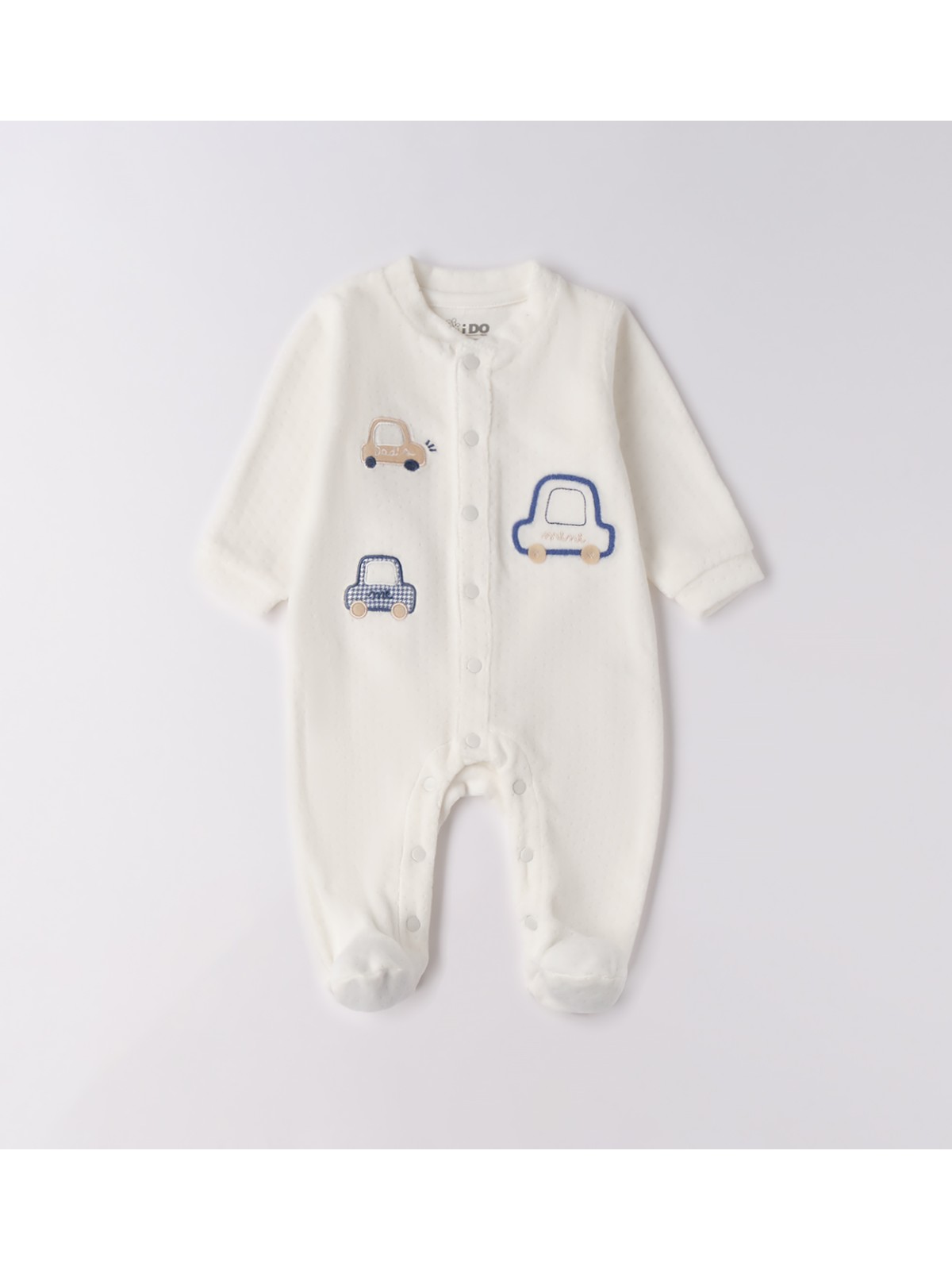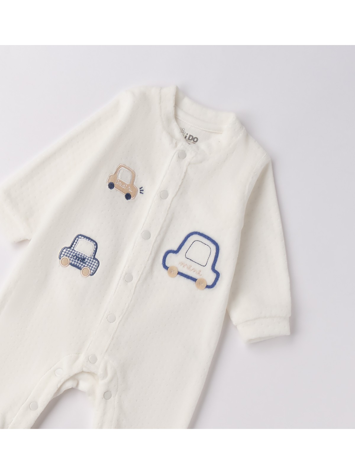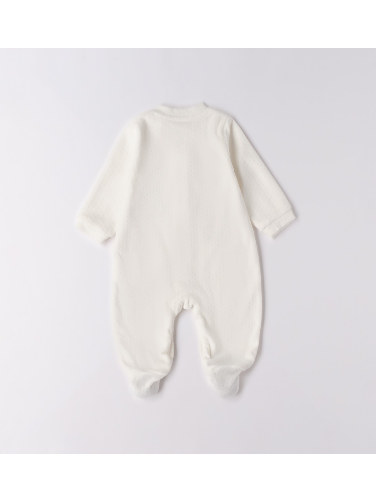 Tutina per neonato mesi in ciniglia. Il modello presenta apertura davanti e nel sottogamba con bottoni a pressione per agevolare il cambio e la vestizione