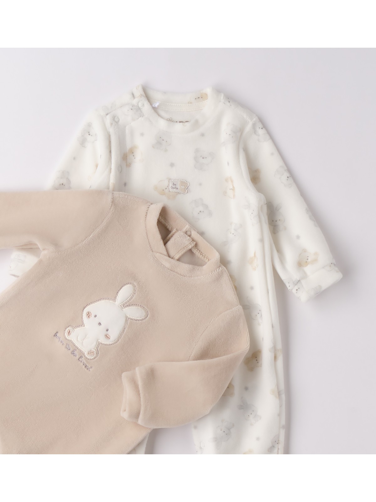 Tutina neonato in ciniglia. Il modello è unisex e presenta due varianti disponibili : Tortora tinta unita ricamo frontale , apertura con botton a pressione sul retro e sotto . Off-white con fantasia , apertura frontale e sotto con bottoni a pressione .