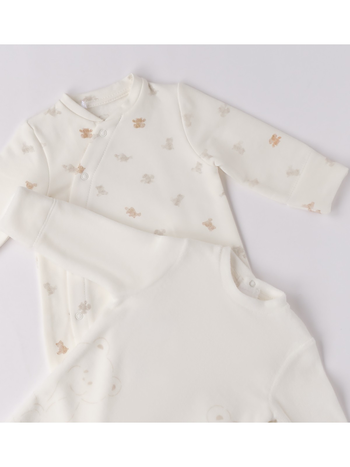Tutina neonato modello unisex e presenta due varianti disponibili :Modello fantasia ,tessuto in felpa, apertura frontale e sotto con bottoni a pressione . Modello off-white , tessuto in ciniglia , apertura sul retro e sotto con bottoni a pressione per agevolare la vestizione.