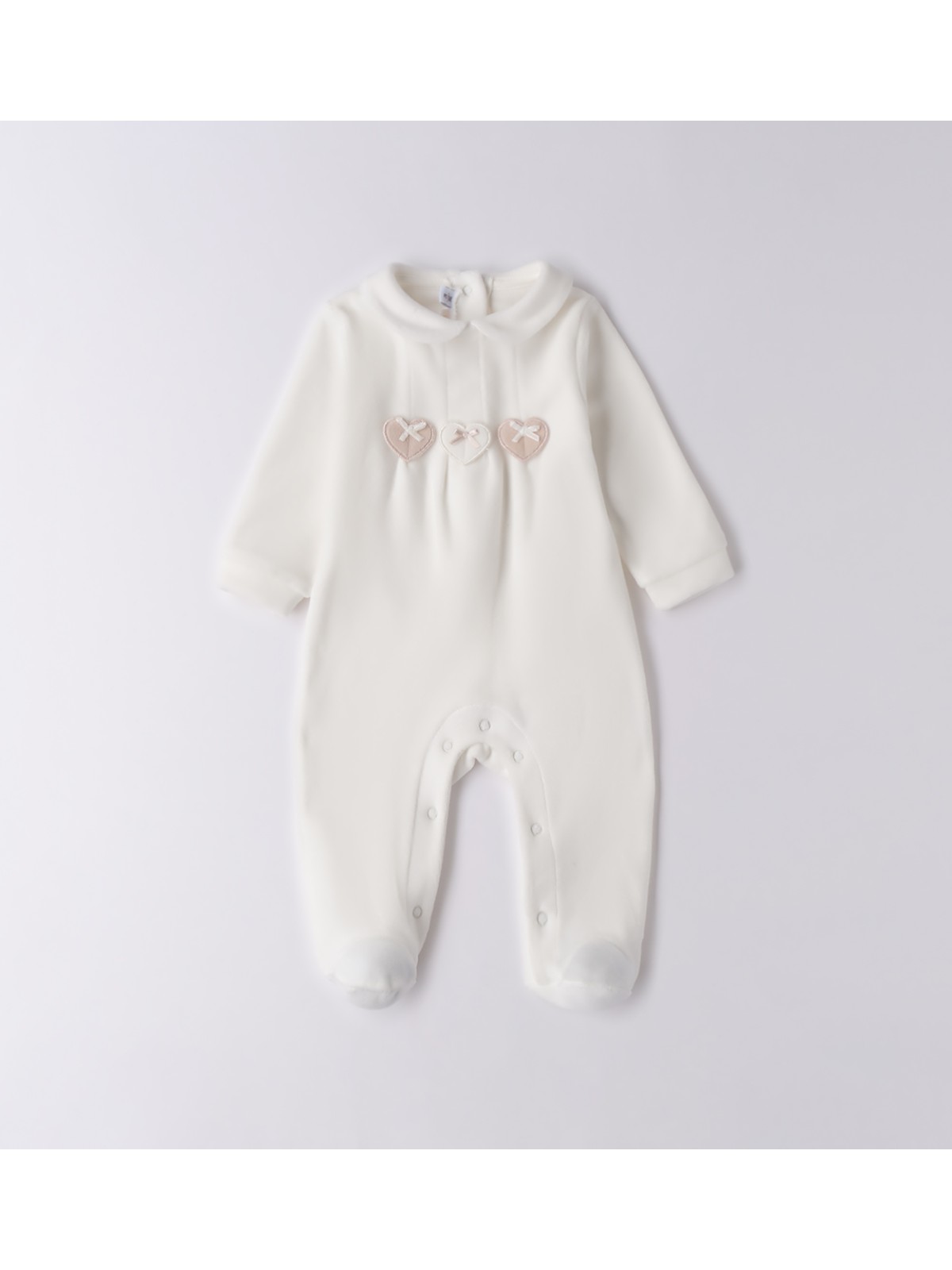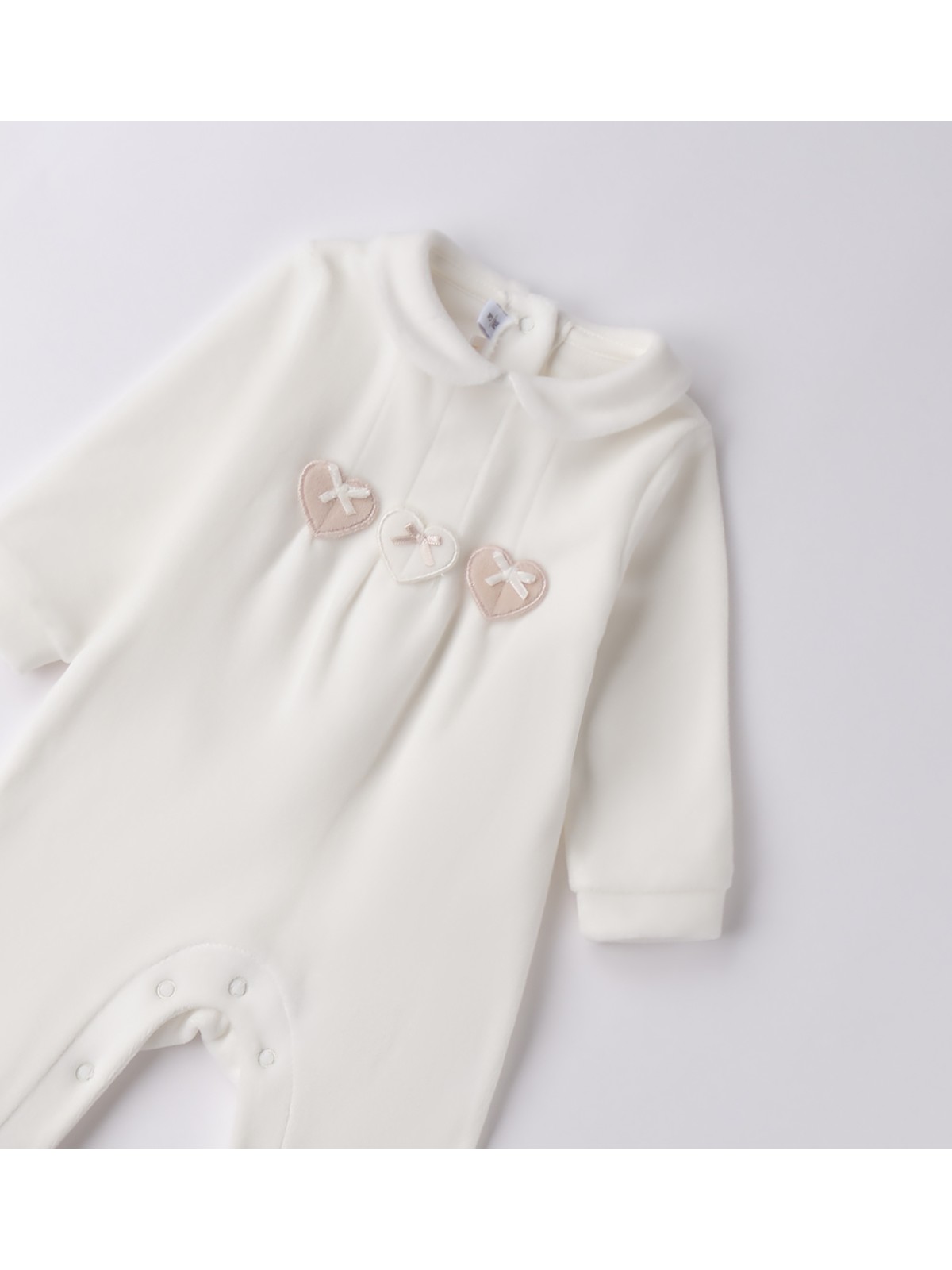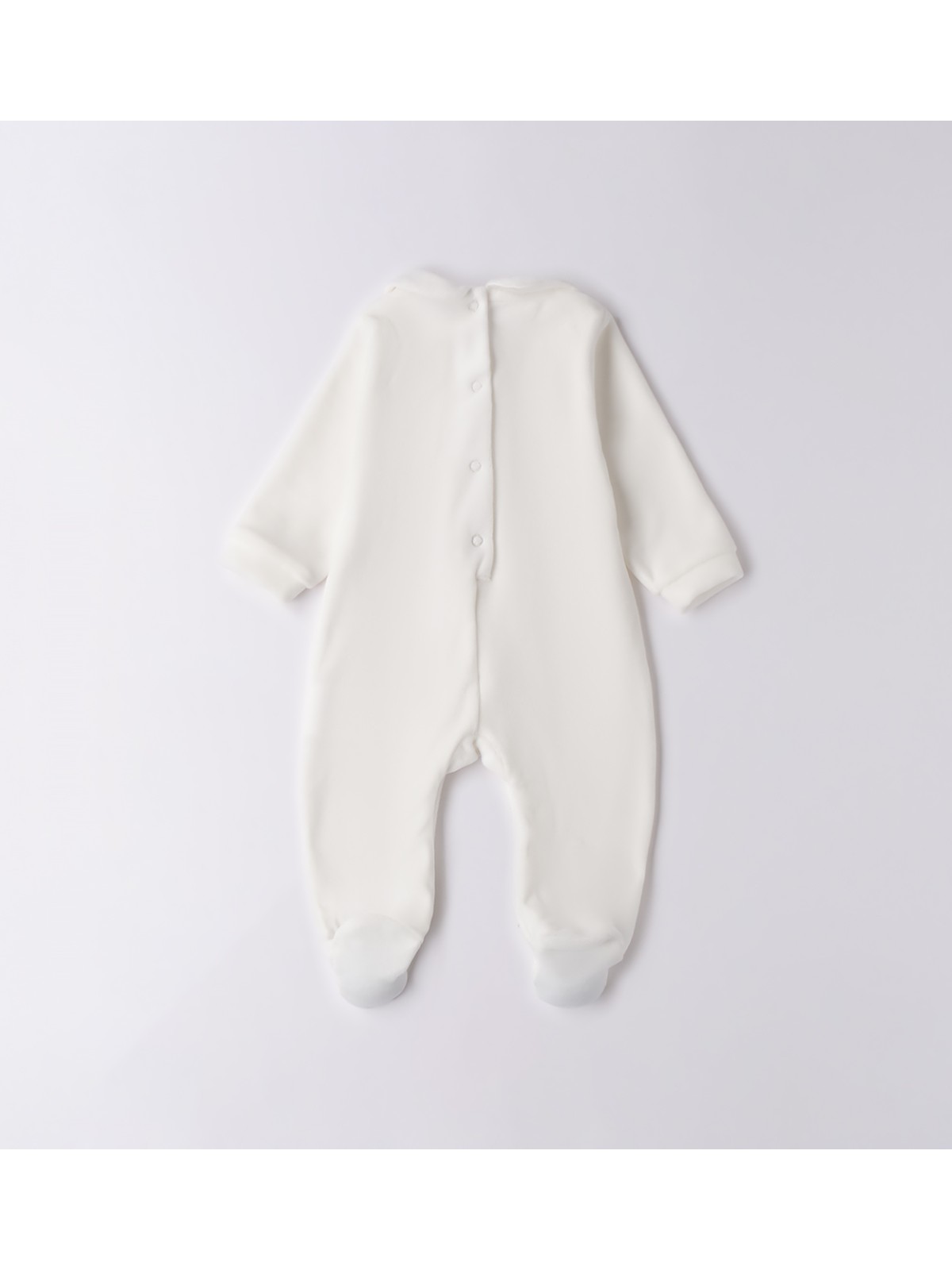 Tutina per neonata in ciniglia. Il modello presenta apertura sul retro e nel sottogamba con bottoni a pressione per agevolare il cambio e la vestizione.