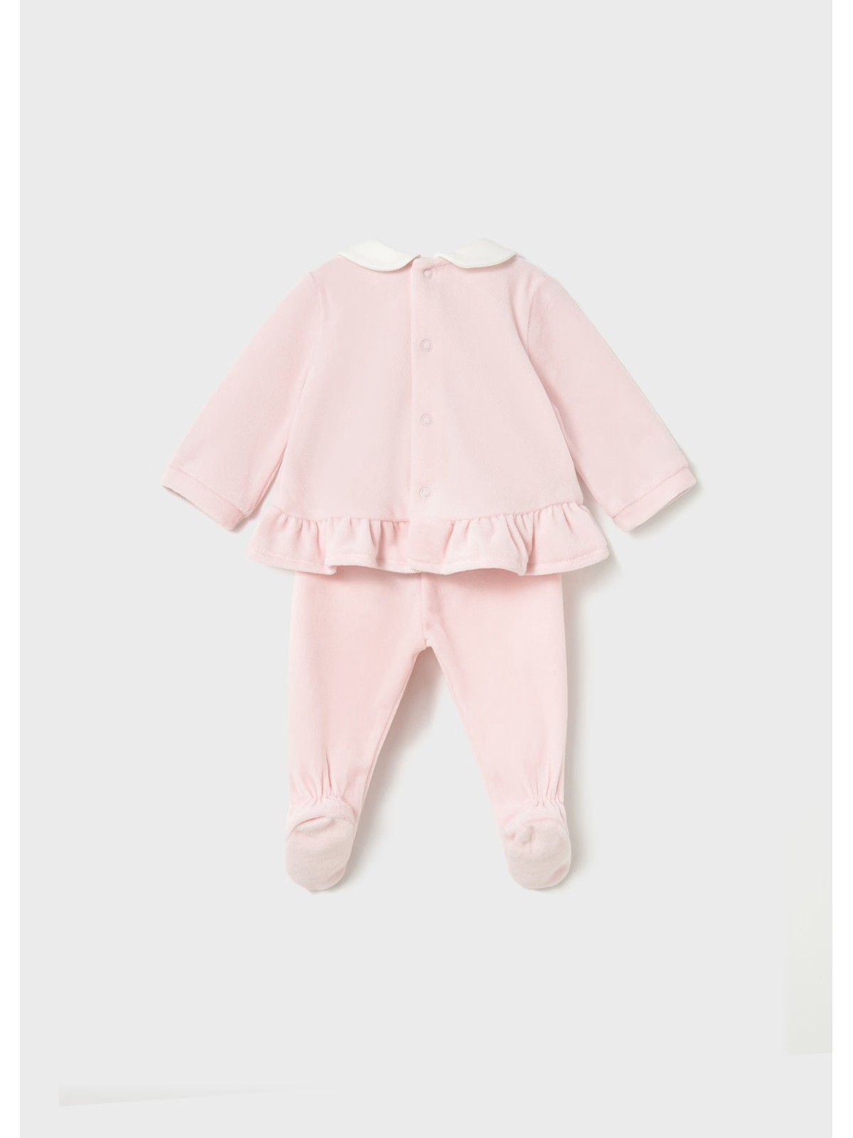 Questo completo per neonata è costituito da maglietta manica lunga con ghettina abbinata. Maglietta manica lunga per neonata. Colletto bebè. Chiusura con bottoni a pressione nella parte posteriore. Design con volant nella parte bassa. Elementi decorativi: applicazione floreale, ricami Pantalone con piedi modello ghettina. Elastico in vita