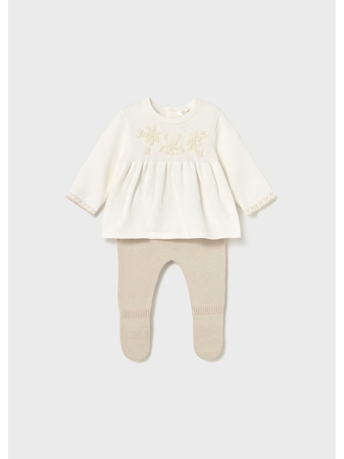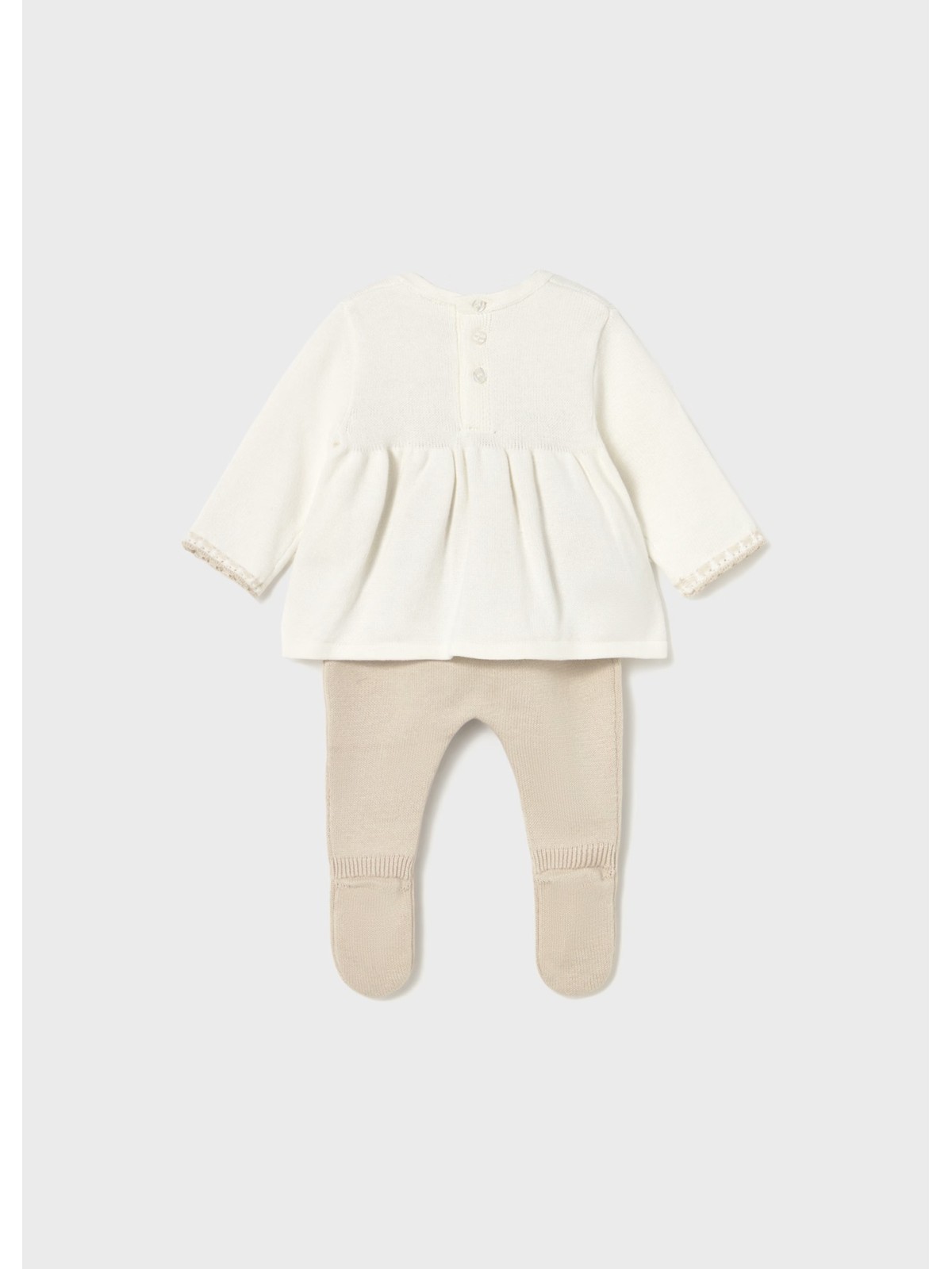 Questo completo in tricot di due pezzi per neonata è costituito da maglioncino e ghettina abbinata. Maglione manica lunga per neonata. Girocollo. Chiusura con bottoni sulla schiena per facilitare la vestibilità del capo. Modello con riccio. Elementi decorativi: ricami