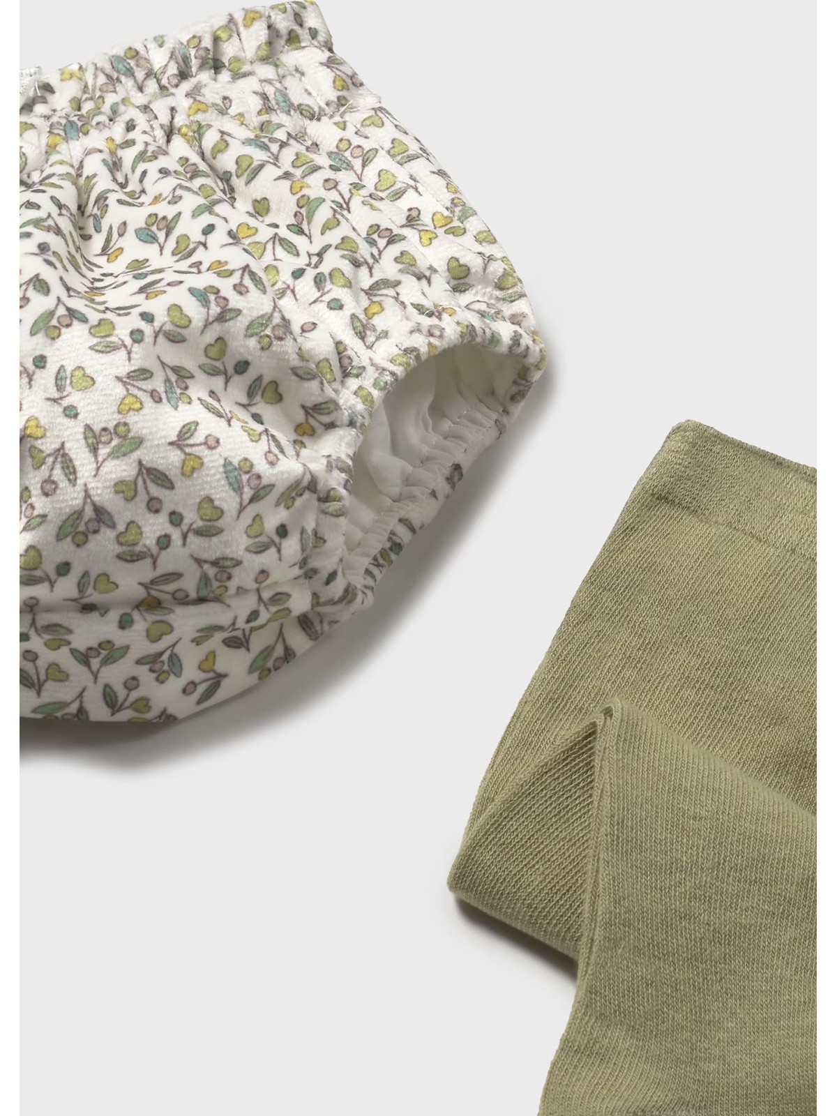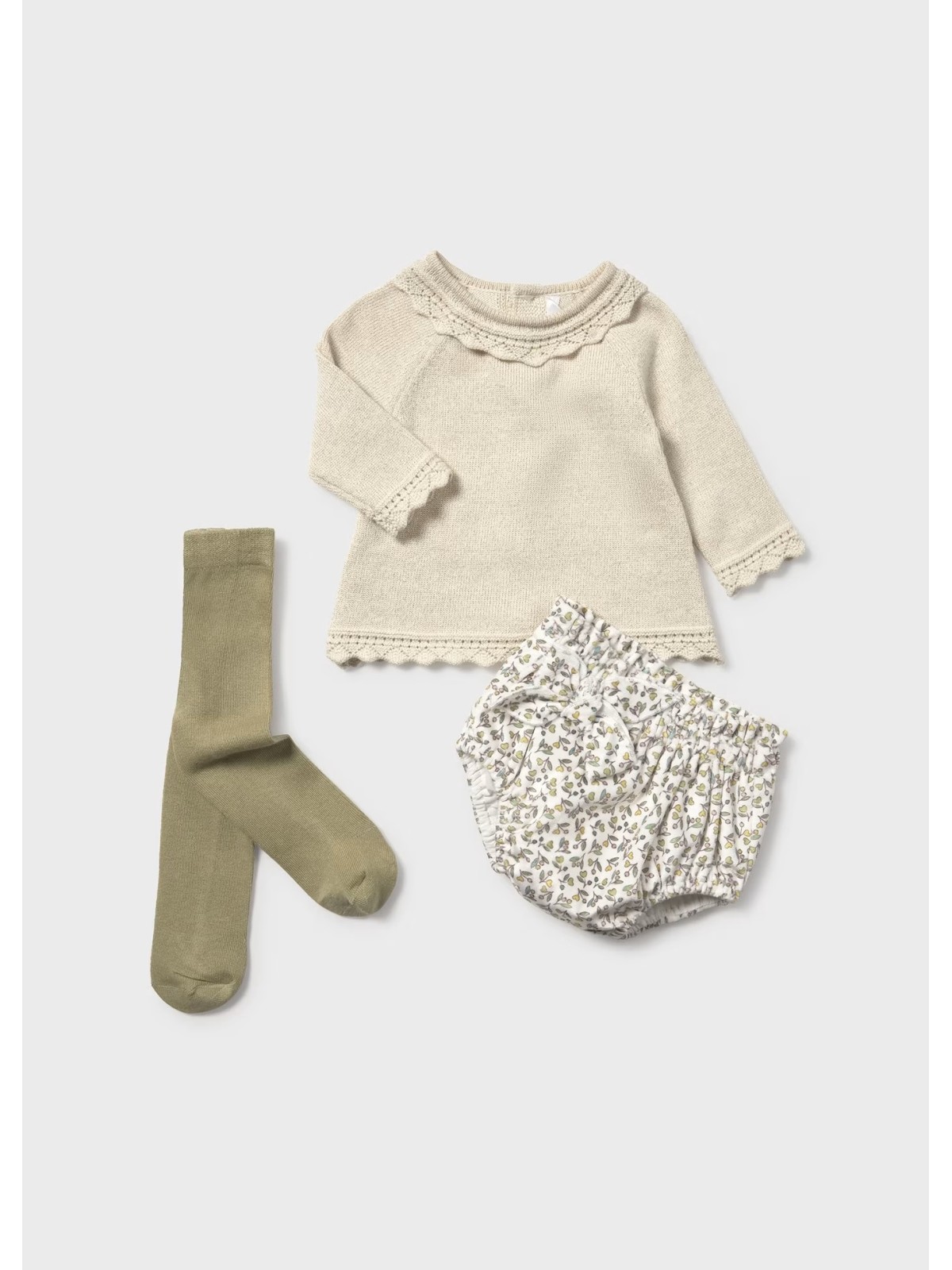 Originale completo per neonata tre pezzi. Maglione manica lunga per neonata. Girocollo con dettagli ton sur ton. Chiusura con bottoni sulla schiena per facilitare la vestibilità del capo. Shorts modello culotte che si abbina perfettamente ai look della tua piccola. Elastico in vita. Elementi decorativi: fiocco. Calzamaglia con trama spessa per neonata con vita elasticizzata per una migliore vestibilit