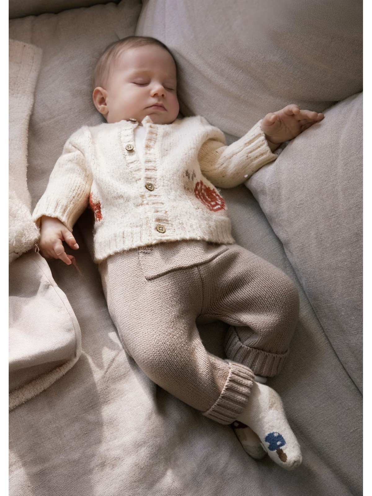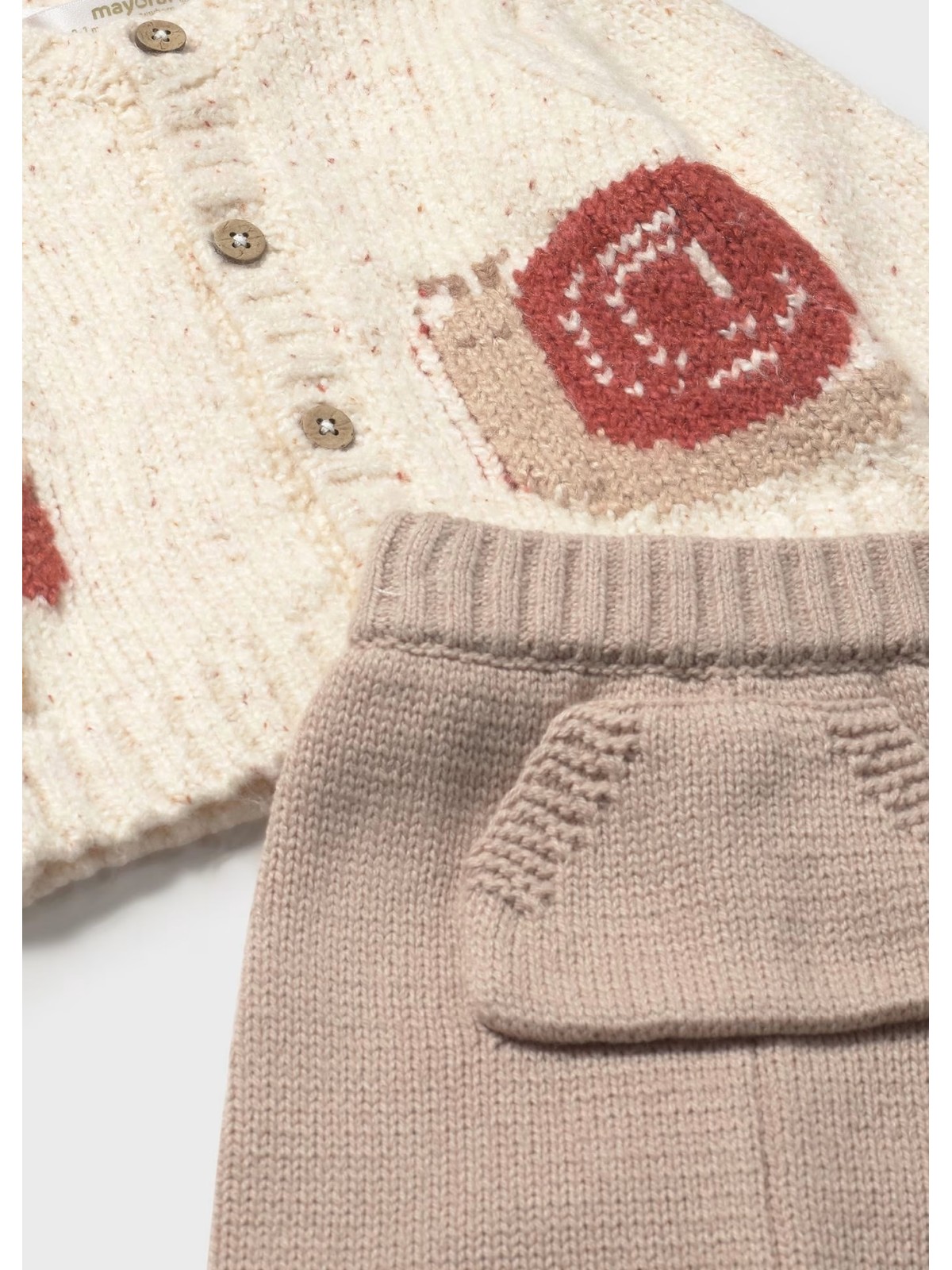 Originale completo unisex tre pezzi. Tessuto in tricot morbido al tatto. Giacca modello cardigan manica lunga per neonato. Girocollo. Chiusura con bottoni nella parte anteriore. Disegni in punto jacquard. Maglietta manica lunga per neonato. Girocollo. Bottone a pressione sul colletto per facilitare la vestibilità del capo. Pantalone per neonato. Elastico in vita. Tasca funzionale nella parte anteriore