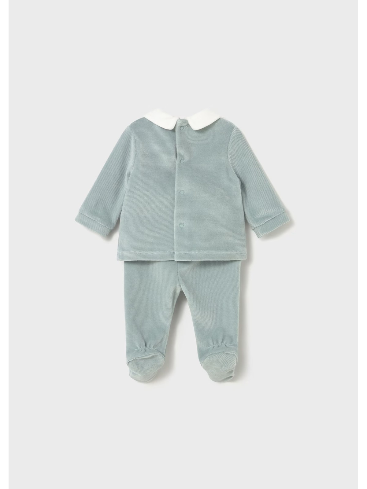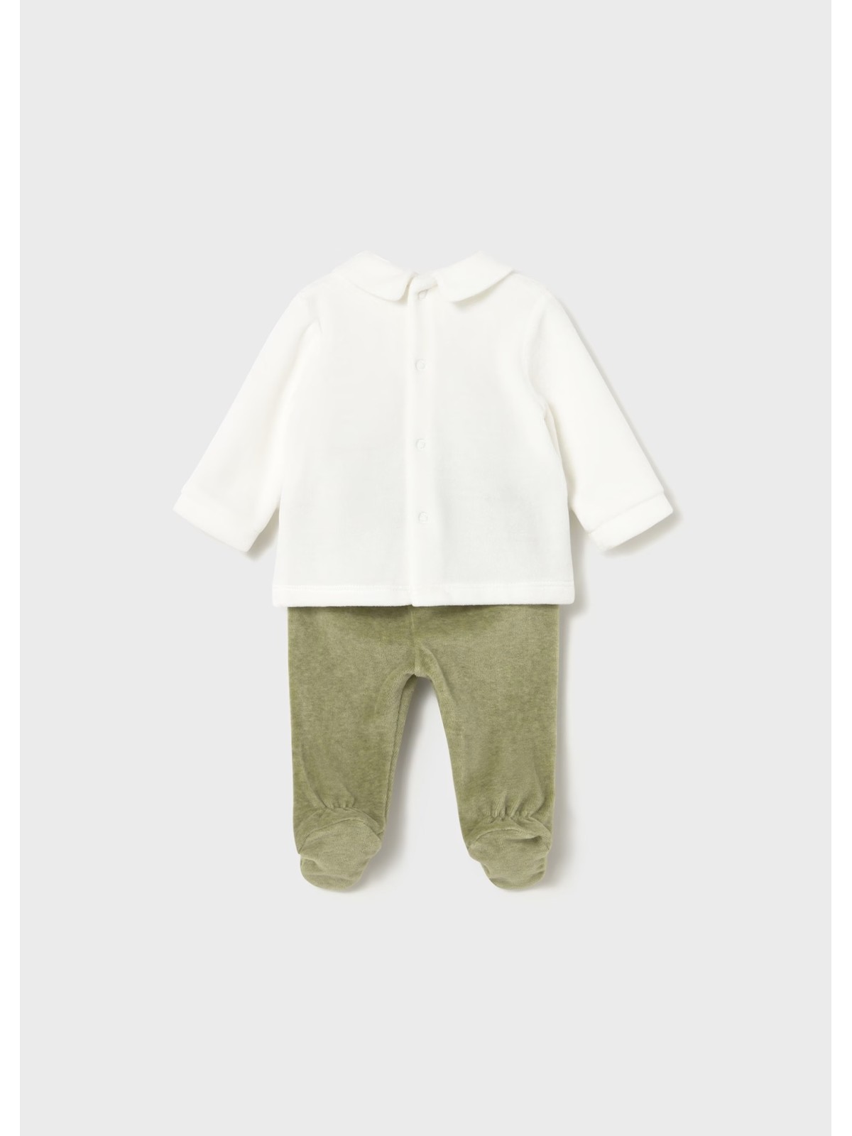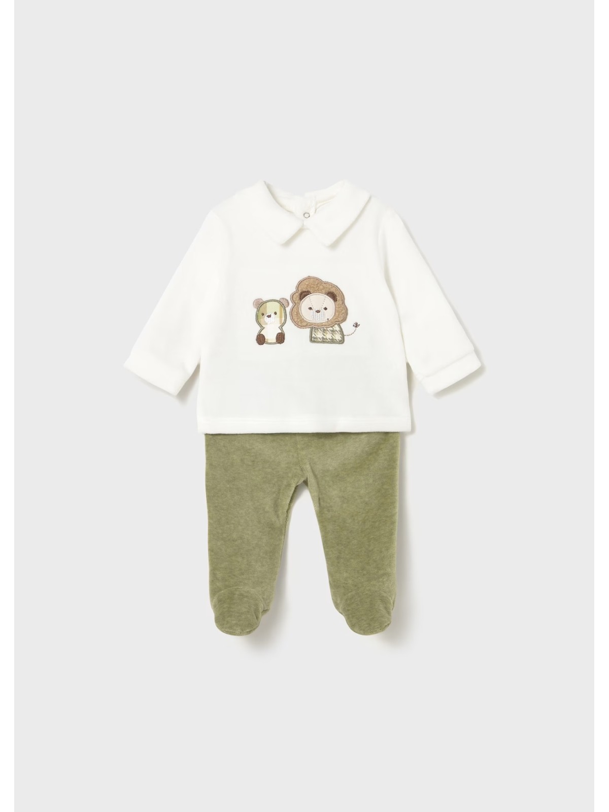 Questo completo per neonato in ciniglia è costituito da maglietta manica lunga con ghettina abbinata. Maglietta manica lunga per neonato. Colletto modello camicia. Chiusura con bottoni a pressione nella parte posteriore. Elementi decorativi: applicazione decorativa, ricamo, Serigrafia (print) Pantalone con piedi modello ghettina. Elastico in vita.