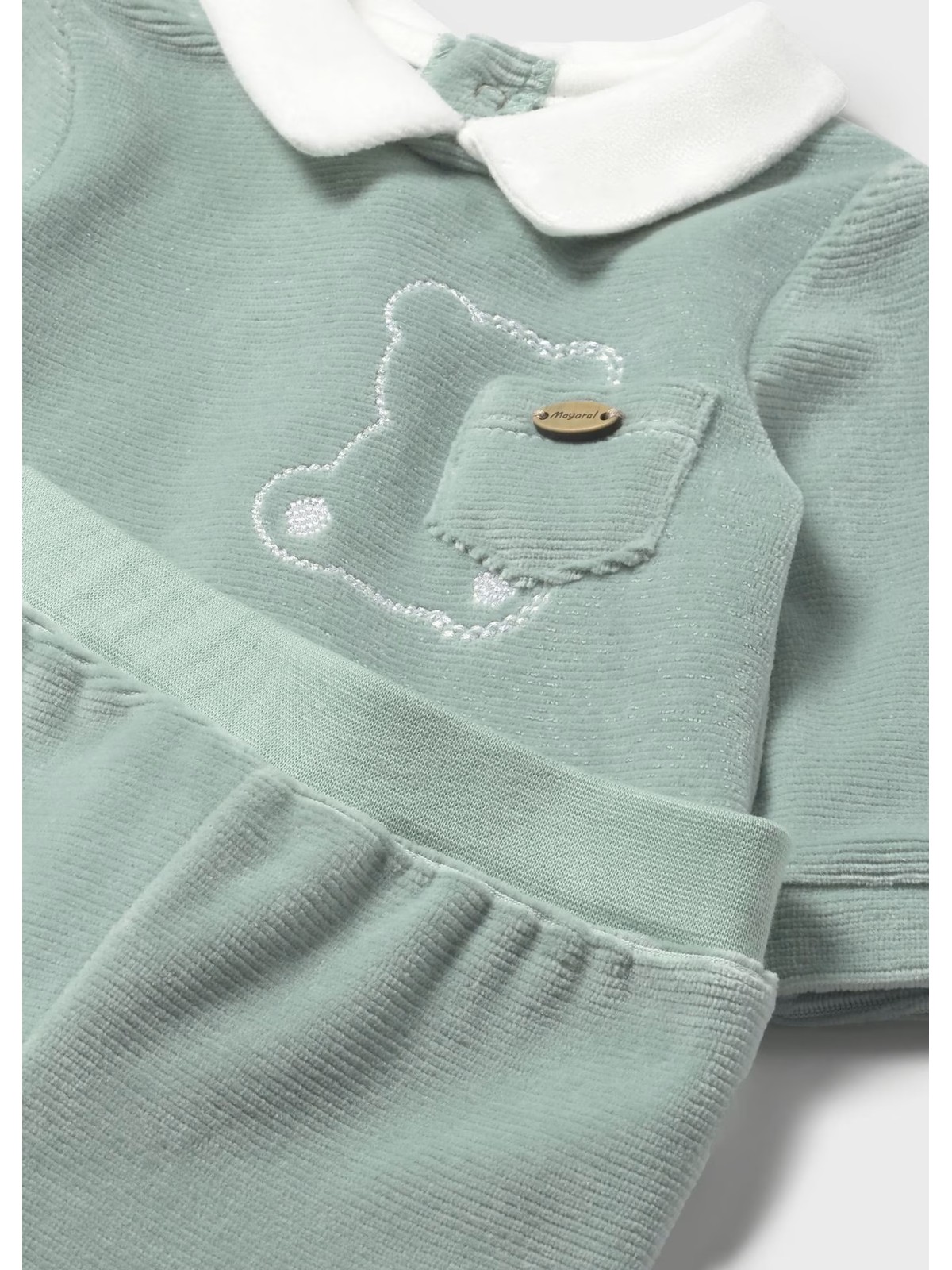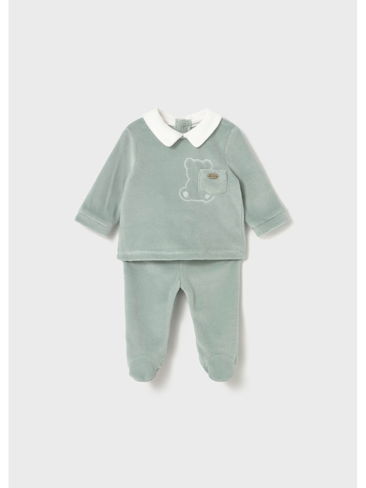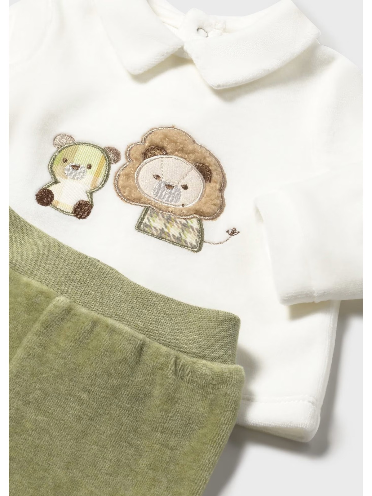 Questo completo per neonato in ciniglia è costituito da maglietta manica lunga con ghettina abbinata. Maglietta manica lunga per neonato. Colletto modello camicia. Chiusura con bottoni a pressione nella parte posteriore. Elementi decorativi: applicazione decorativa, ricamo, Serigrafia (print) Pantalone con piedi modello ghettina. Elastico in vita.