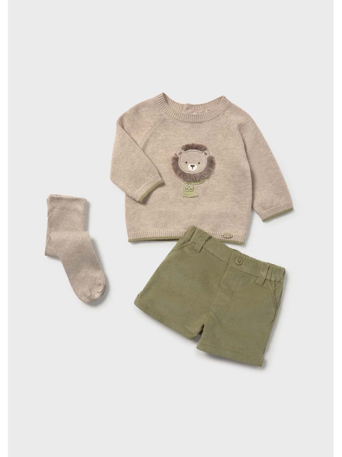 Questo completo tre pezzi per neonato è costituito da un delizioso maglioncino, un pantaloncino e una calzamaglia abbinata. Maglione manica lunga per neonato. Girocollo. Chiusura con bottoni a pressione sulla spalla che facilitano la vestibilità del capo. Elementi decorativi: ricami Pantalone corto per neonato. Chiusura con un unico bottone. Elastico in vita. Dettaglio con orlo con risvolto. Finte tasche anteriori decorative. Finte tasche posteriori decorative. Calzamaglia con trama spessa per neonato con vita elasticizzata per una migliore vestibilità.