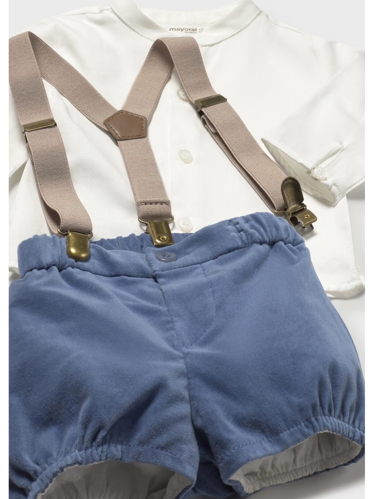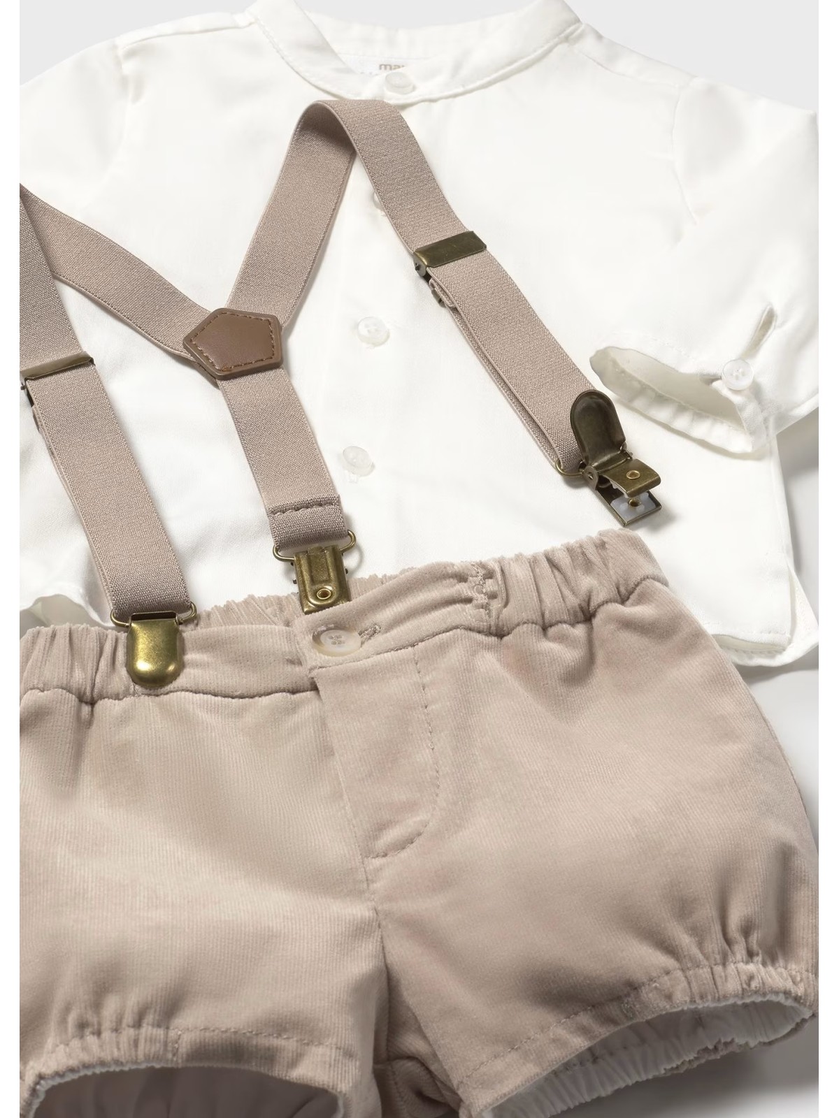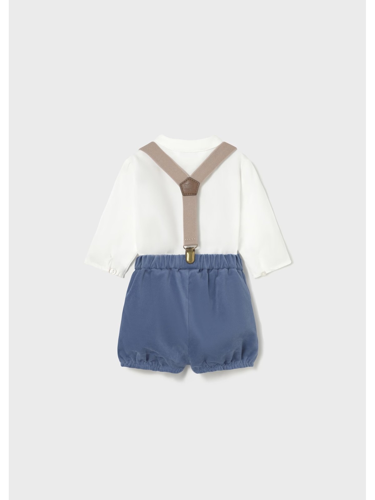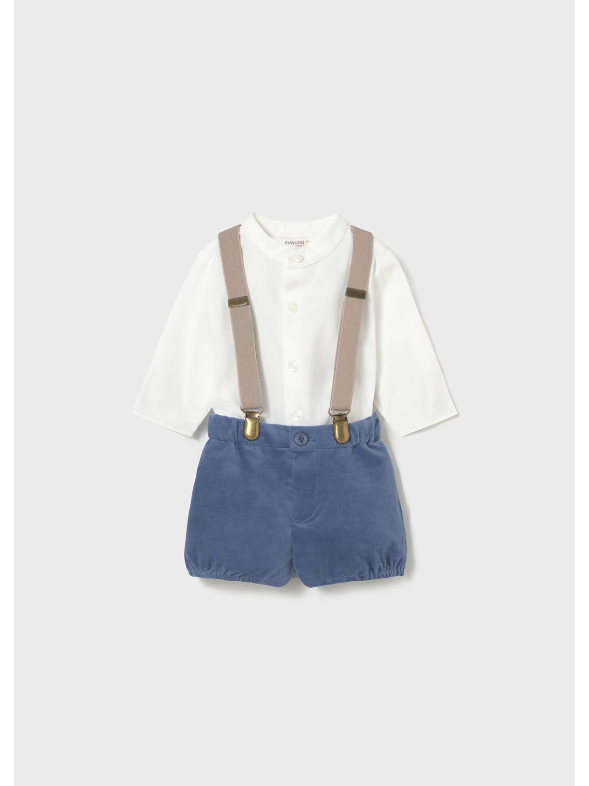 Completo per neonato costituito da camicia e salopette. Camicia manica lunga per neonato. Modello con colletto alla coreana ton sur ton. Chiusura con bottoni nella parte anteriore. Pantalone corto per neonato. Chiusura con un unico bottone. Elastico in vita. Orlo elasticizzato per una migliore vestibilità. Bretelle elasticizzate regolabili per neonato che consentono una perfetta aderenza.